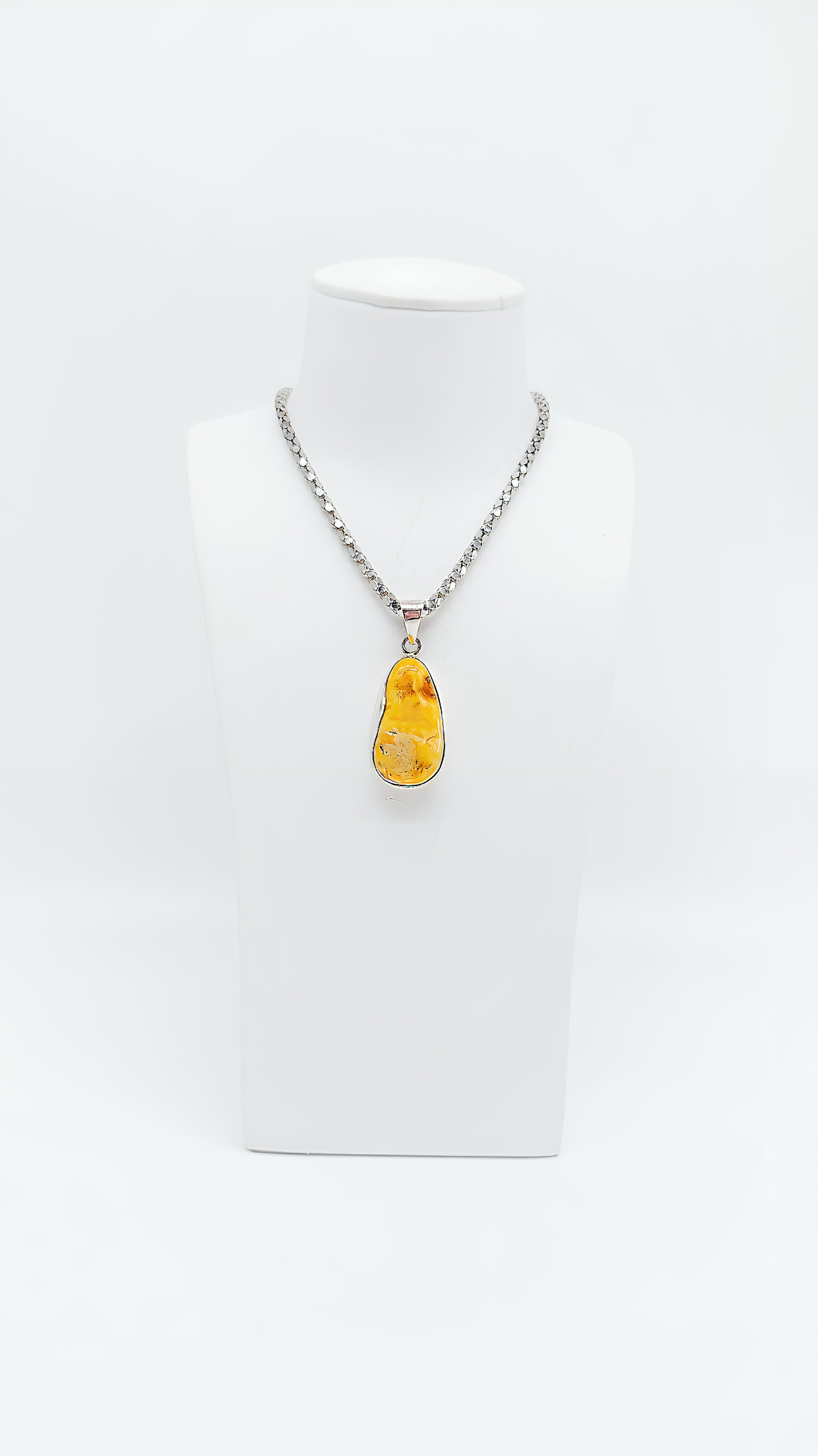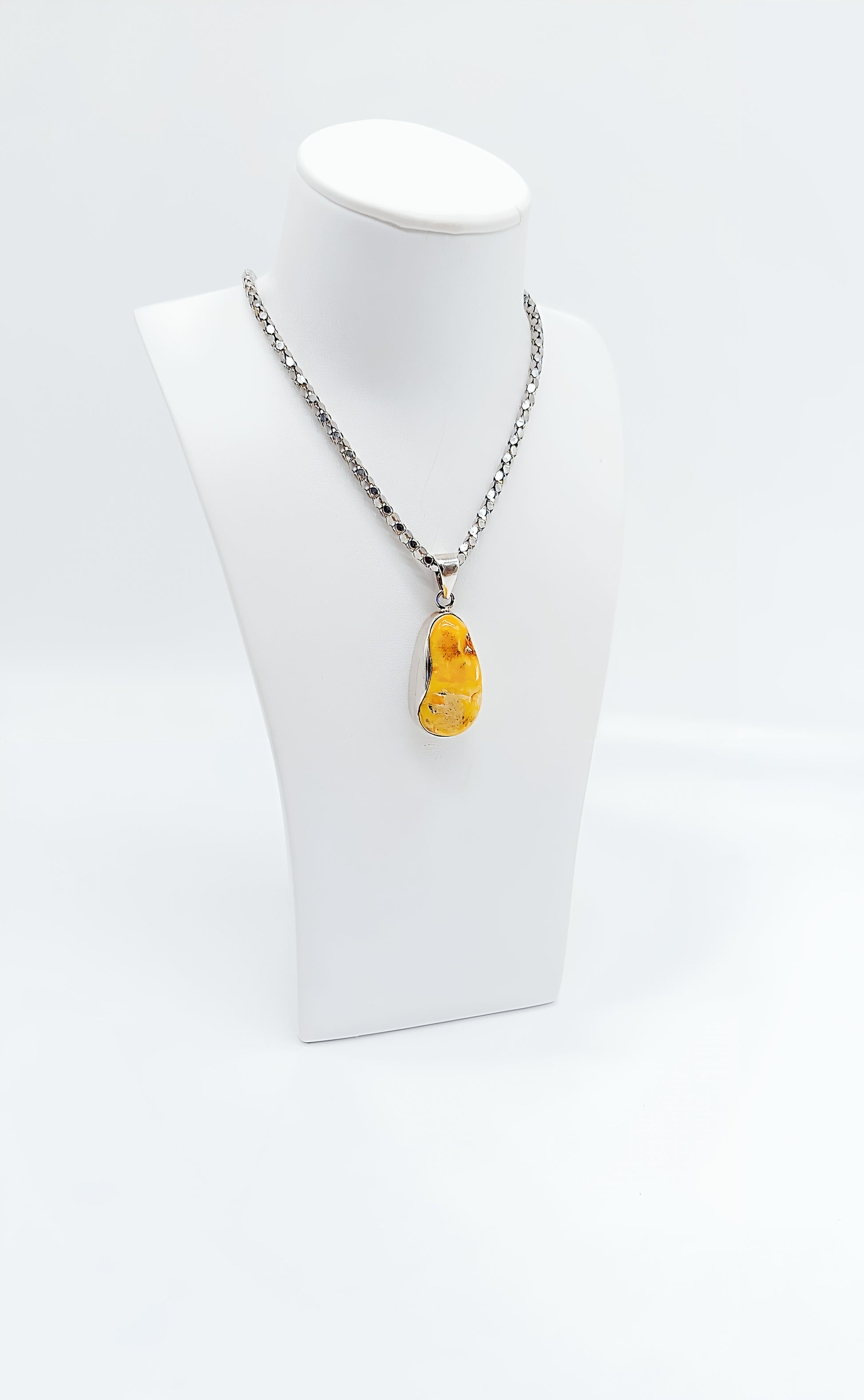 This extraordinary amber pendant in 925 sterling silver is truly one of a kind. The honey-colored amber shimmers in warm, golden tones and is shaped by nature, making it a unique work of art. The pendant is perfect for people who love natural jewelry and value individuality. Whether as a personal accessory or as a special gift, this amber pendant adds a warm, elegant touch to any outfit. It's ideal for nature lovers, trendsetters, or simply as a reminder of the power and beauty of nature. A great gift for anniversaries, birthdays, or as a special token of affection.