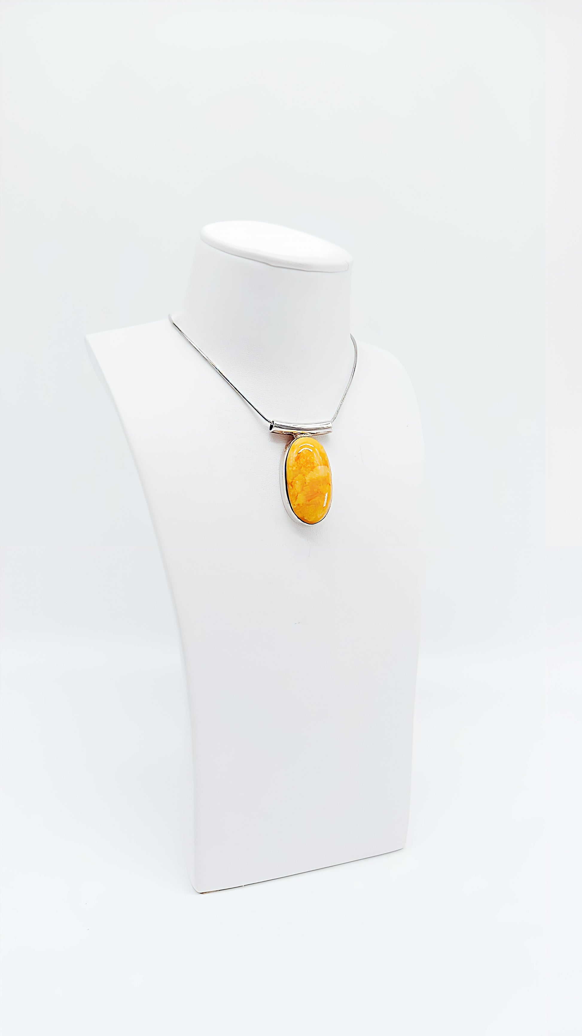 This unique amber pendant crafted from 925 sterling silver captivates with its vibrant, sunny yellow color and oval shape, making it a true eye-catcher. The warm glow of the amber harmonizes perfectly with the cool silver, creating a fascinating balance between nature and elegance. Ideal for women who want to emphasize their style with an extraordinary yet understated piece of jewelry. This pendant makes a perfect gift for lovers of natural materials or as a special gift for occasions such as birthdays, anniversaries, or holidays. A piece of jewelry that adds a special touch to any wardrobe.