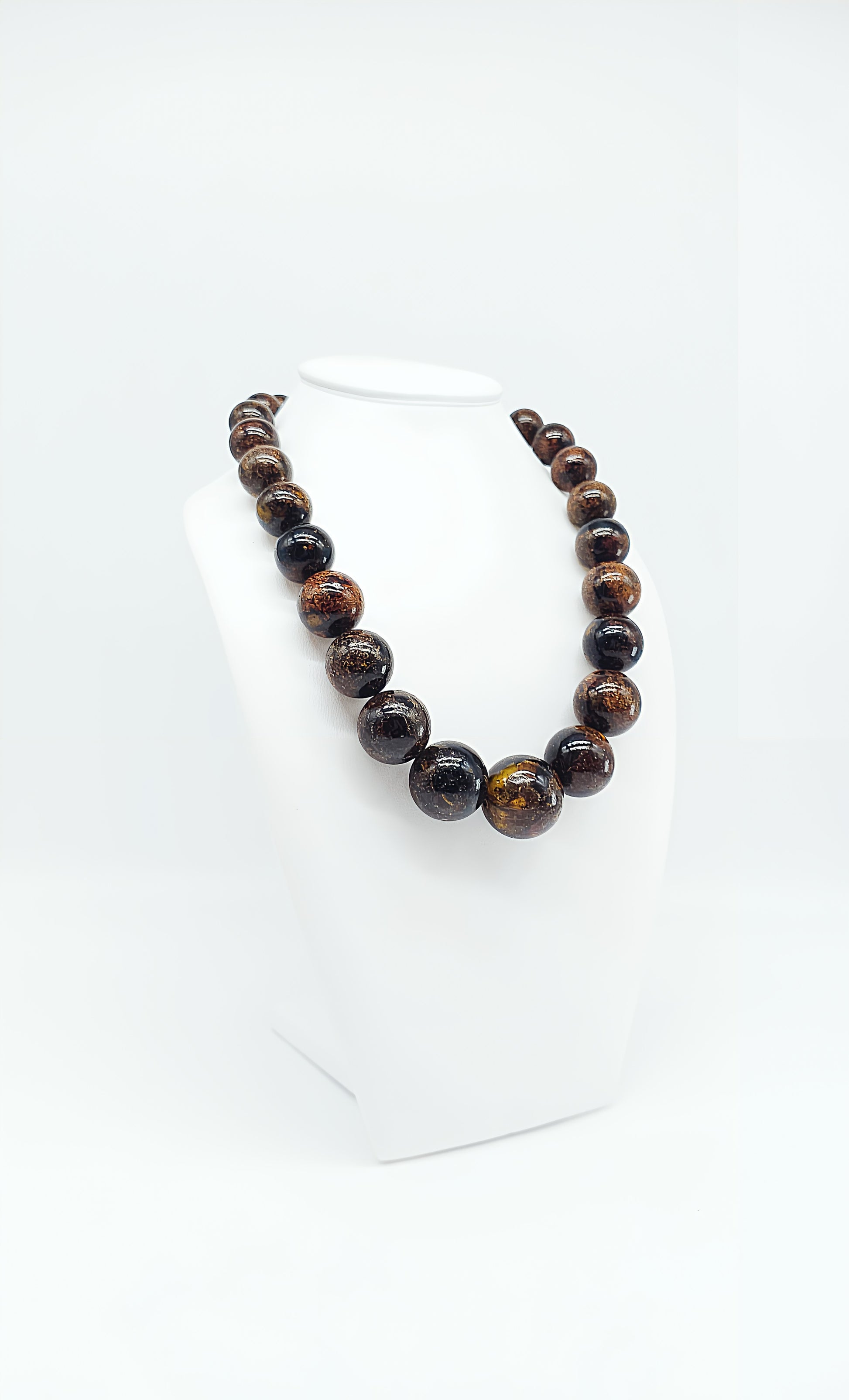 This exclusive amber necklace captivates with its large, round natural amber beads, shimmering in warm earth tones. Each bead is carefully polished and features unique inclusions that highlight the natural character of the amber. The elegant design adds a sophisticated touch to any outfit, perfect for women with a sense of style and exclusivity. This necklace is perfect for special occasions or as a high-quality gift for lovers of precious natural stones. A timeless piece of jewelry that combines elegance and nature in perfect harmony.