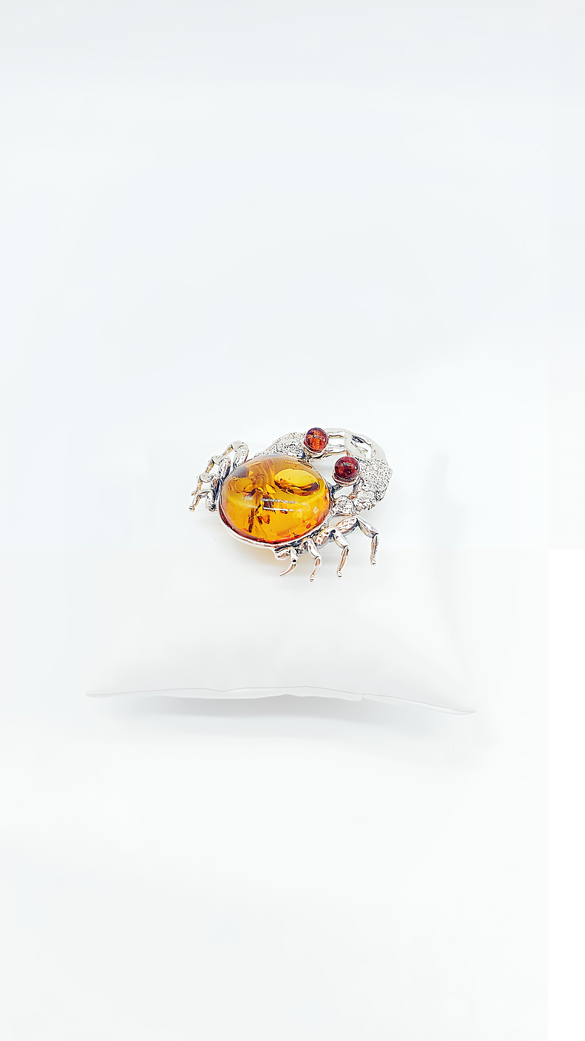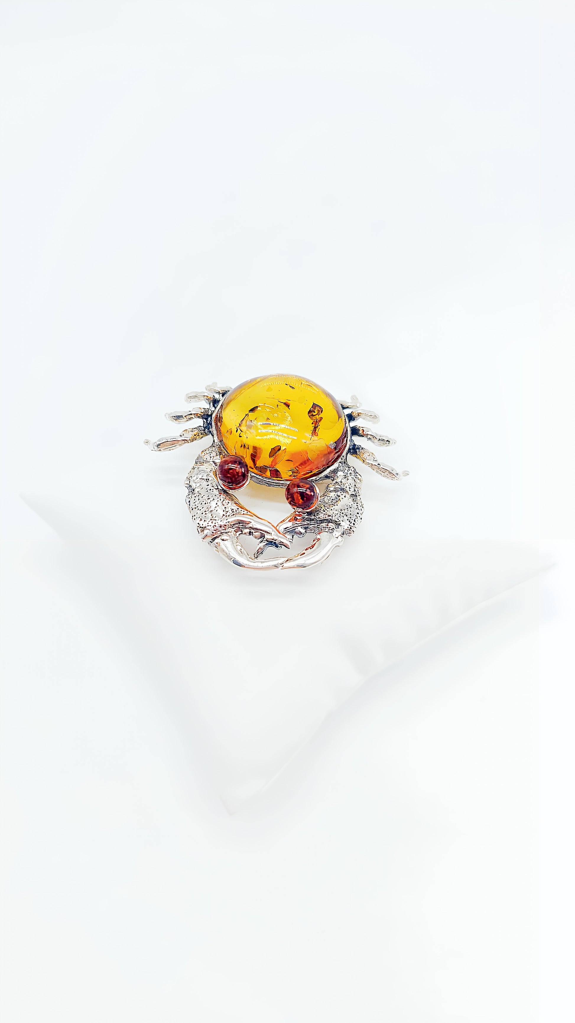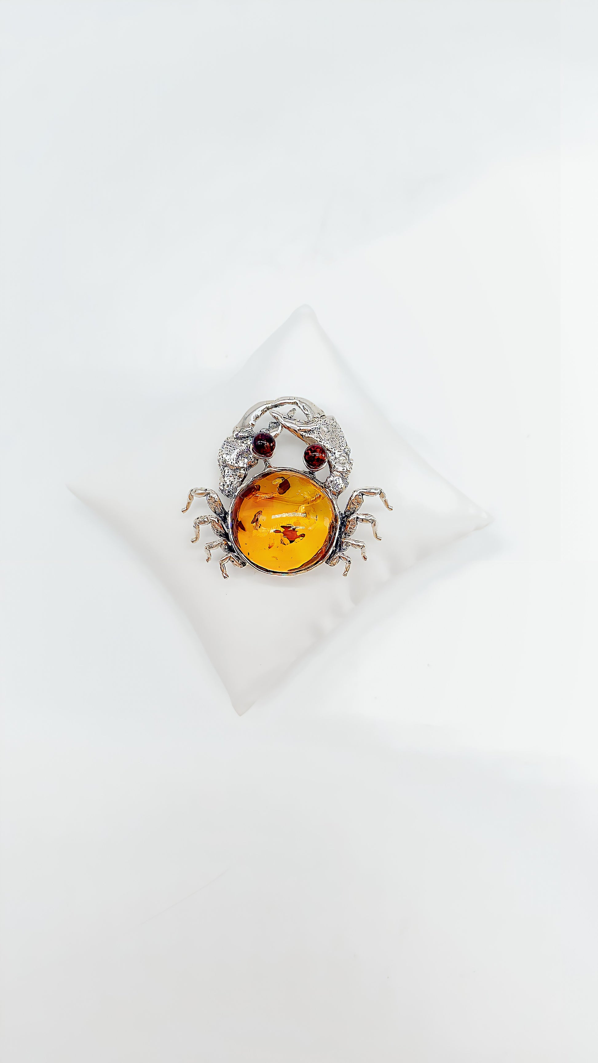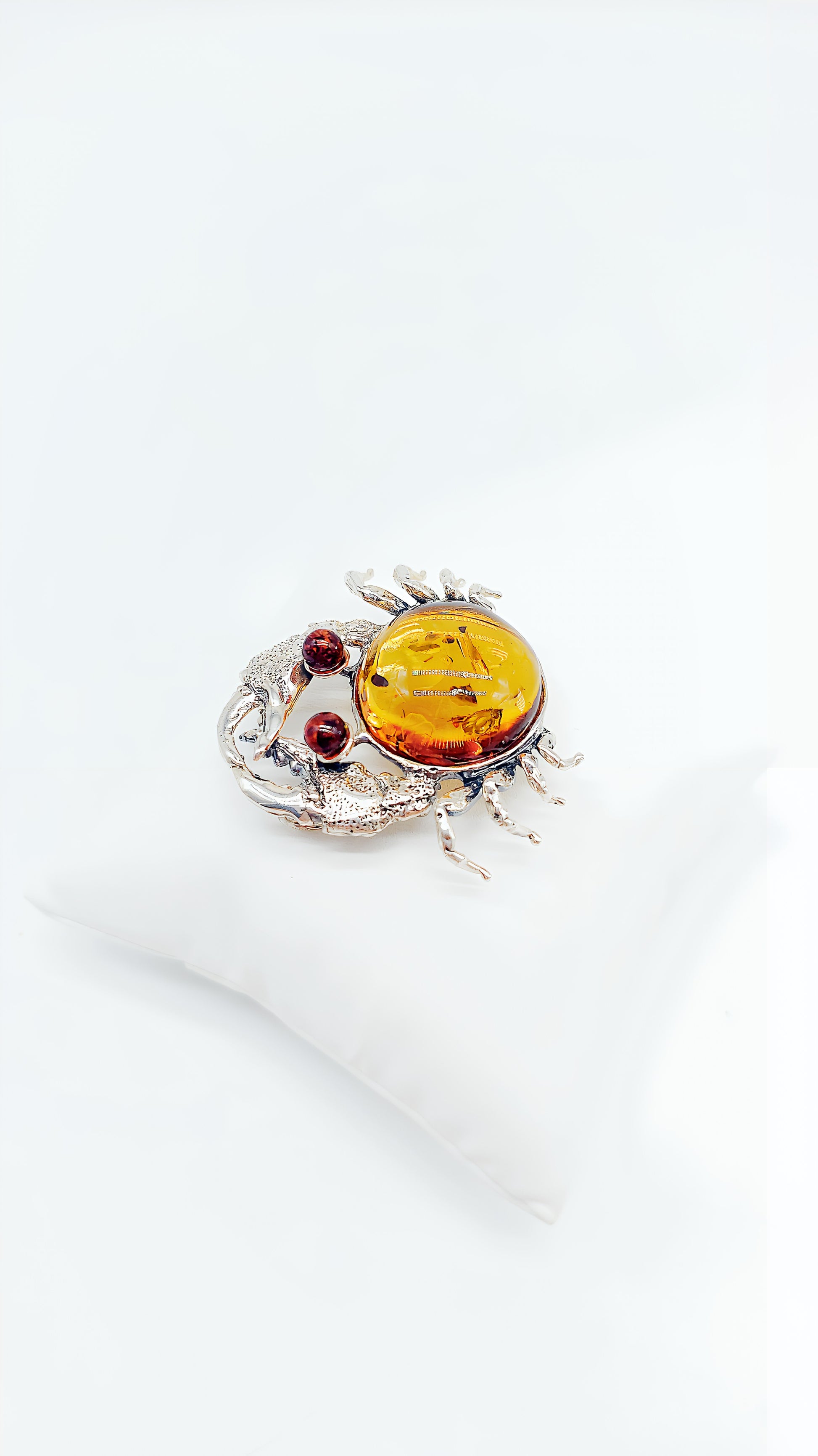 This extraordinary crab-shaped brooch is crafted from 925 sterling silver and enhanced with a beautiful, luminous amber cabochon. The meticulous details and unique design make this piece a true eye-catcher—perfect for anyone who loves the sea and wants to accentuate their style with a special touch. The round, deep red eyes, made of small gemstones, underscore the crab's charm and give it a vibrant expression. This brooch is an ideal gift for sea lovers, Cancerians, or those who appreciate unusual accessories.