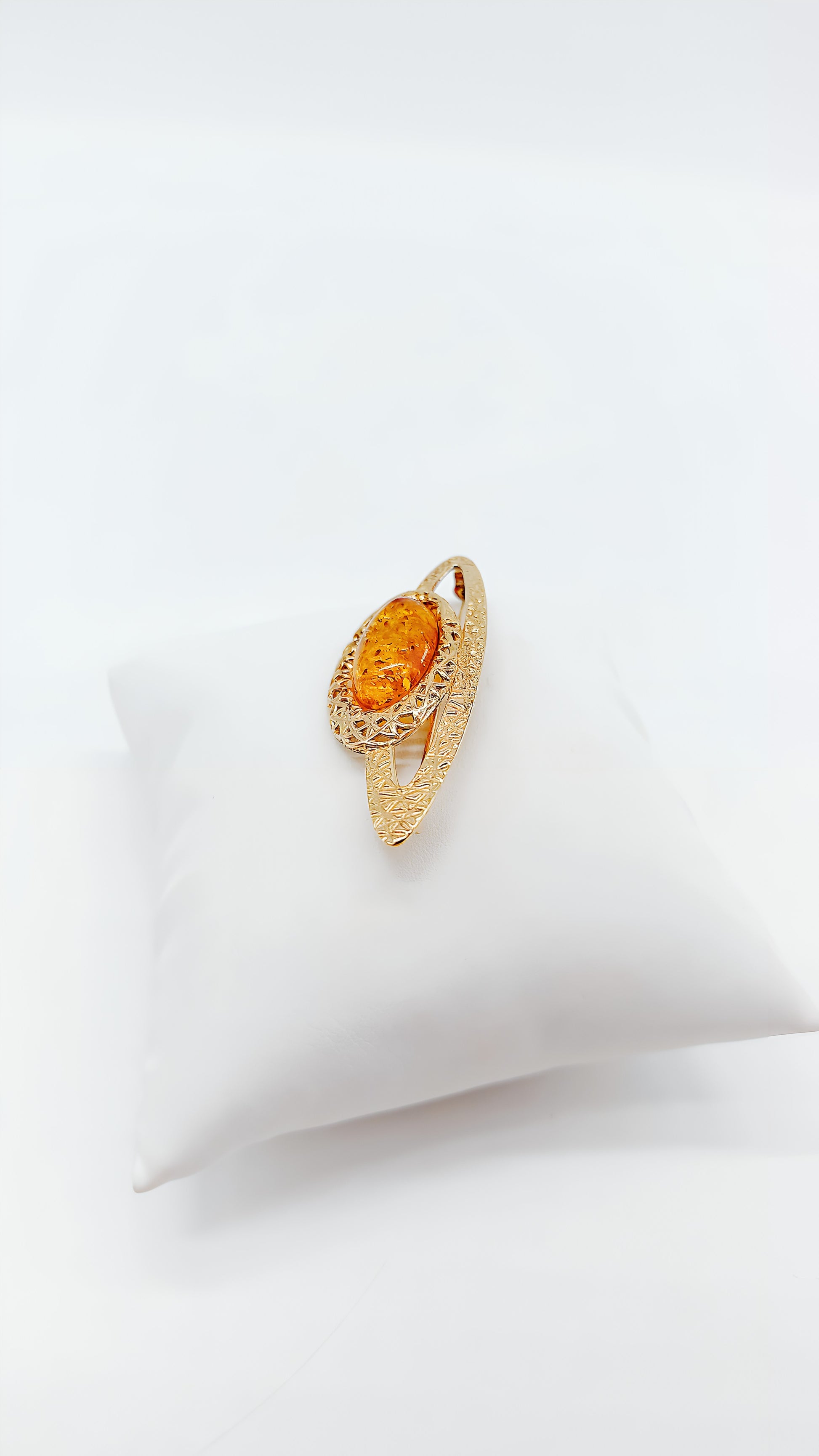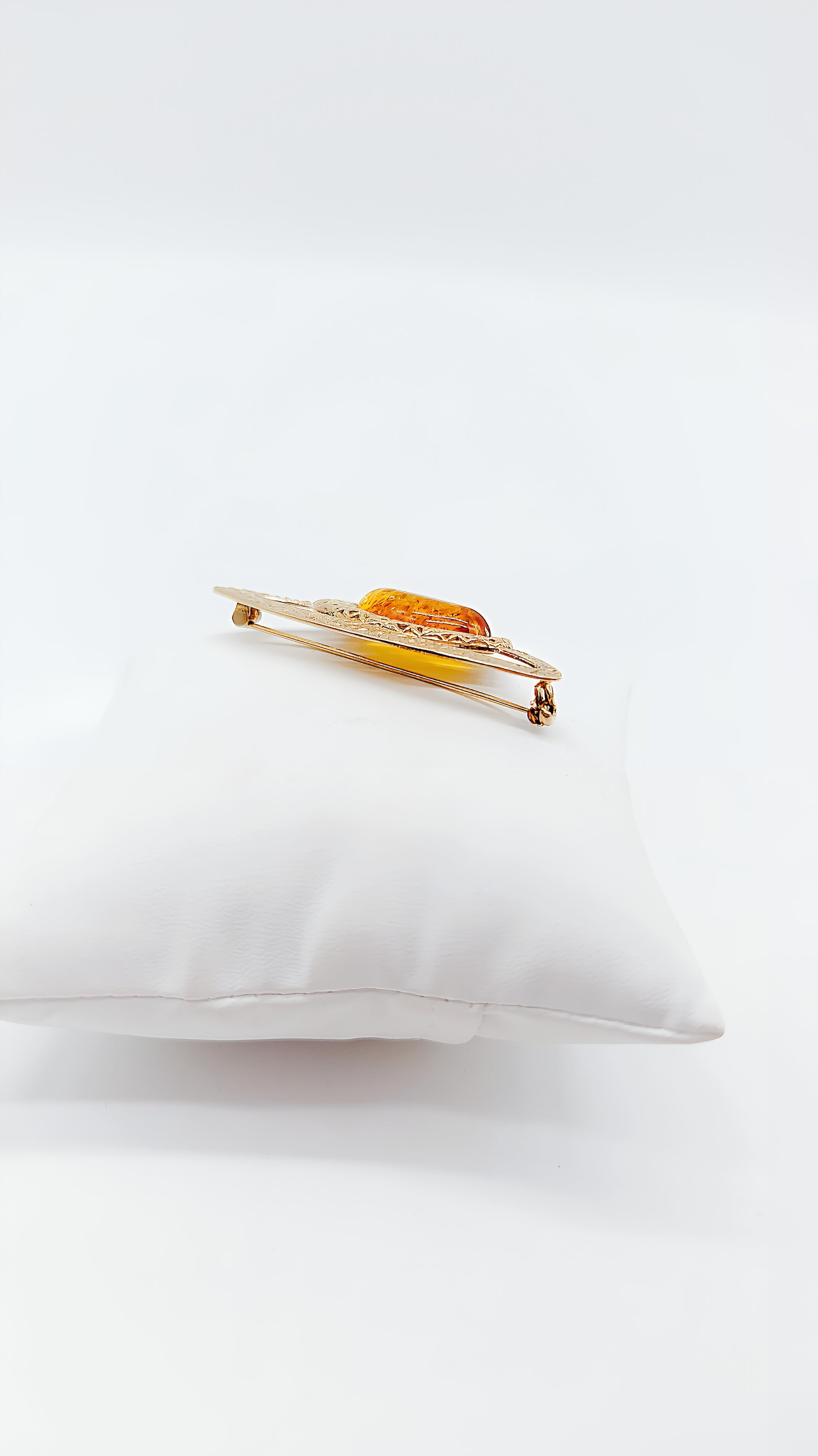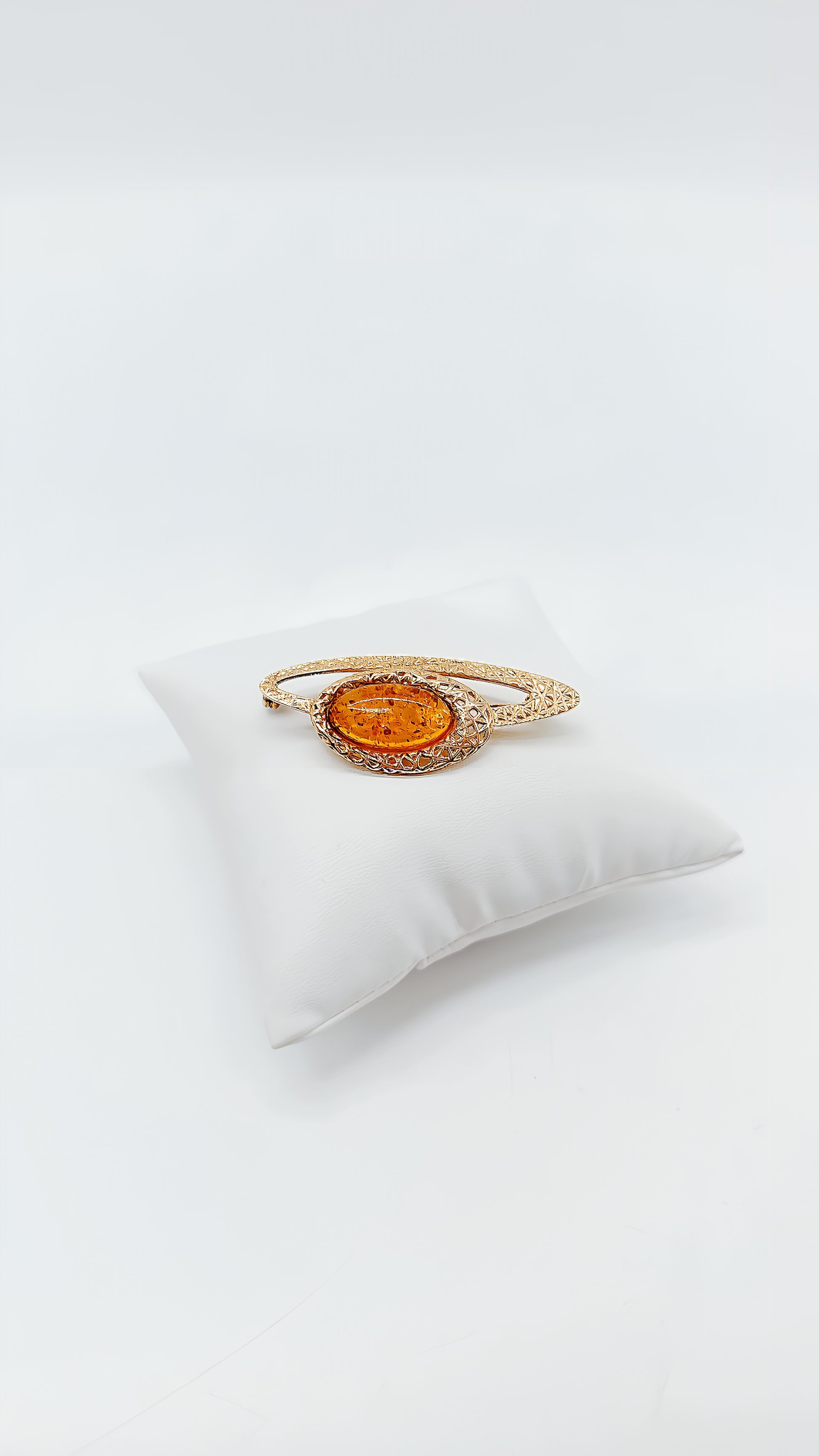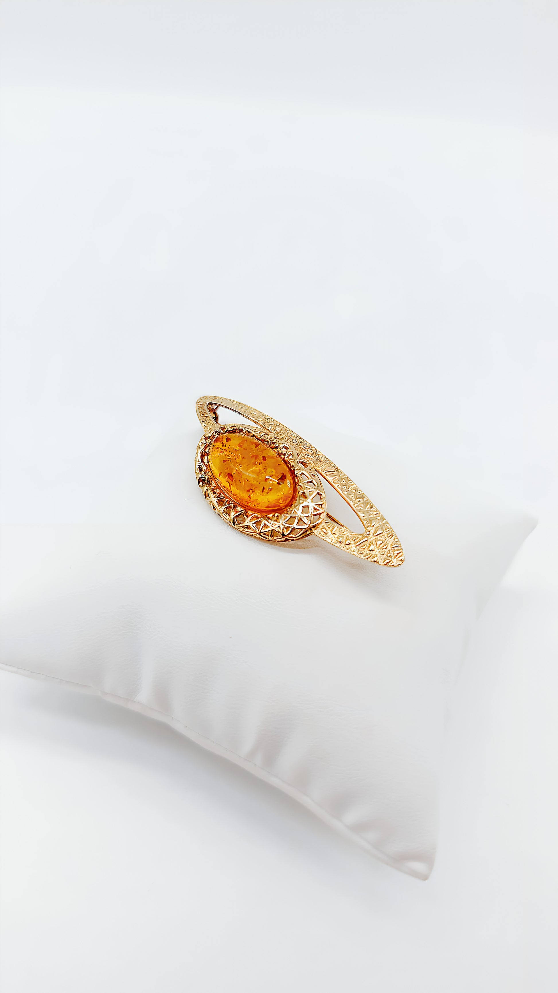 This elegant brooch, crafted from gold-plated 925 sterling silver, is a true masterpiece of craftsmanship. A magnificent amber stone sits at its center, framed by a delicate, gold-plated silver frame in an ornamental style. The artistic design makes this brooch a truly unique piece that perfectly complements both classic and modern outfits. The warm, golden sheen of the metal harmonizes perfectly with the natural shades of the amber, lending your style a timeless elegance. A must-have for lovers of fine jewelry.