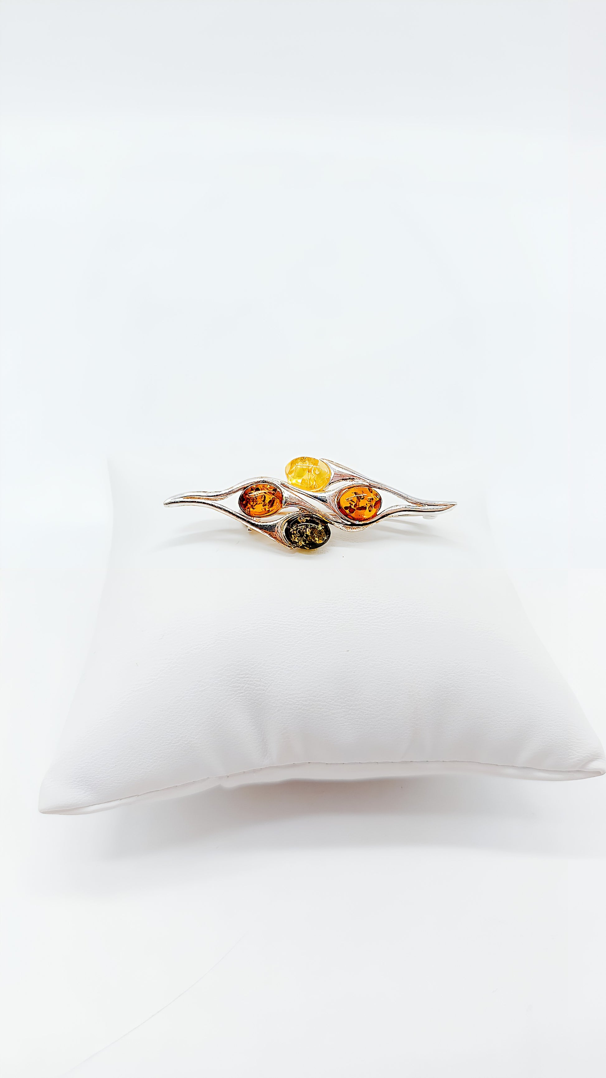 This ornate amber brooch crafted from 925 sterling silver combines timeless elegance with natural beauty. The brooch is adorned with several genuine amber stones in warm hues that beautifully reflect the light. The curved design lends the piece a stylish and feminine touch.
