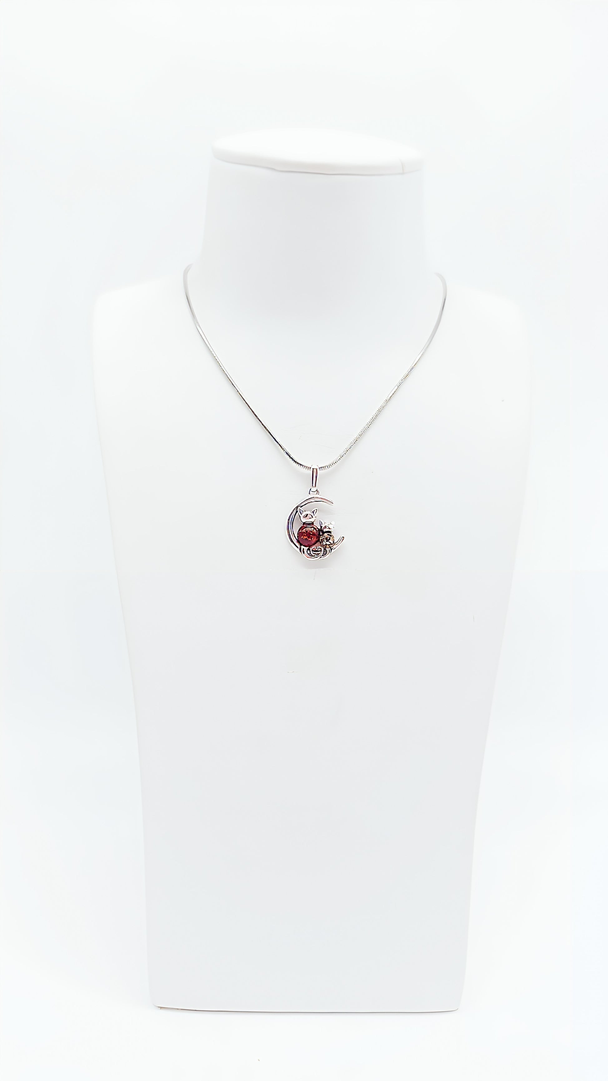 This unique pendant made of 925 sterling silver with sparkling amber is a must-have for cat lovers and jewelry connoisseurs. The charming design features two sweet cats sitting on a crescent moon while holding a soft cognac and honey-colored amber. The amber, known for its calming and protective properties, perfectly complements the precious silver. This pendant is ideal for women of all ages who appreciate cats and timeless elegance. It makes a particularly good gift for birthdays, anniversaries, or as a token of love and affection.