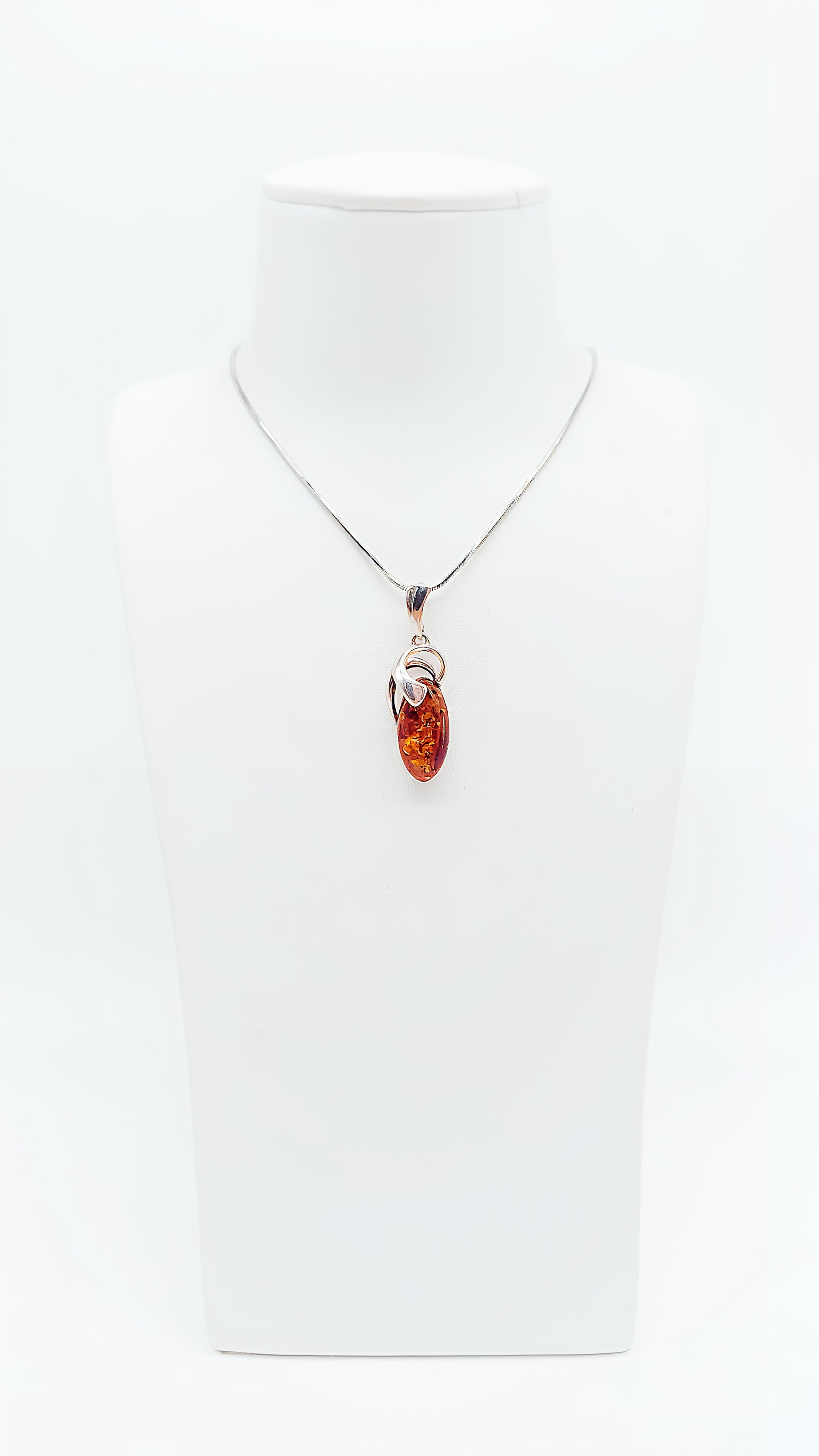 This pendant impressively combines the warm glow of orange amber with the flowing elegance of 925 sterling silver. The artistic, curved frame harmoniously embraces the oval amber, lending the piece an organic, natural grace. The amber radiates a warm orange and is reminiscent of the power and beauty of nature. Amber traditionally stands for good luck, protection, and positive energy. This pendant is therefore not only a beautiful piece of jewelry, but also a symbol of joie de vivre. Whether as a gift or as a special accessory for yourself – this pendant is the perfect choice for women who value timeless elegance and naturalness in their jewelry.