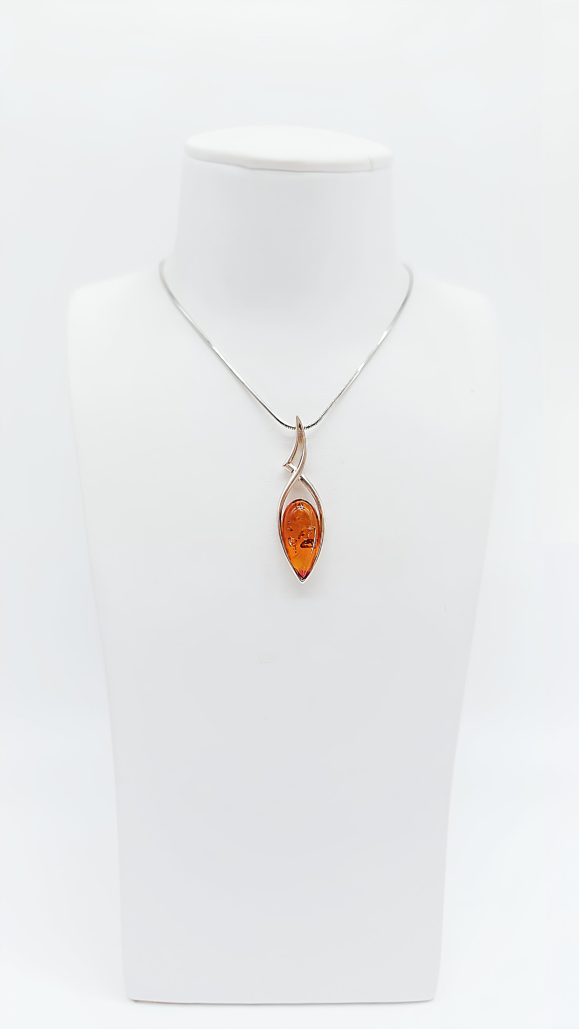 This stunning pendant combines the warmth of orange amber with the cool elegance of 925 Sterling silver. The delicate setting encircles the drop-shaped amber in a dynamic, curved form that perfectly showcases the stone's vibrancy. The amber radiates a warm, natural glow, making this pendant a piece of jewelry suitable for any occasion. Amber is considered a stone of joy and energy and is a symbol of protection and well-being. This pendant is not only an elegant accessory, but also a wonderful gift for someone important to you, or a special piece for your own jewelry collection. Perfect for special occasions or to add a touch of elegance to everyday wear.
