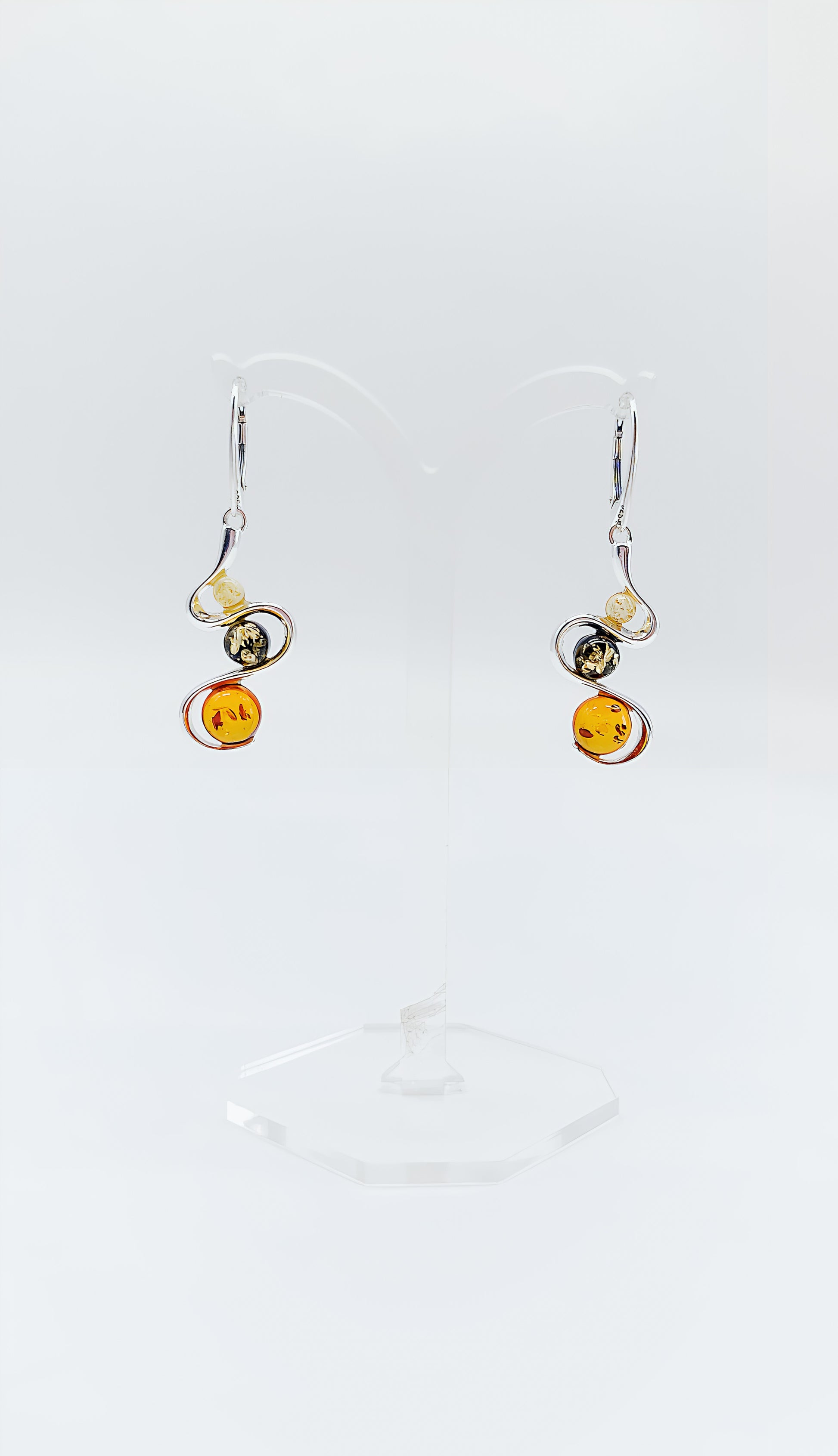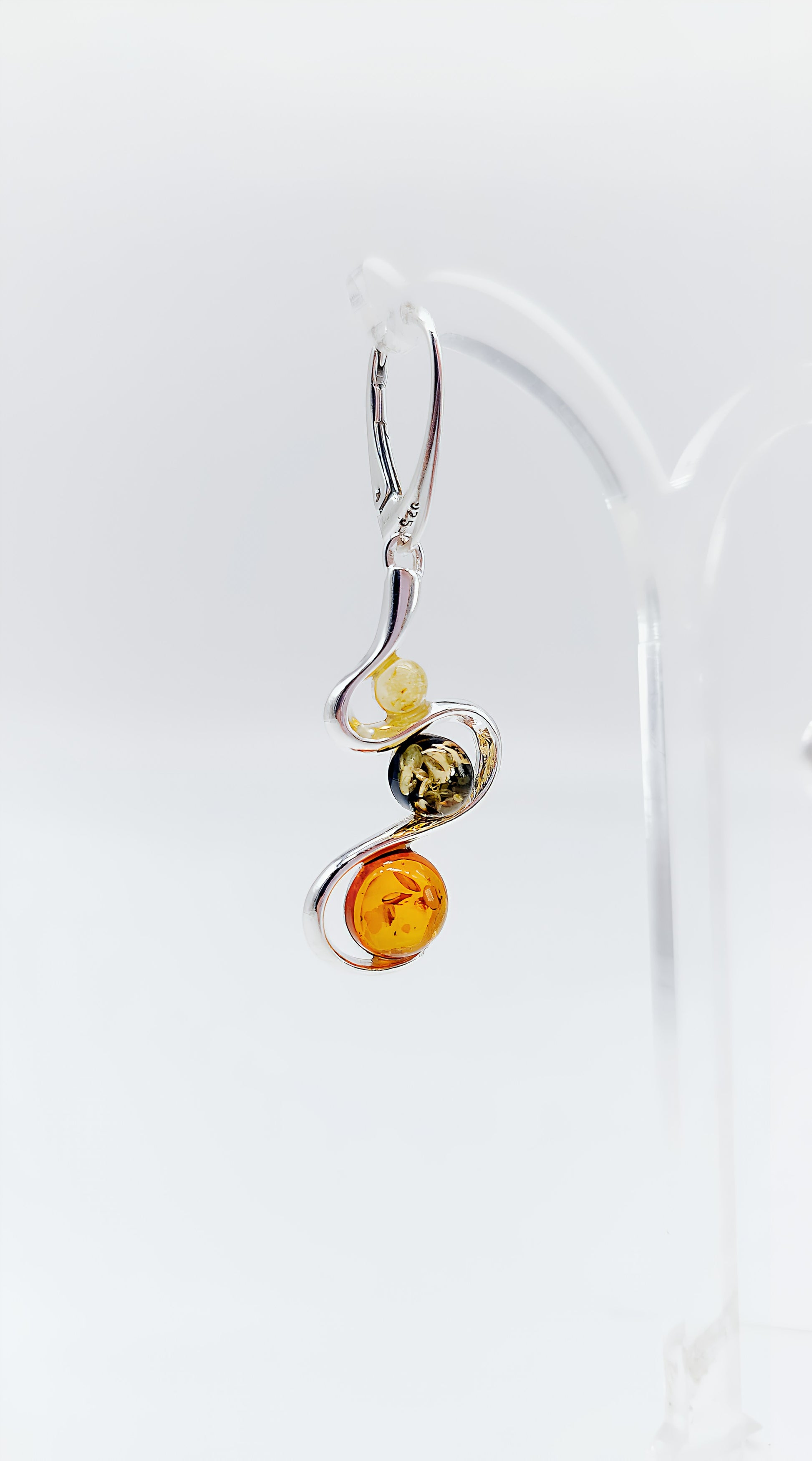 These artistic earrings, crafted from 925 sterling silver and three different-colored amber stones, combine elegance and nature in an extraordinary design. The warm tones of the yellow, green, and cognac-colored amber, set in a curved silver frame, create a unique eye-catcher with every movement. The playful shape of the earrings emphasizes the natural charm of the stones while adding a modern touch. Ideal for women who like to incorporate color into their style and appreciate unique jewelry. These earrings are a perfect gift for any occasion—they bring elegance and lightness to any look.