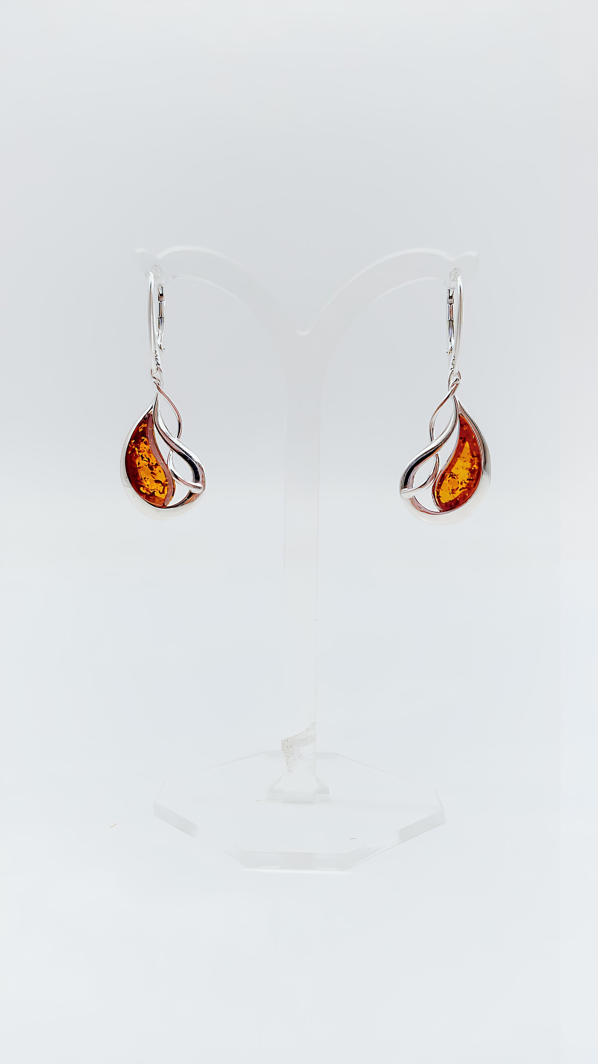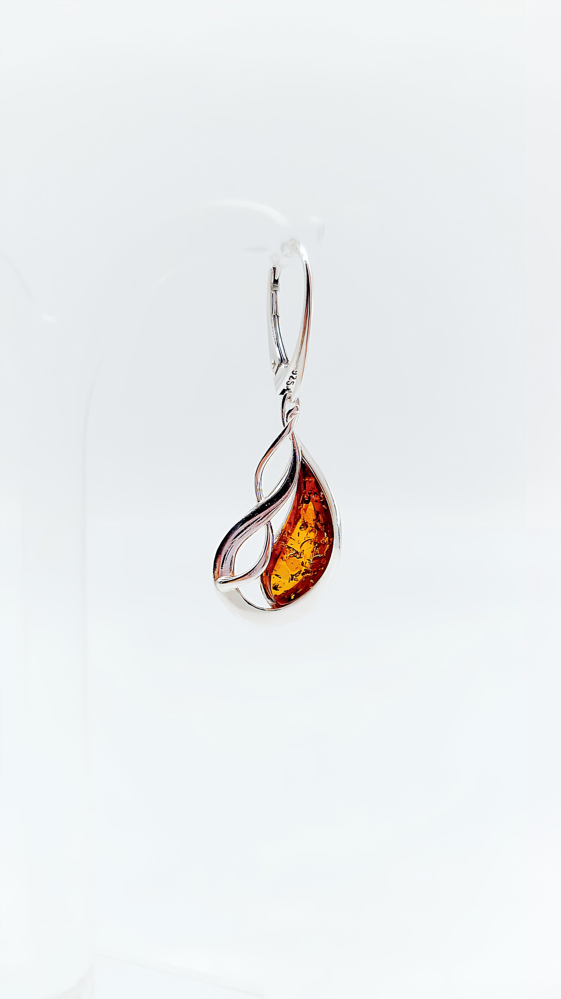 These stunning dangle earrings are crafted from 925 sterling silver and feature a drop of genuine amber in an elegant spiral setting. The flowing silver lines frame the warm, amber-colored stone, giving these earrings a modern and stylish look. Perfect for everyday wear and special occasions, they add a touch of elegance and nature to any outfit.