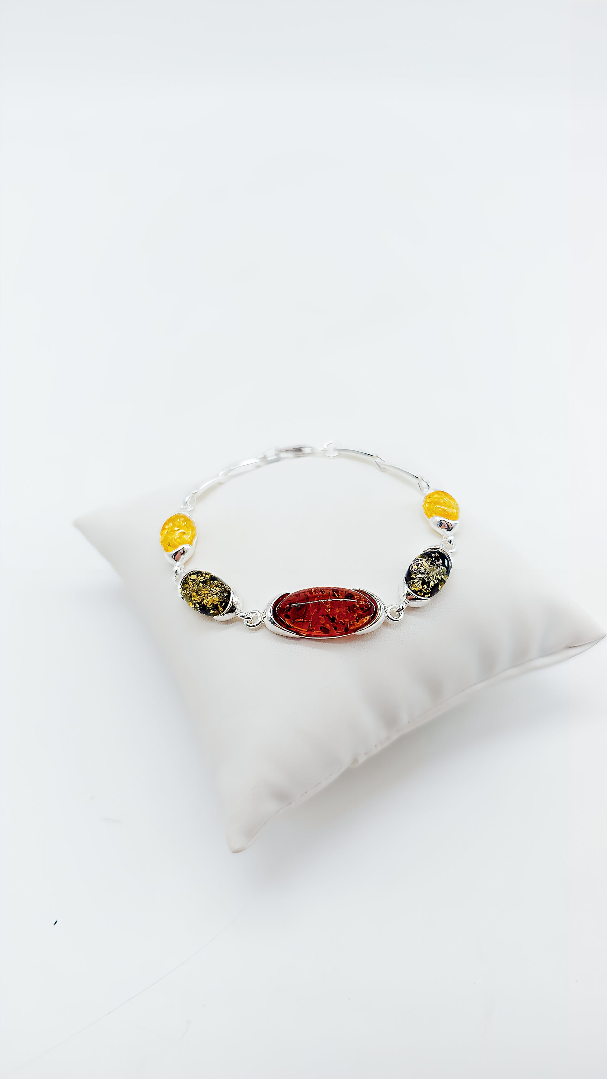 This elegant 925 sterling silver bracelet features captivating amber stones in a variety of shades—from deep red to bright yellow to shimmering green. The combination of silver and the warm, vibrant colors of the amber makes this bracelet a true eye-catcher. It's perfect for women who enjoy adding color accents and want to reflect nature in their jewelry. A versatile piece of jewelry for special occasions or everyday wear. Ideal as a gift for fashion-conscious nature lovers.