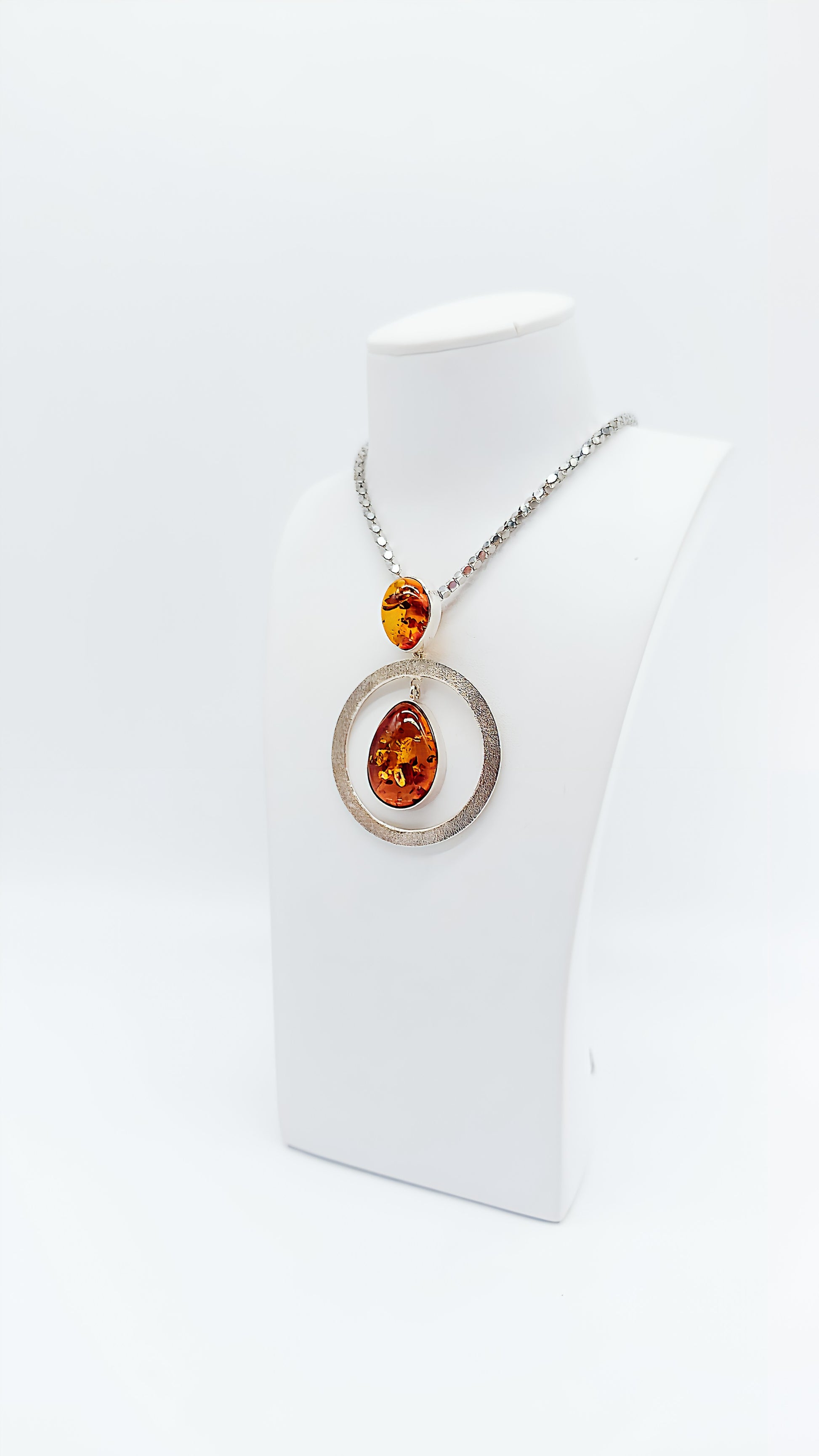 This stunning 925 sterling silver pendant is truly unique. Two perfectly formed amber stones, one teardrop-shaped and one oval, are set in an artfully crafted silver frame. The modern circle in the center lends the pendant a timeless elegance, while the warm tones of the amber radiate natural beauty. This piece of jewelry is ideal for women who value uniqueness and style. It's suitable for special occasions as well as a fashionable everyday highlight. A perfect gift for anyone who loves exclusive jewelry.