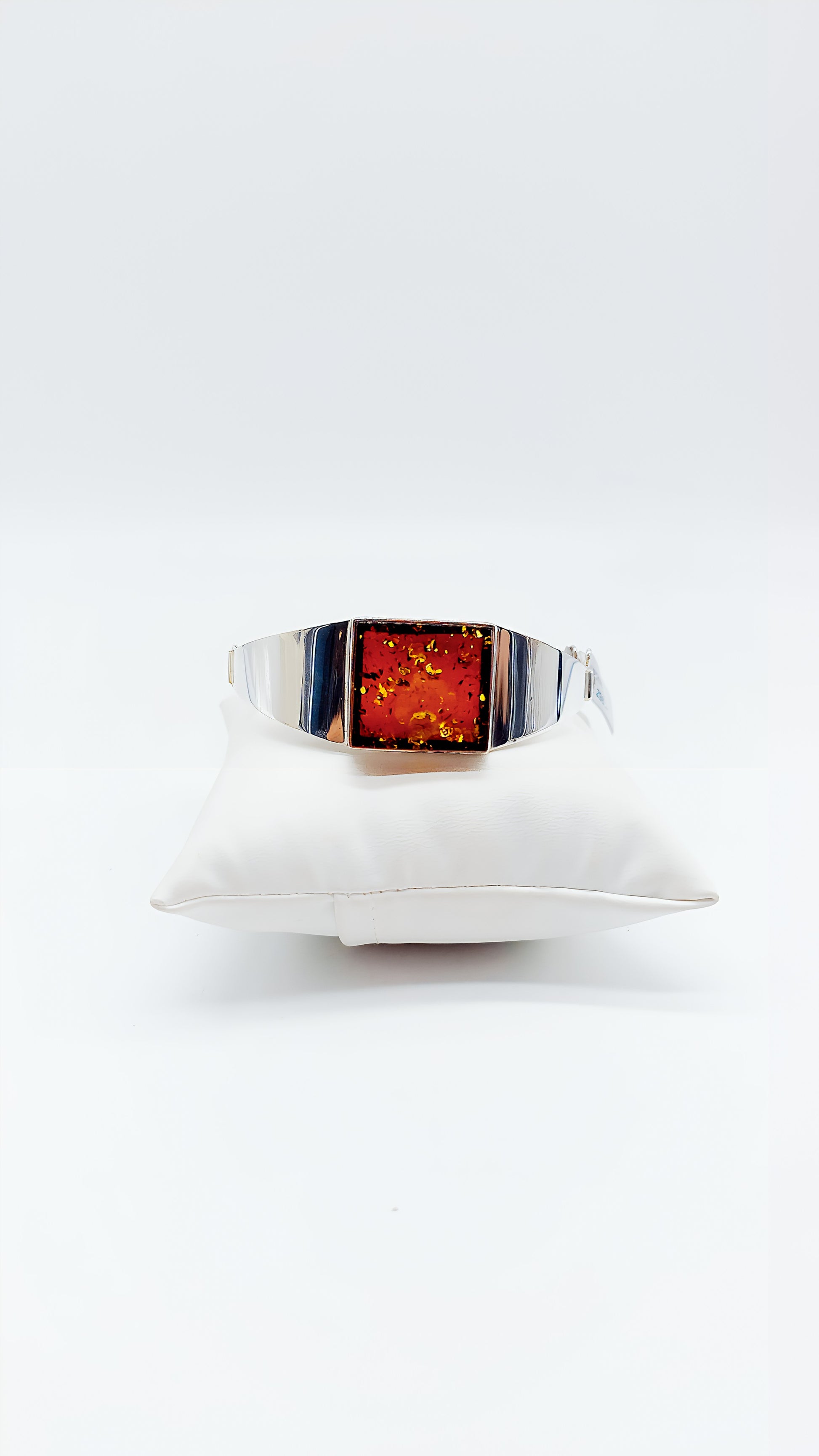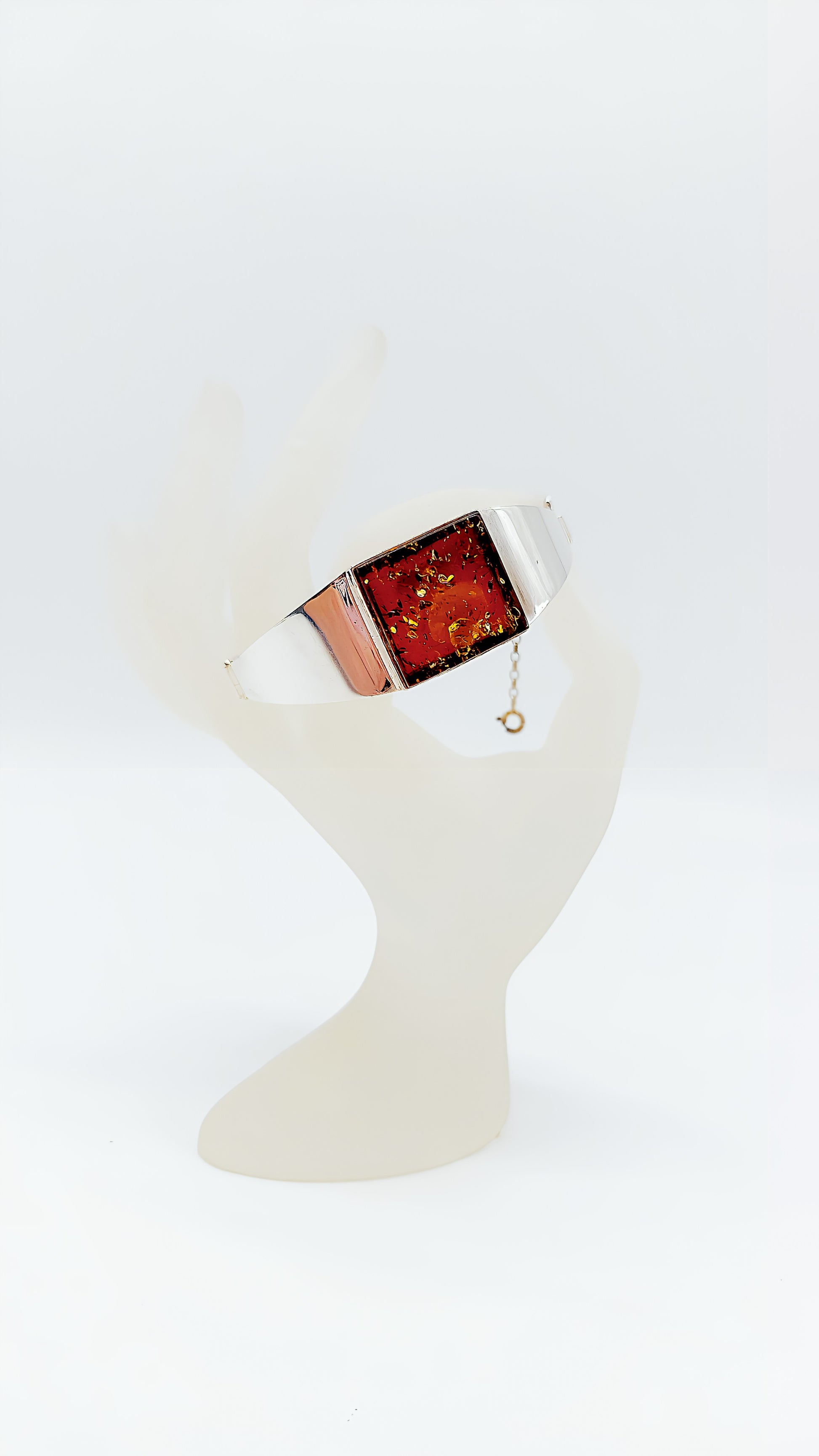 This stunning 925 sterling silver bangle makes a powerful statement with its large, rectangular amber stone. The amber shimmers in a deep rose-gold hue, magically capturing the light. The wide silver setting emphasizes its elegance and makes this piece a real eye-catcher. Perfect for women who love modern yet natural jewelry. This bangle can be worn for both elegant occasions and everyday wear, adding a unique touch to any outfit. A perfect gift for special moments.