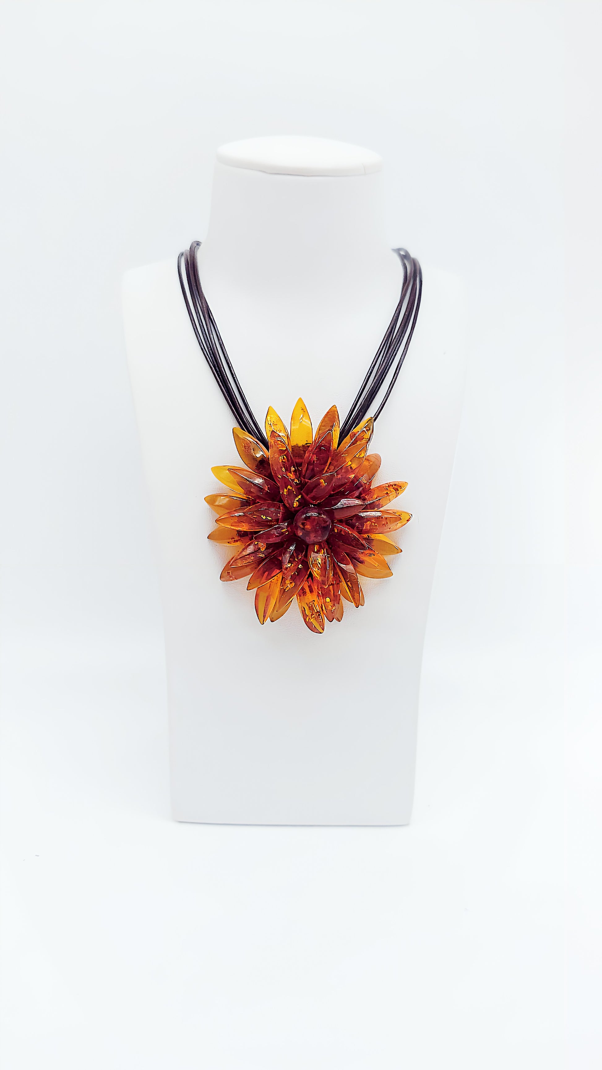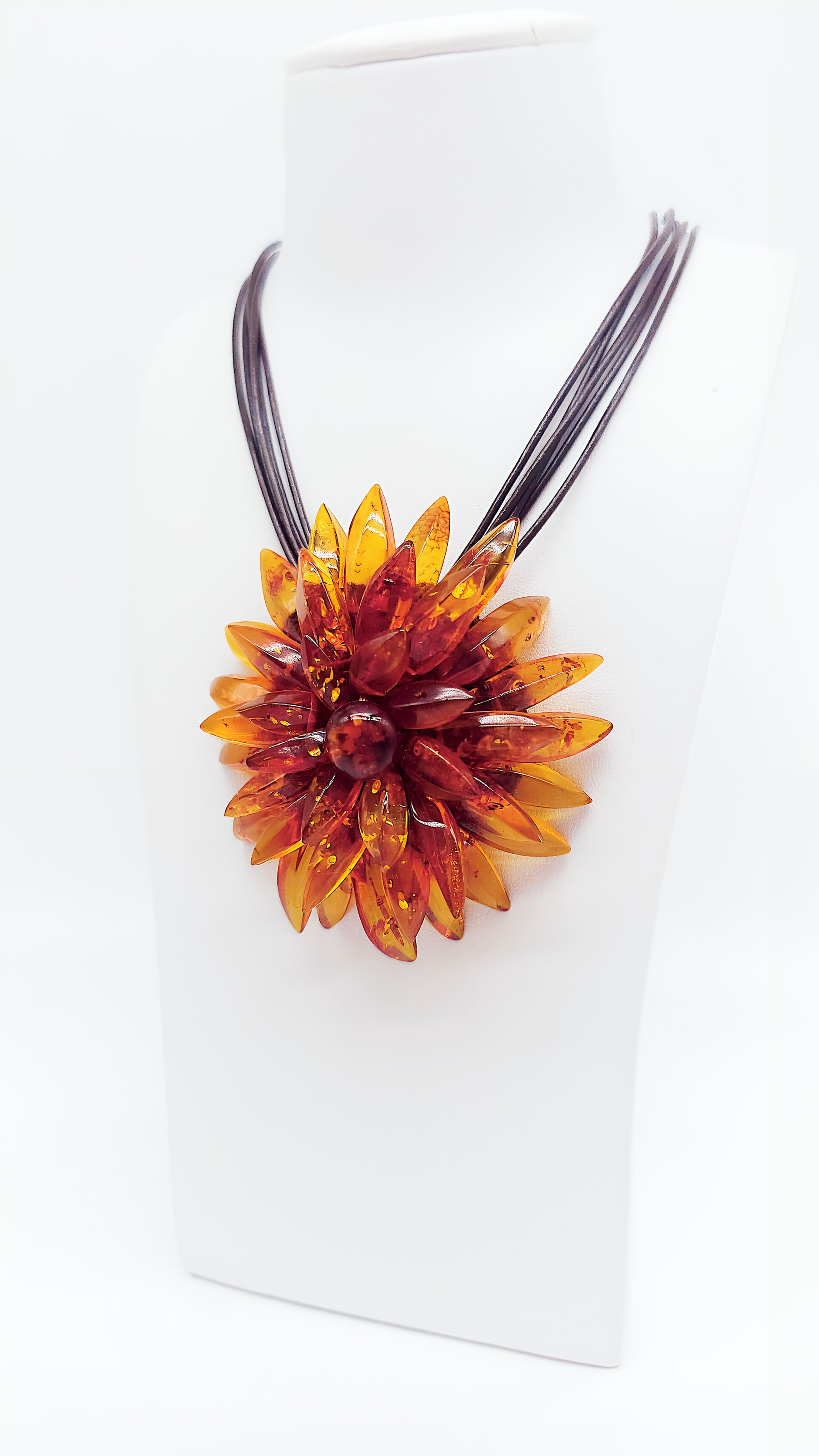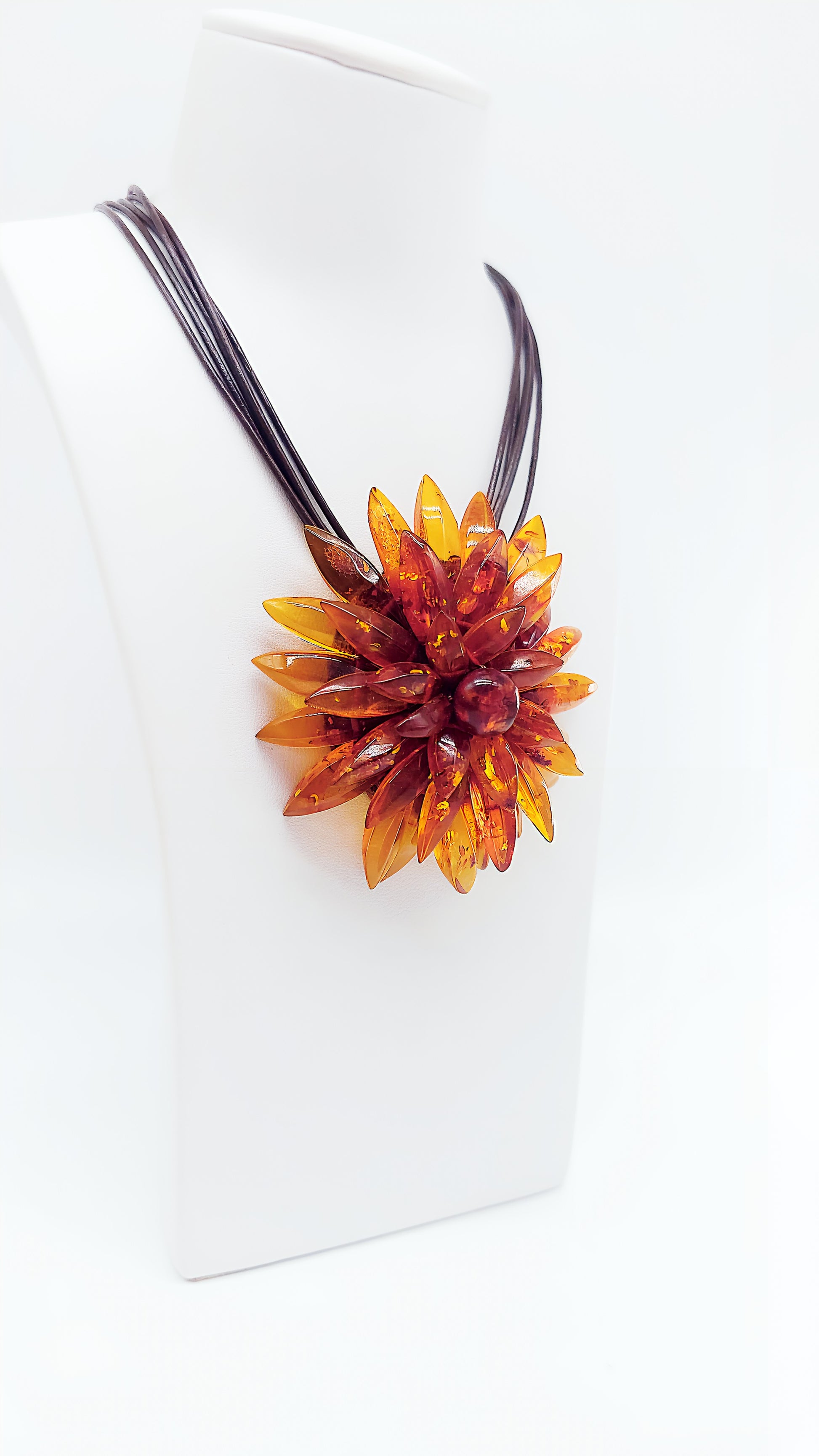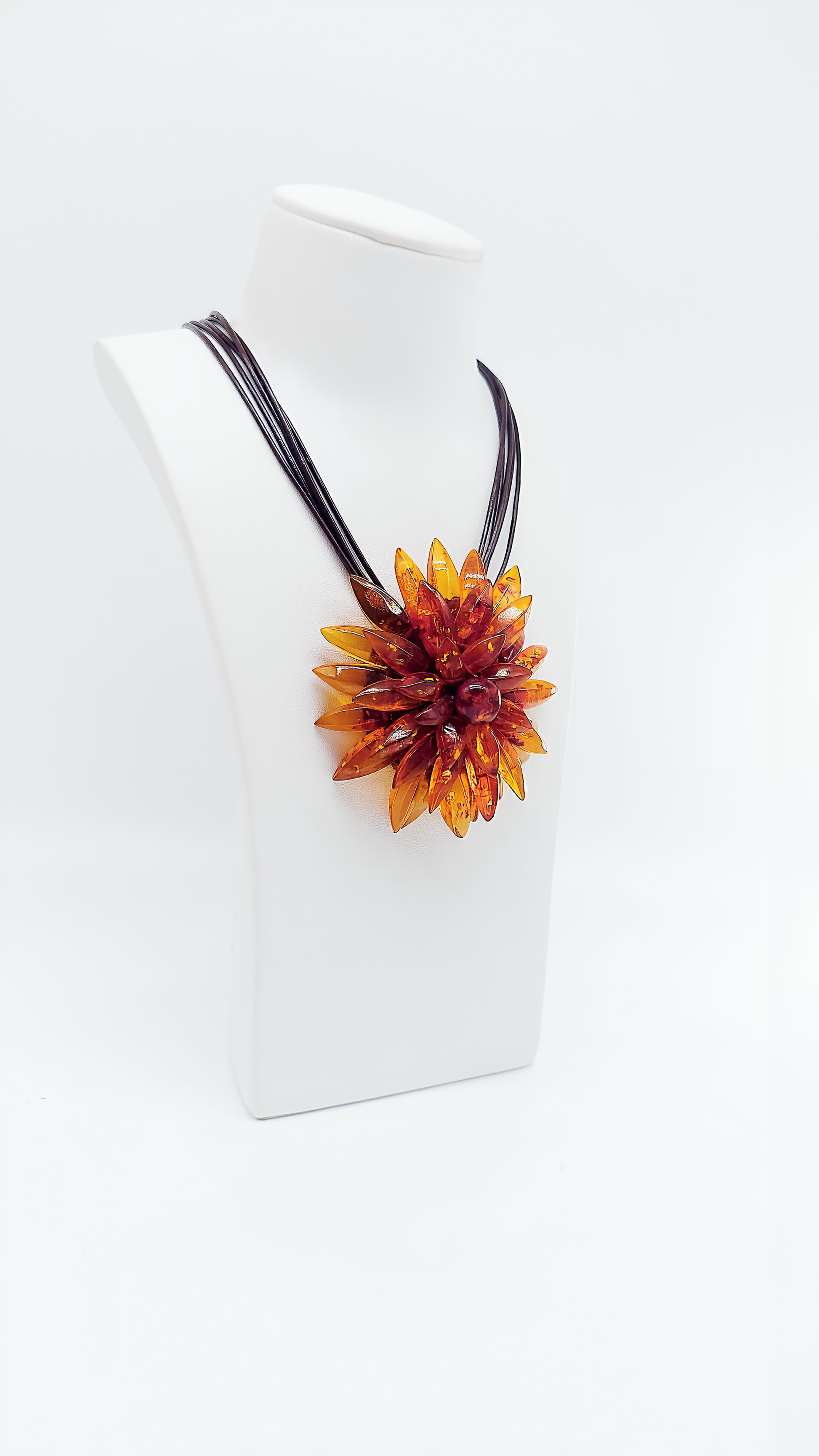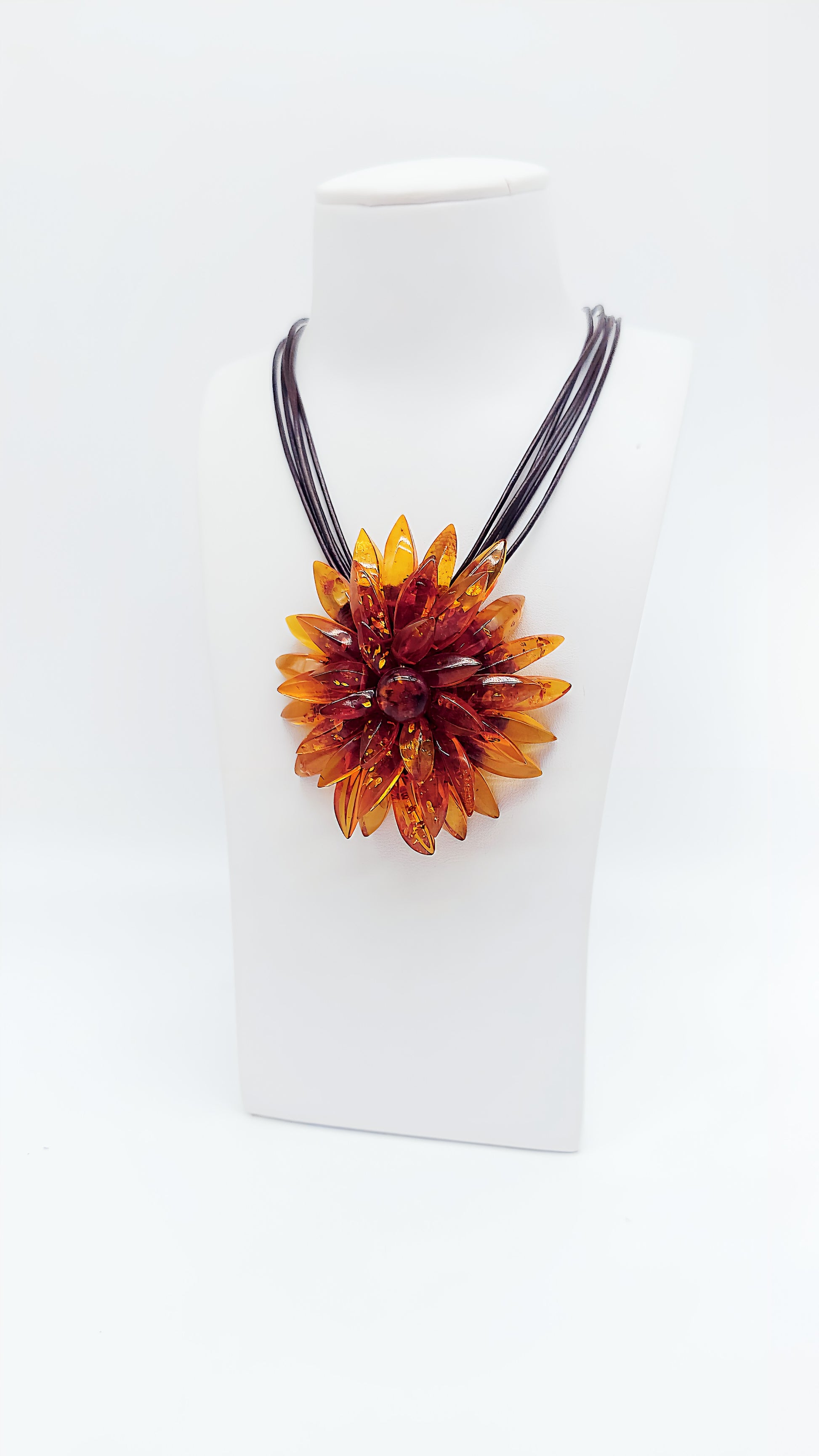 This unique piece of jewelry combines beauty and versatility: a stunning pendant in the shape of a luminous flower made of genuine amber, which can also be worn as a stylish brooch. The warm colors of the amber, reminiscent of the sun and nature, radiate pure elegance. Each stone has been skillfully cut and set by hand to create this magnificent, one-of-a-kind piece.