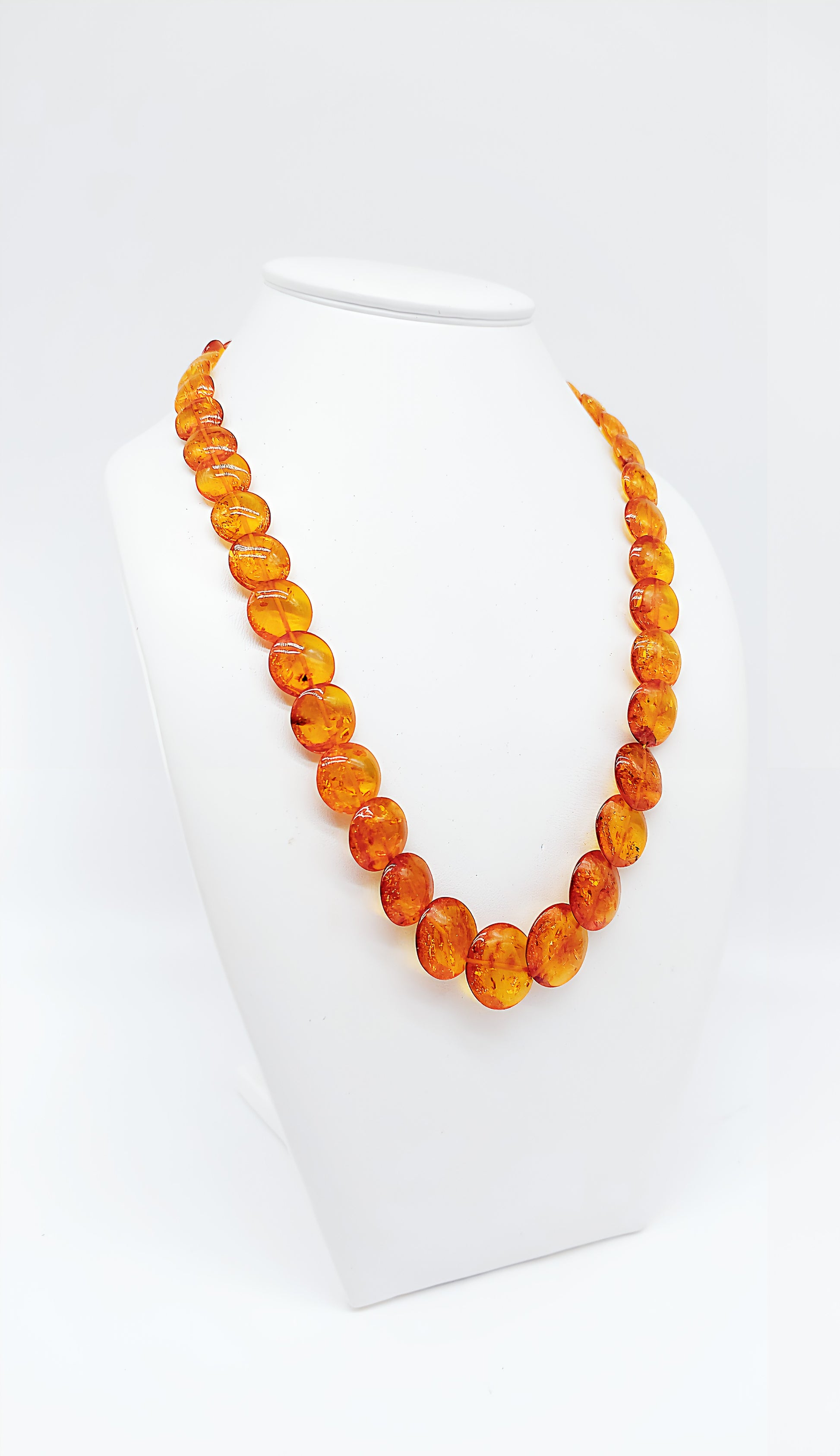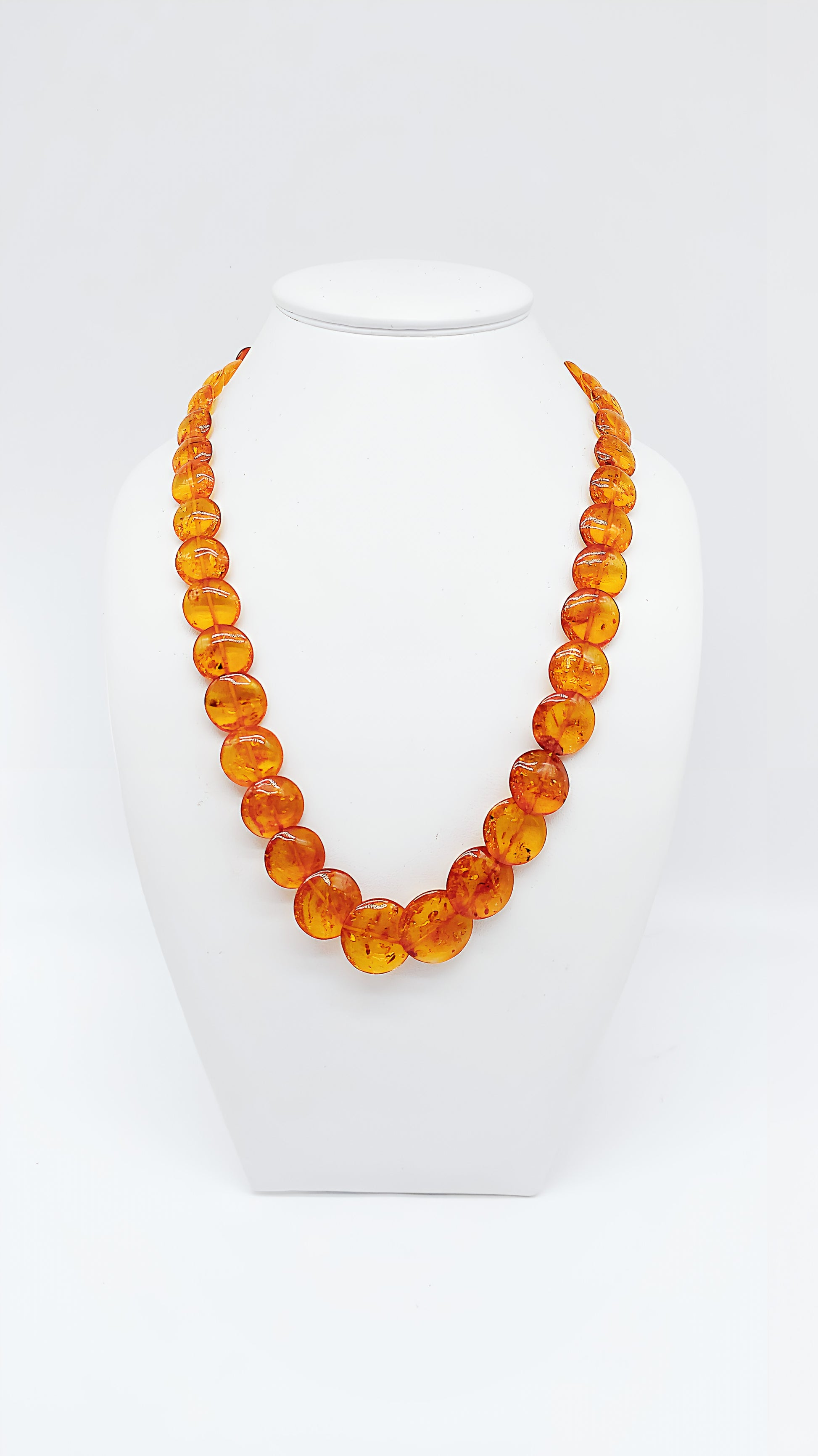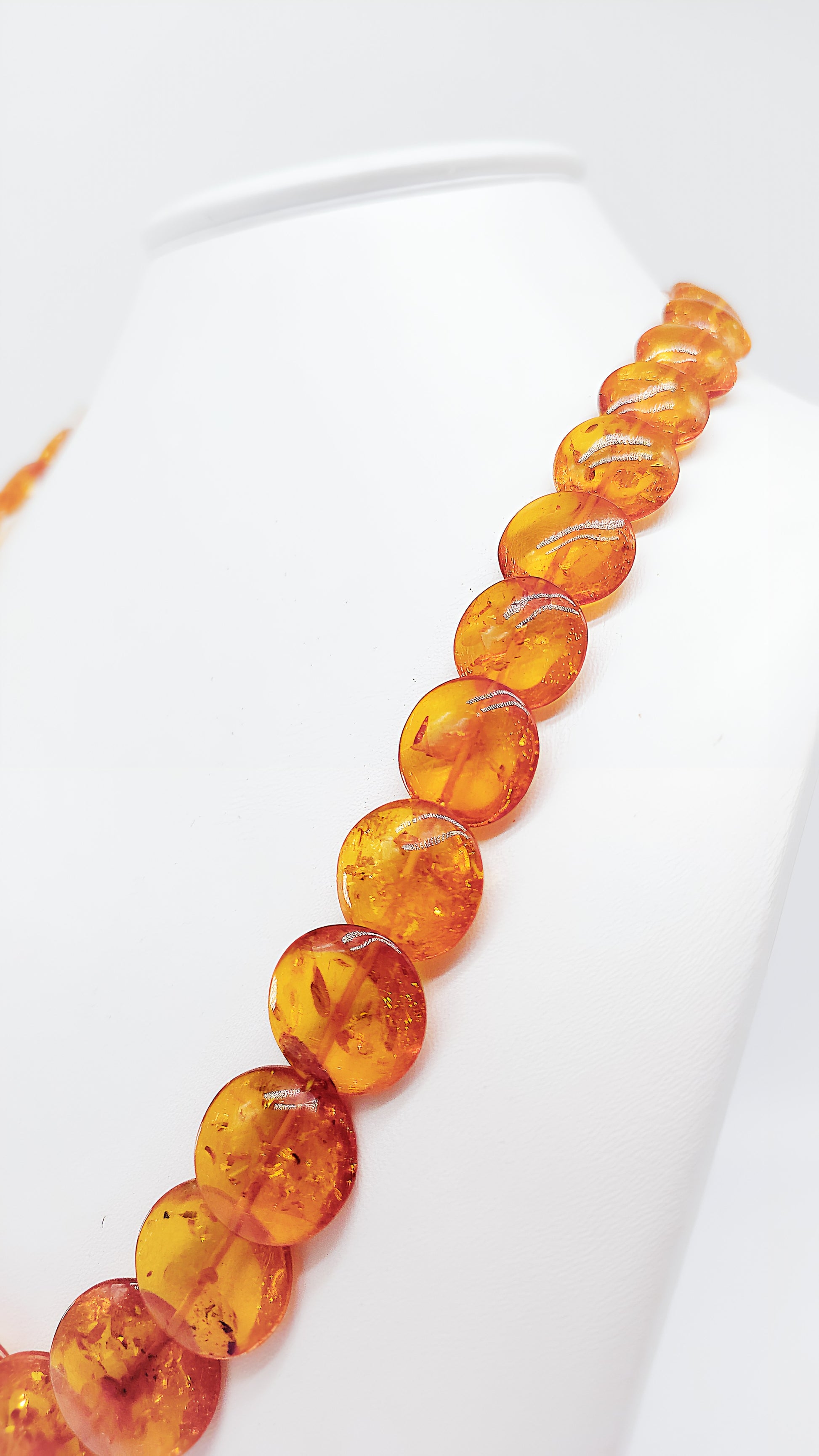 This elegant amber necklace captivates with its warm, vibrant orange hue and exquisite luster. The round, polished natural amber beads reflect the light and lend the piece a special depth. Ideal for women who love high-quality, natural jewelry and are looking for a timeless accessory for special occasions or everyday wear. This necklace is not only a stylish eye-catcher, but also a unique gift for birthdays, anniversaries, or as an expression of special appreciation. A one-of-a-kind piece that enriches any jewelry collection!