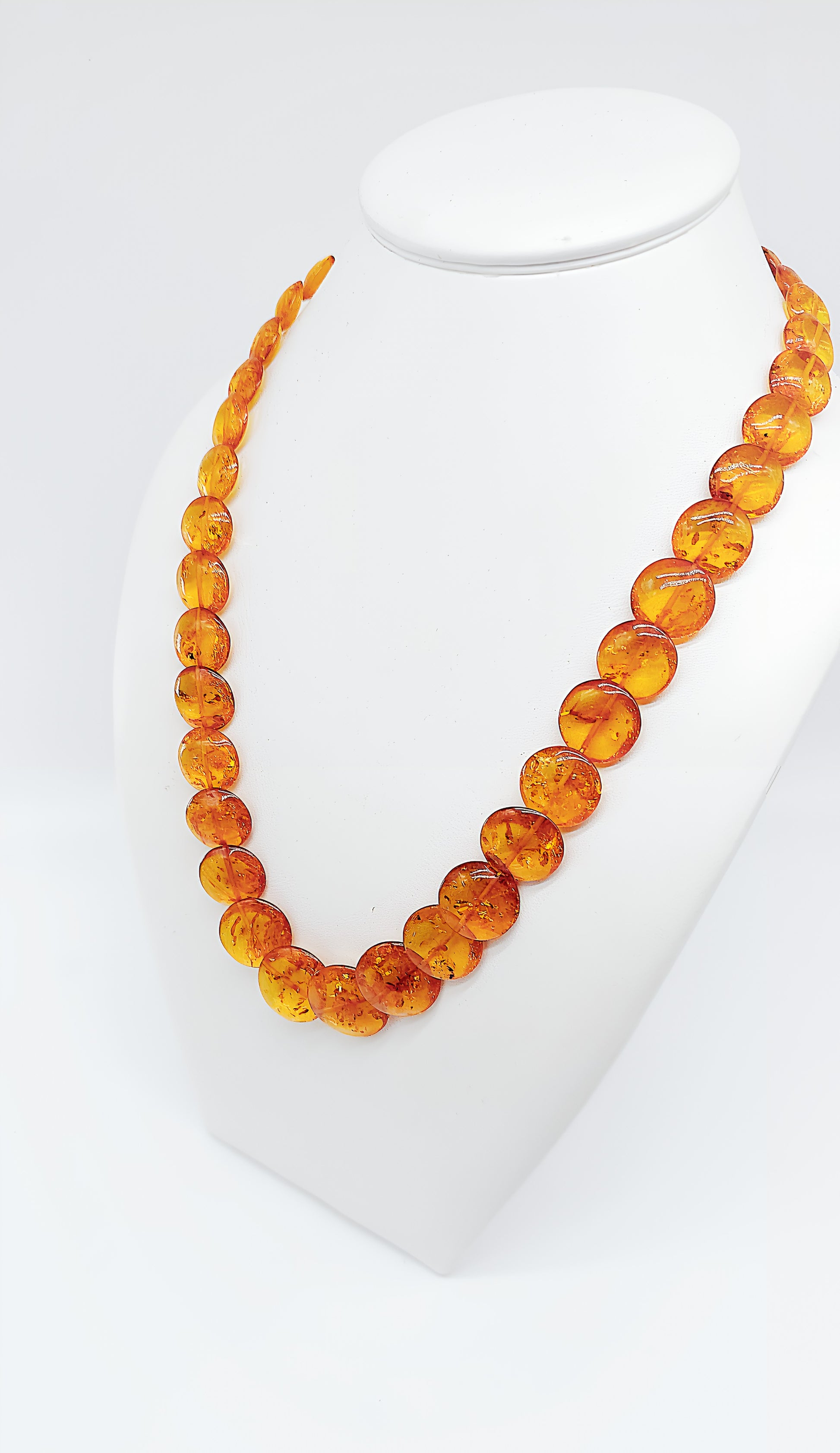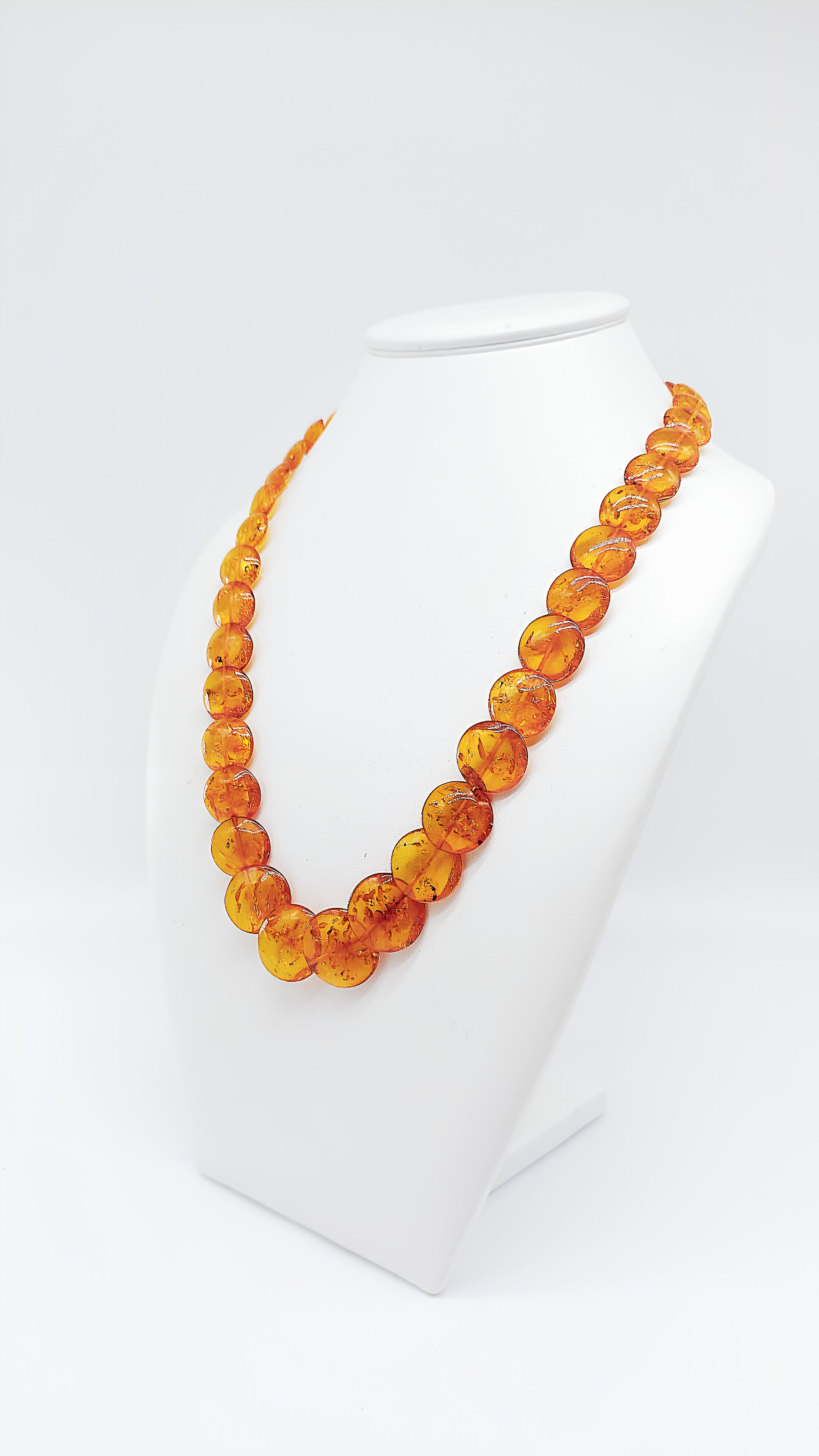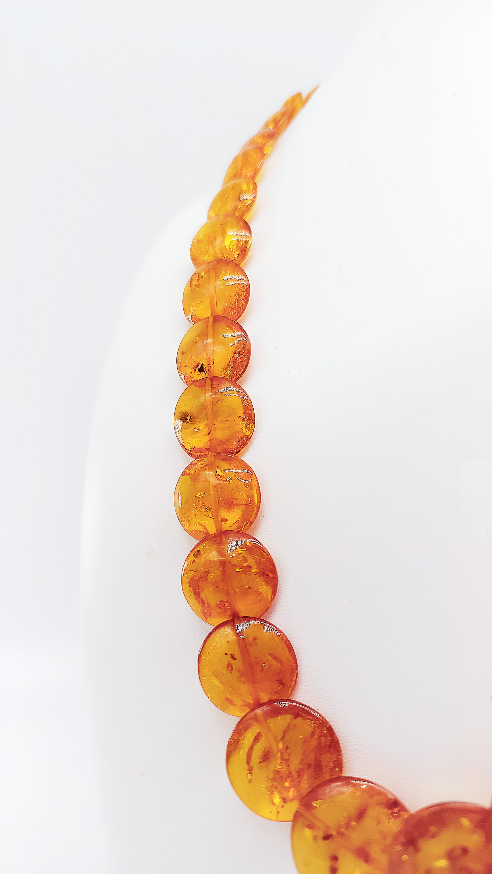 This elegant amber necklace captivates with its warm, vibrant orange hue and exquisite luster. The round, polished natural amber beads reflect the light and lend the piece a special depth. Ideal for women who love high-quality, natural jewelry and are looking for a timeless accessory for special occasions or everyday wear. This necklace is not only a stylish eye-catcher, but also a unique gift for birthdays, anniversaries, or as an expression of special appreciation. A one-of-a-kind piece that enriches any jewelry collection!