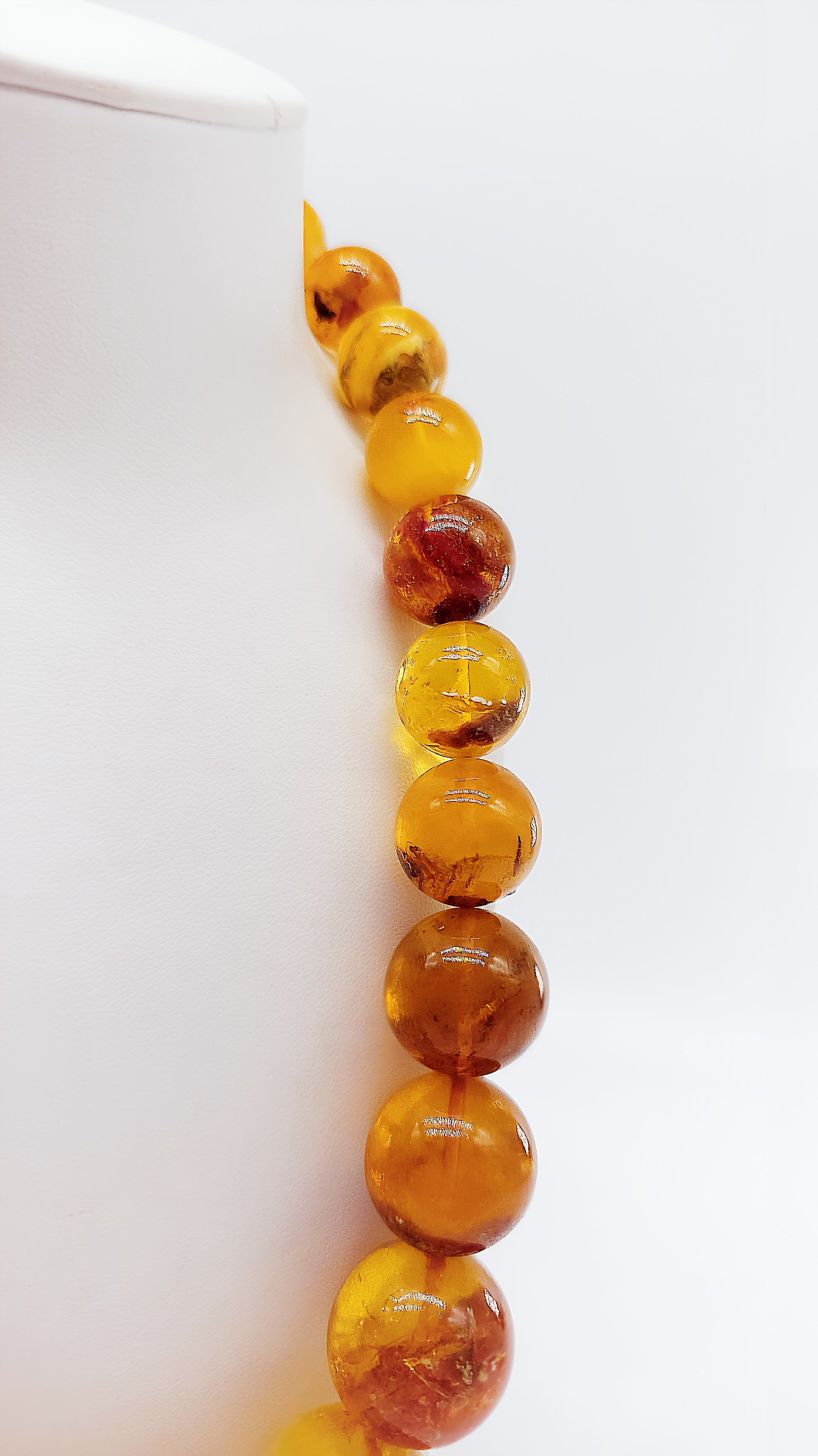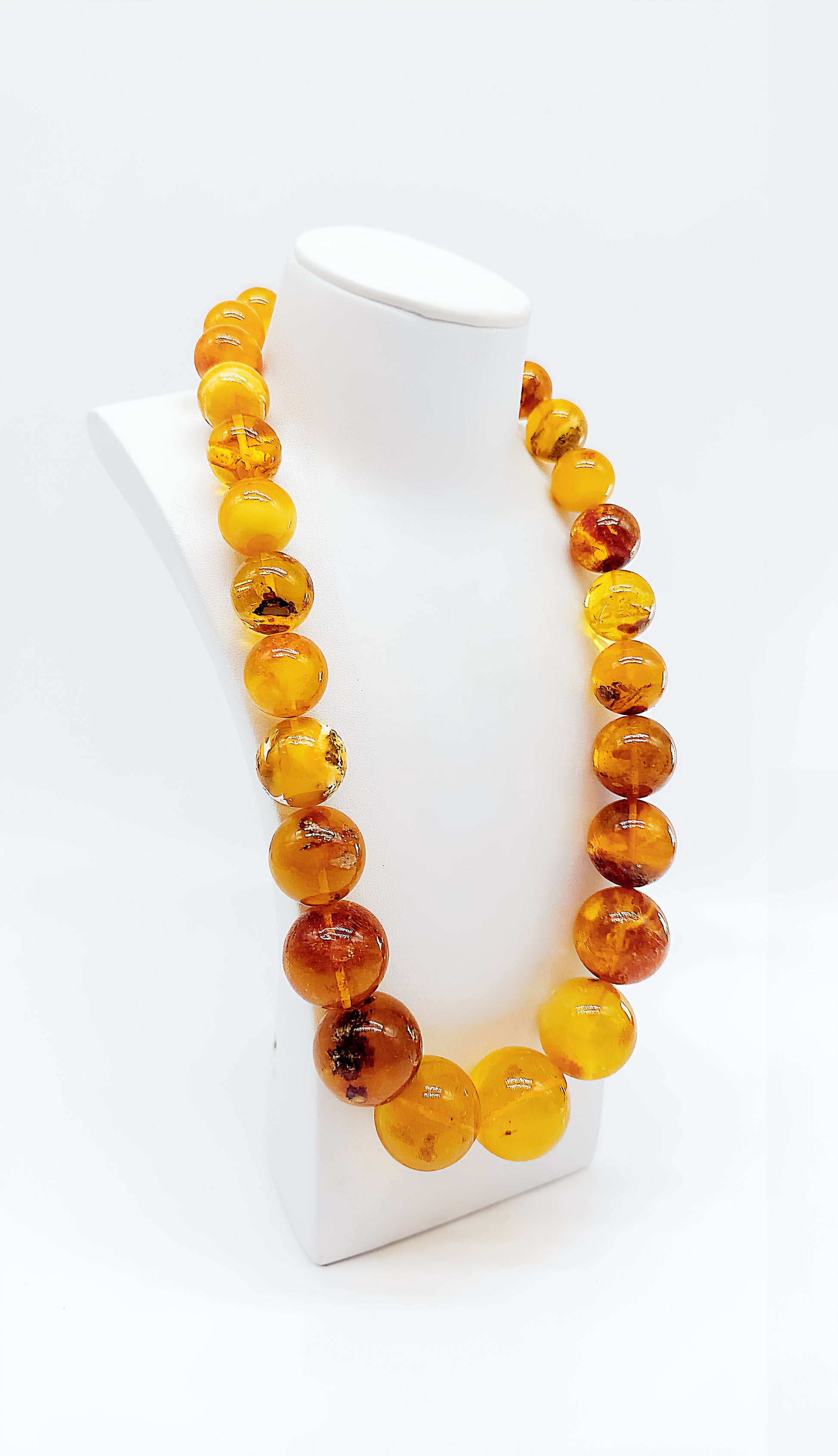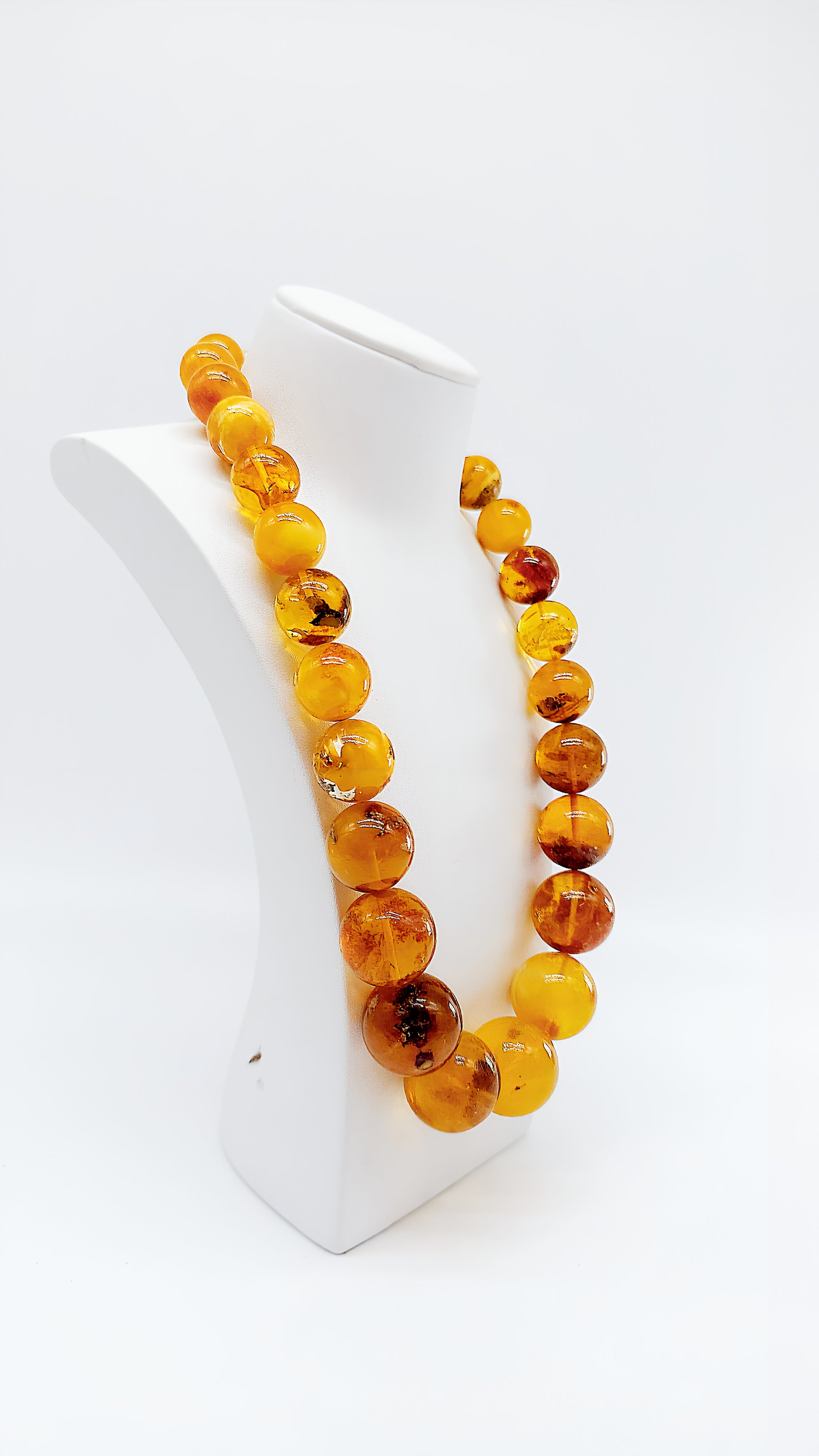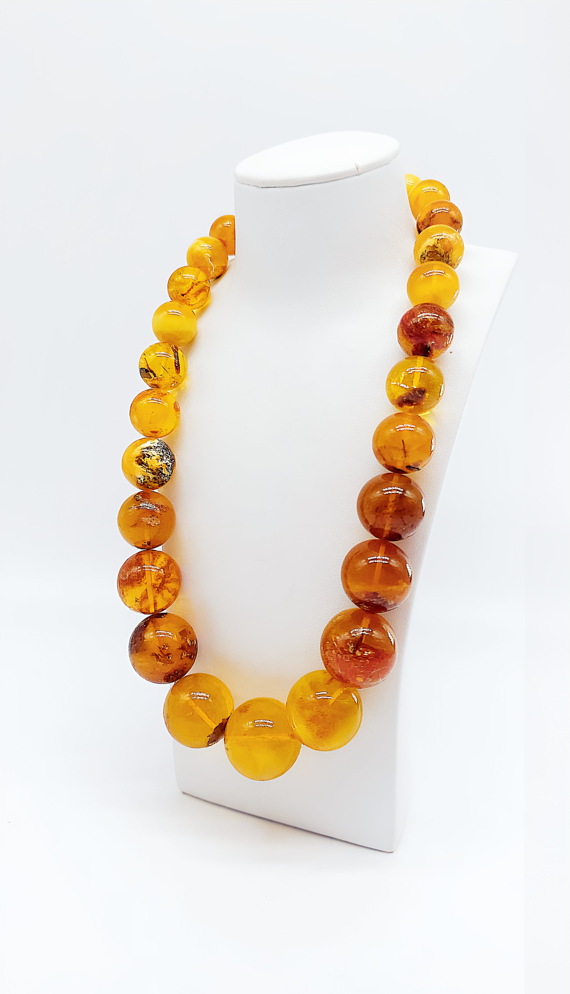 This luxurious amber necklace captivates with its large, lustrous spherical beads in warm yellow and orange tones. The natural grain and inclusions give each bead its individual touch, making each piece truly unique. Ideal for women who love natural and refined jewelry and are looking for a timeless accessory. This necklace is perfect for elegant occasions or as a high-quality gift for special moments such as birthdays or anniversaries. An exclusive piece of jewelry that perfectly combines elegance and nature.