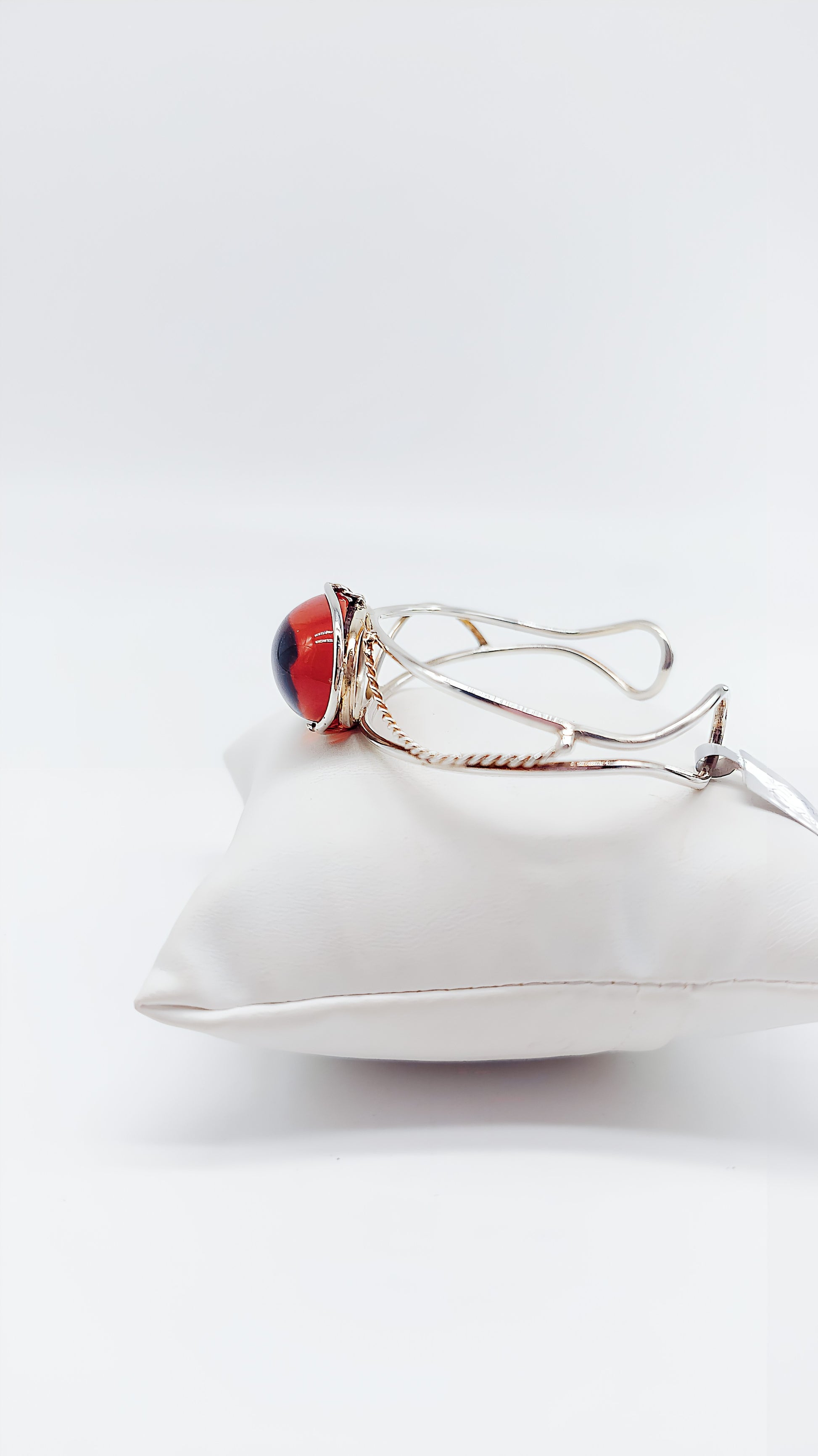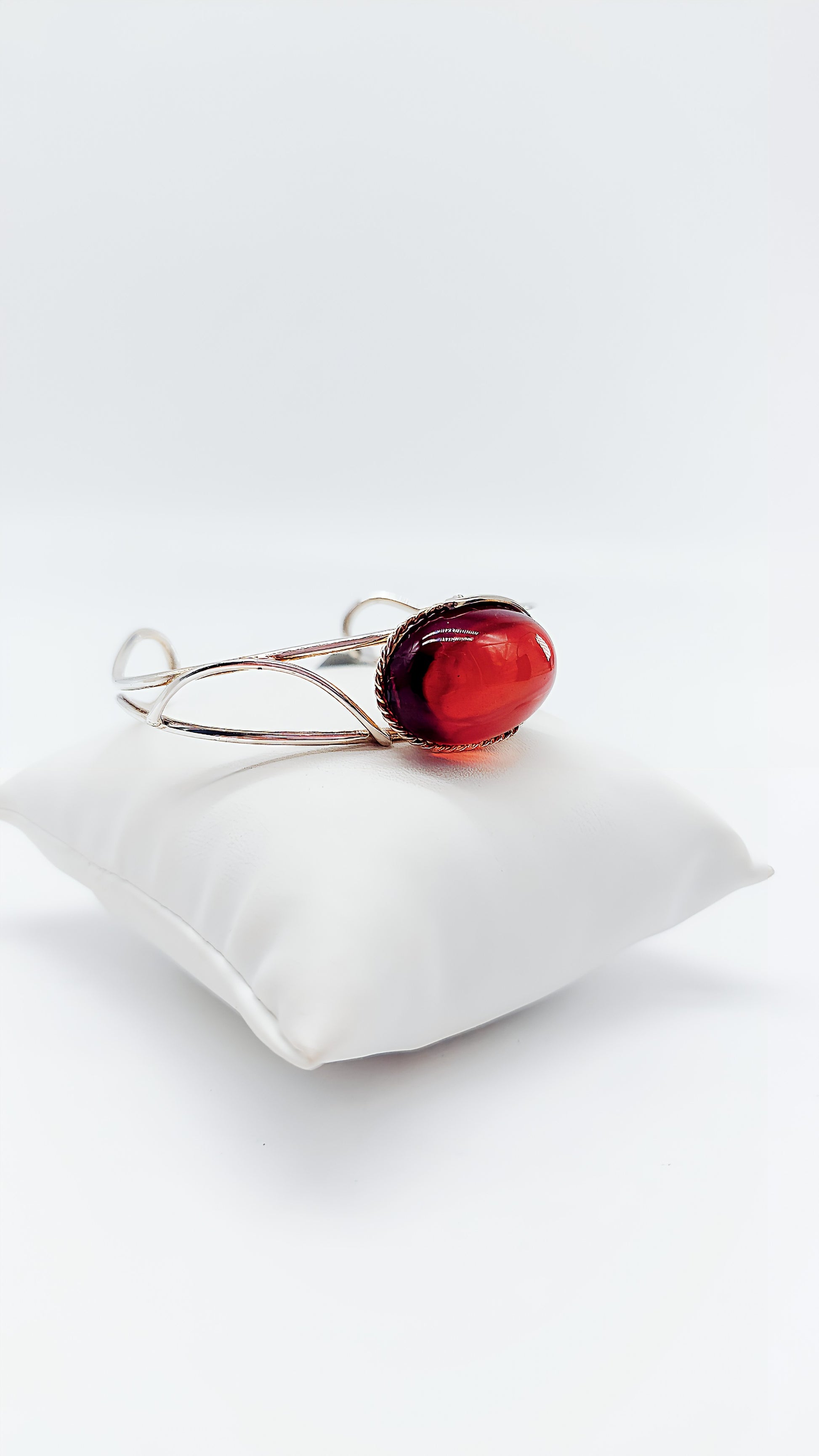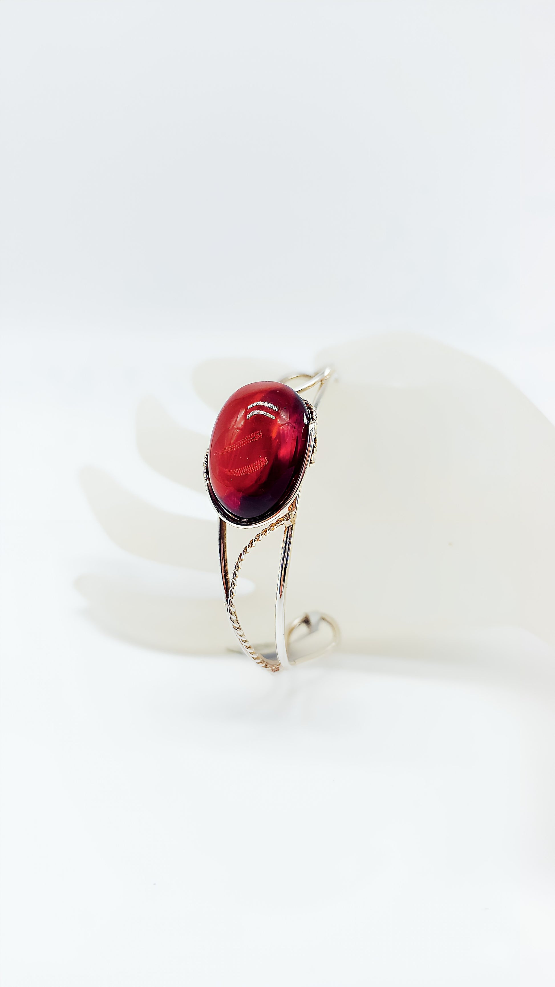 This exclusive 925 sterling silver bangle combines modern design with the captivating beauty of genuine, deep red amber . The vibrant red stone is set in a delicate silver setting, lending it an elegant lightness. Thanks to the high-quality craftsmanship, this piece of jewelry is comfortable to wear and a timeless eye-catcher . A perfect accessory for style-conscious women or as a special gift for birthdays, anniversaries, or Christmas.