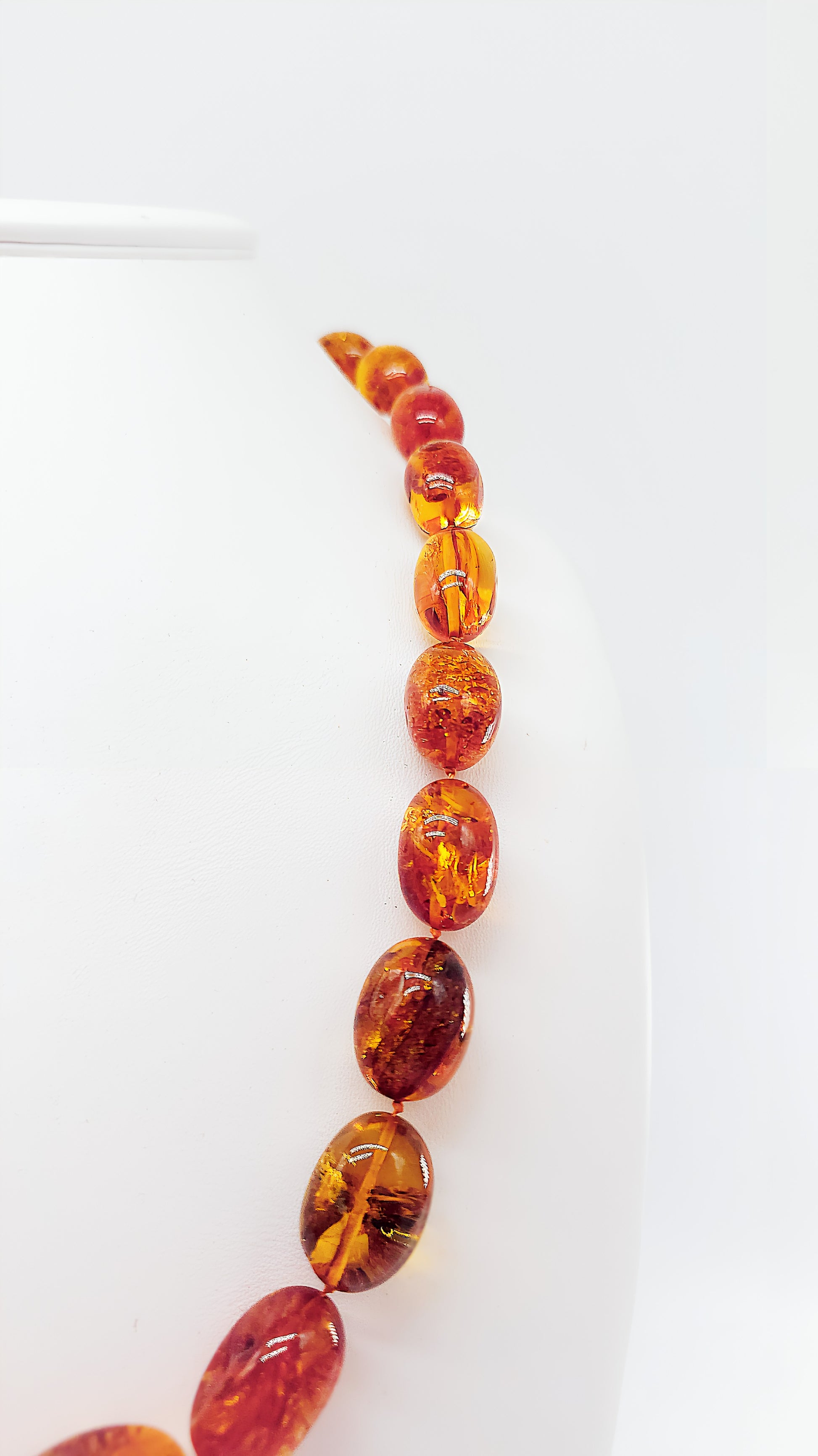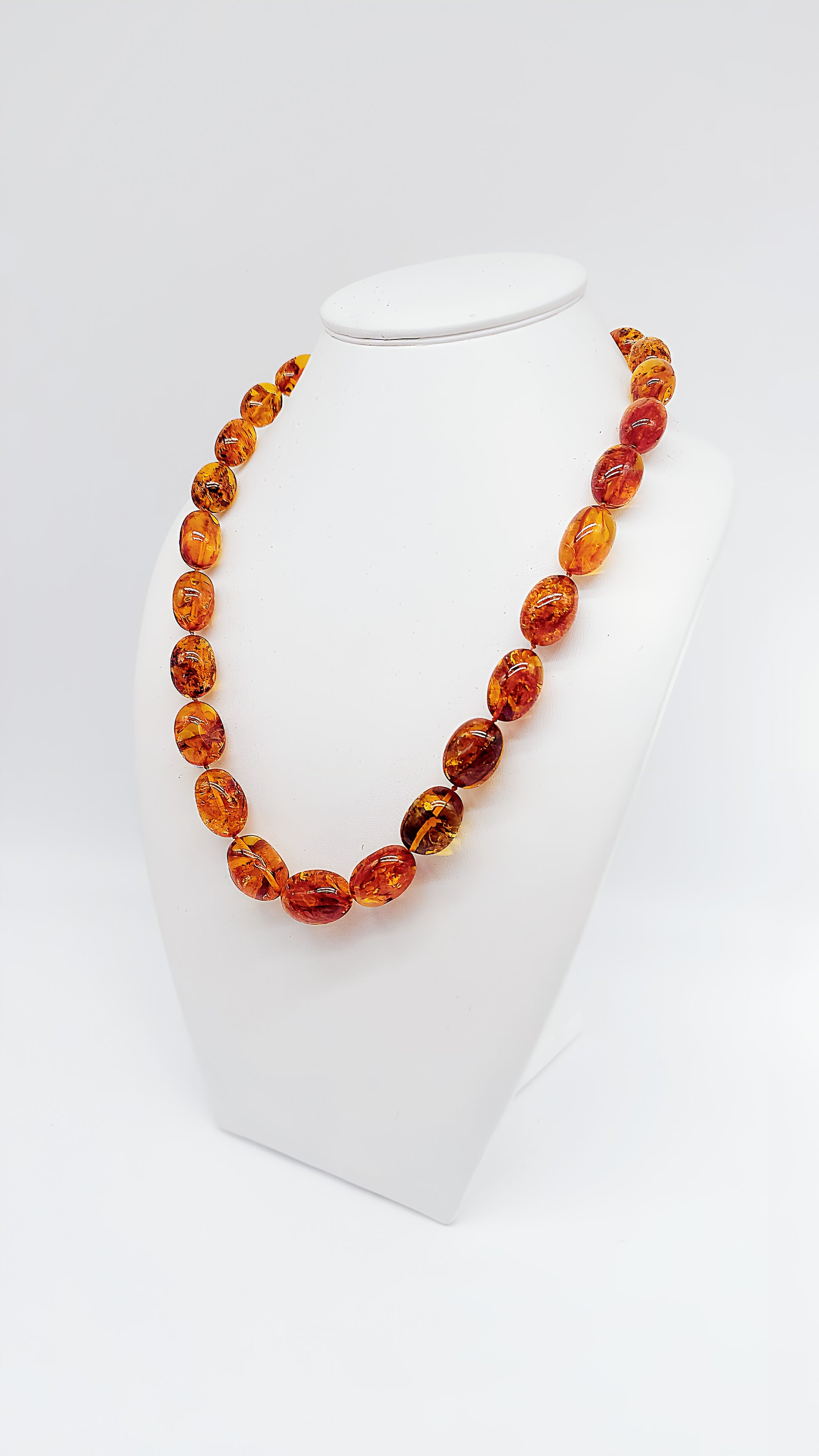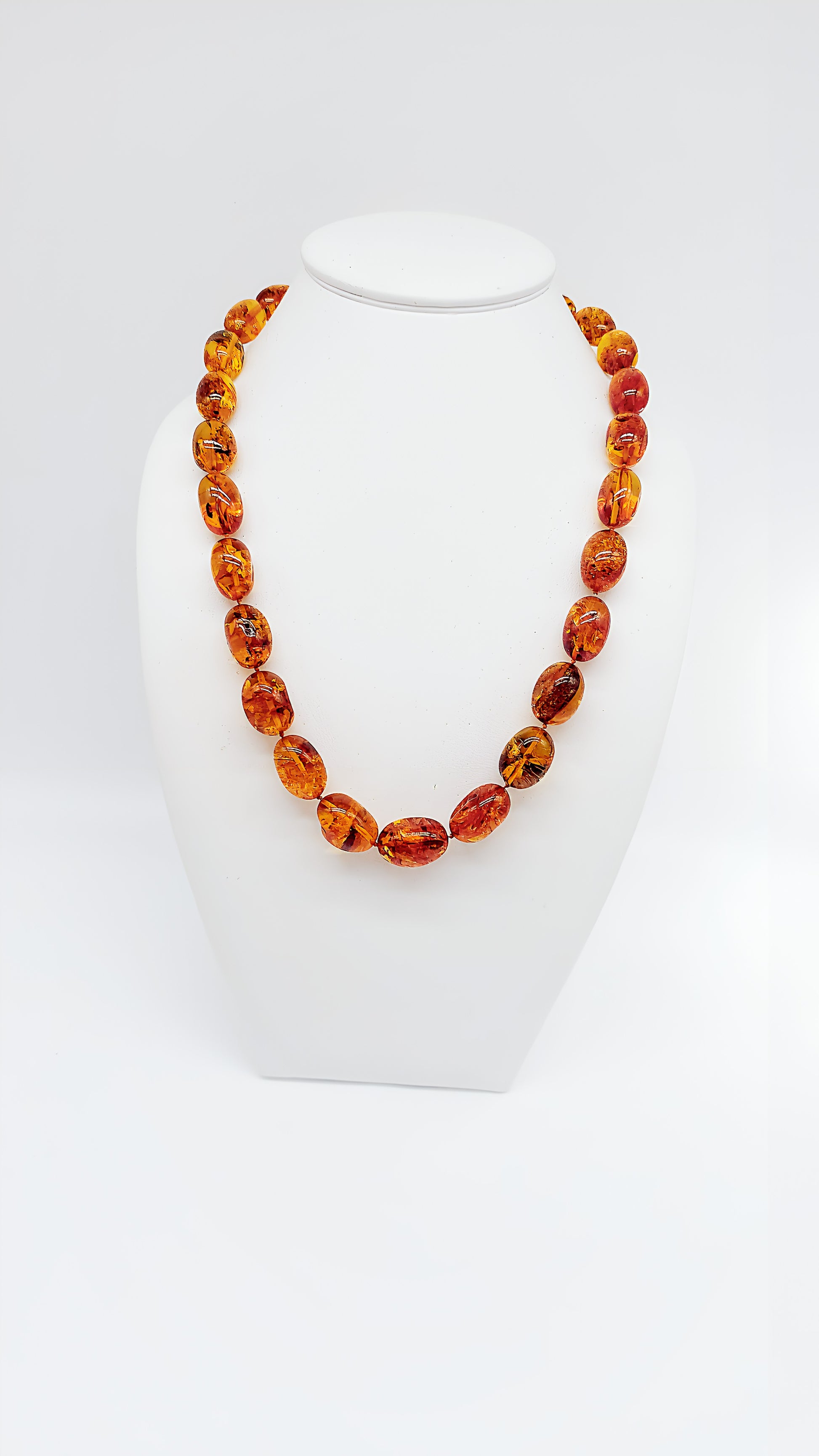 This elegant amber necklace impresses with its warm, orange shimmer and the fine natural inclusions that give it a unique structure. Each piece is unique, crafted from genuine natural amber, artfully cut and polished for a stunning shine. Perfect for women who love natural and elegant jewelry. This necklace is ideal for special occasions or as a stylish addition to everyday wear. An exclusive gift for birthdays, anniversaries, or simply as a token of special appreciation.