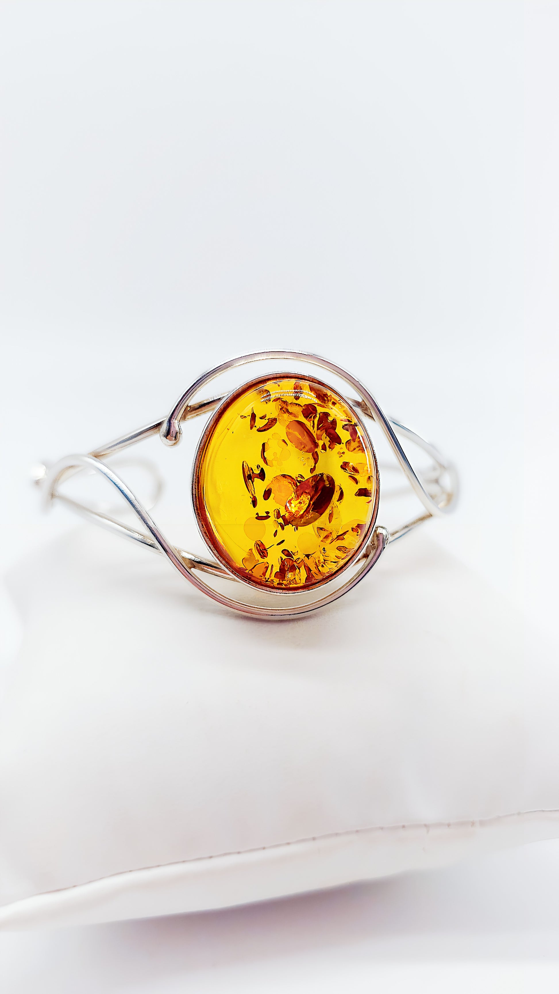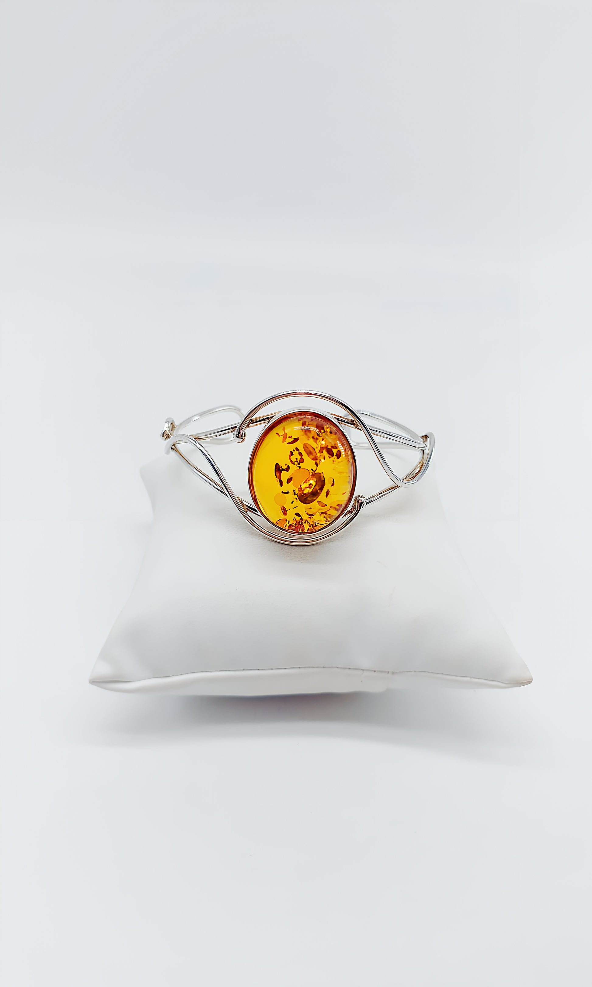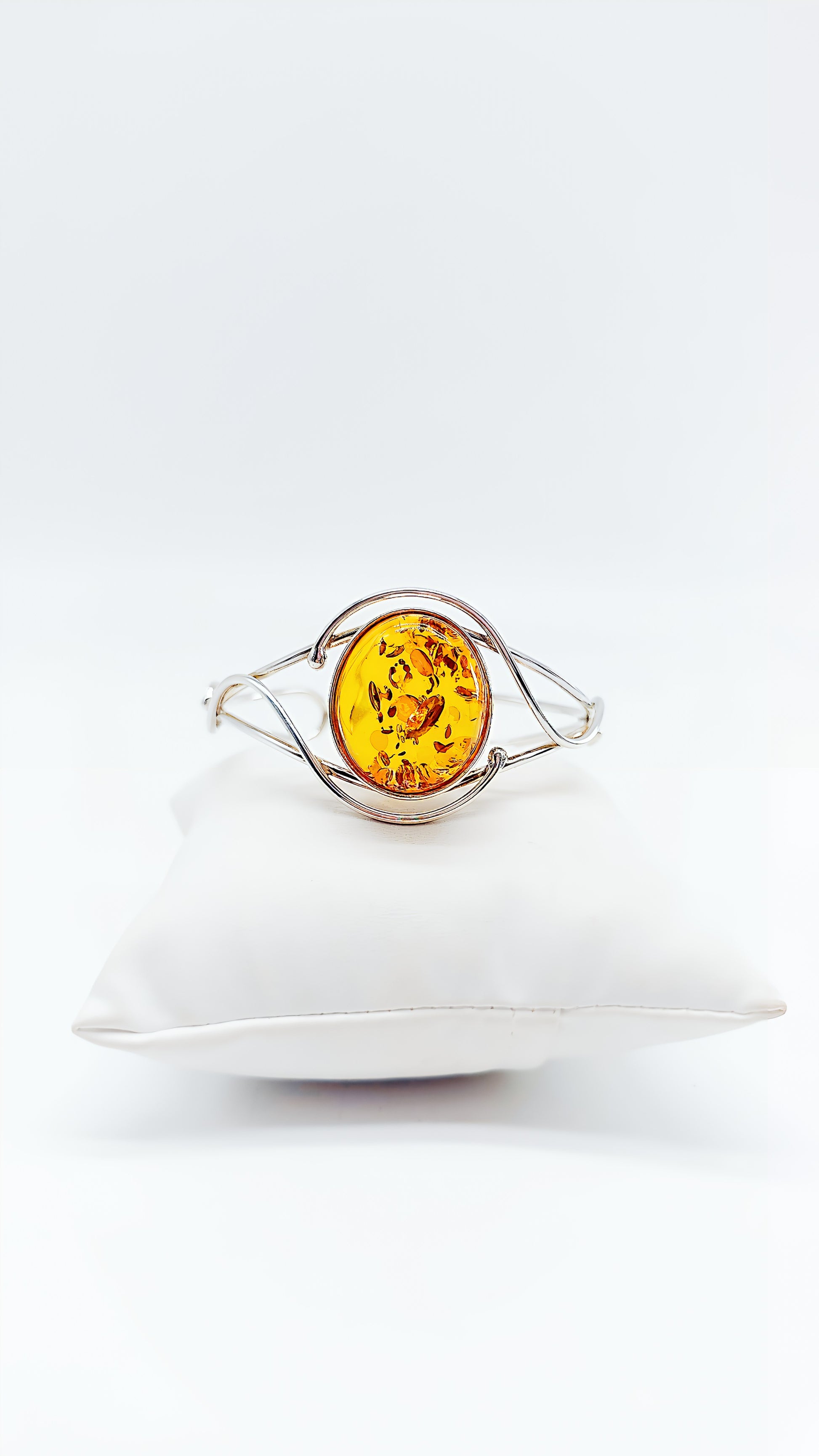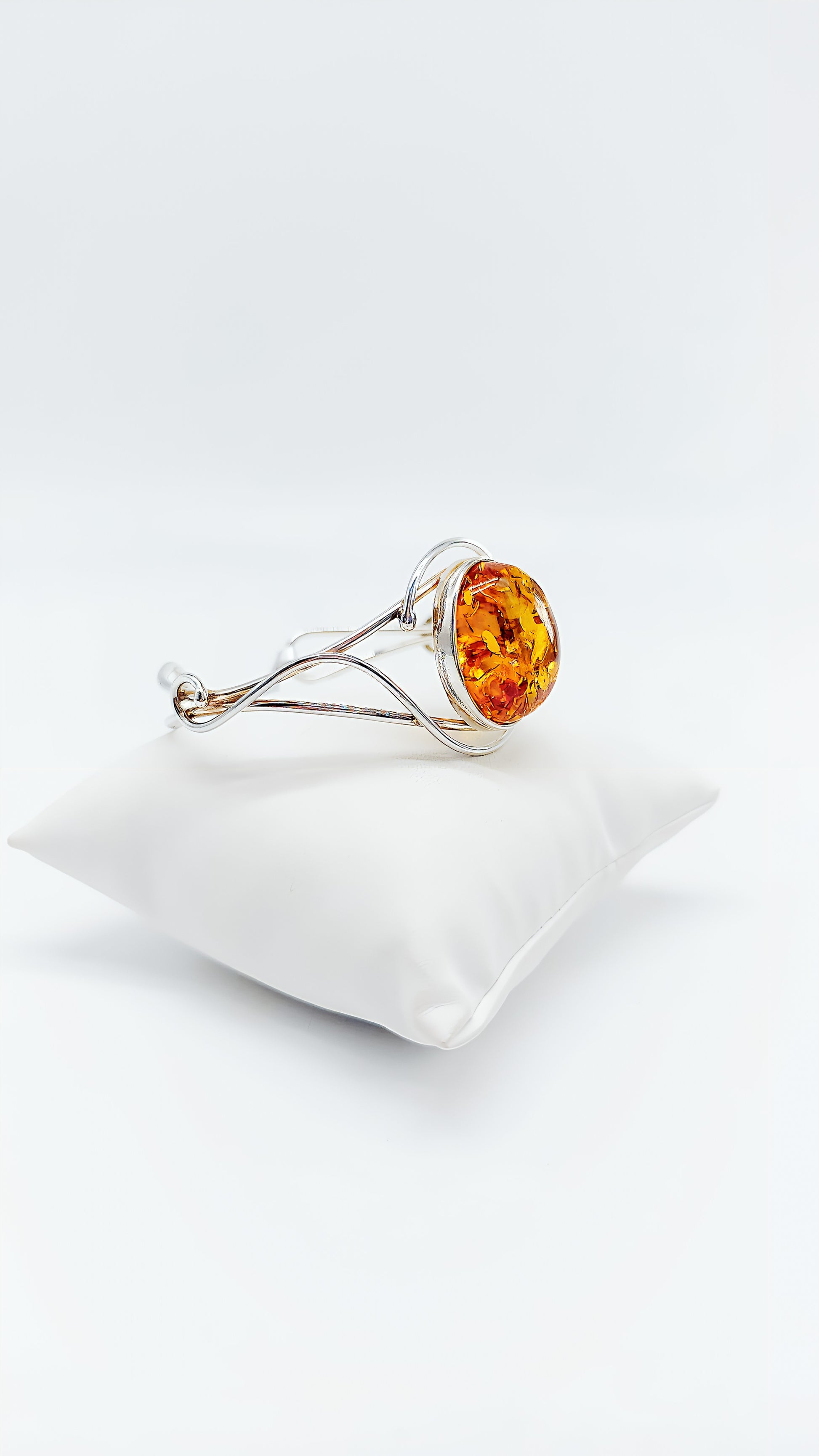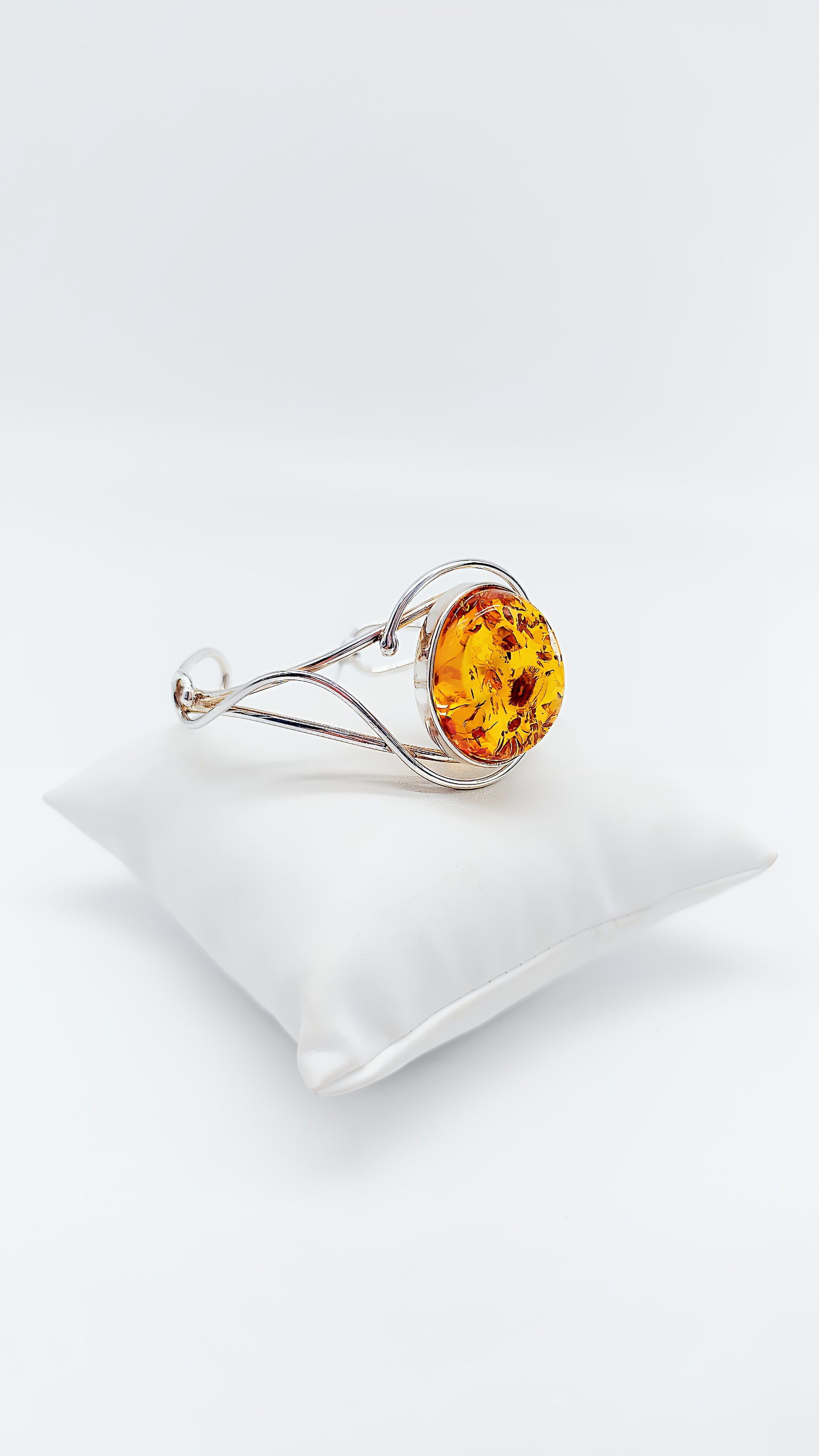 This elegant 925 sterling silver bangle combines the warm elegance of genuine amber with a modern, open design. The round amber is framed by delicate silver lines, giving it a light yet luxurious look. Thanks to the high-quality craftsmanship, this piece of jewelry is comfortable to wear and a timeless eye-catcher . Ideal for women who love natural jewelry, or as a special gift for birthdays, anniversaries, and Christmas.