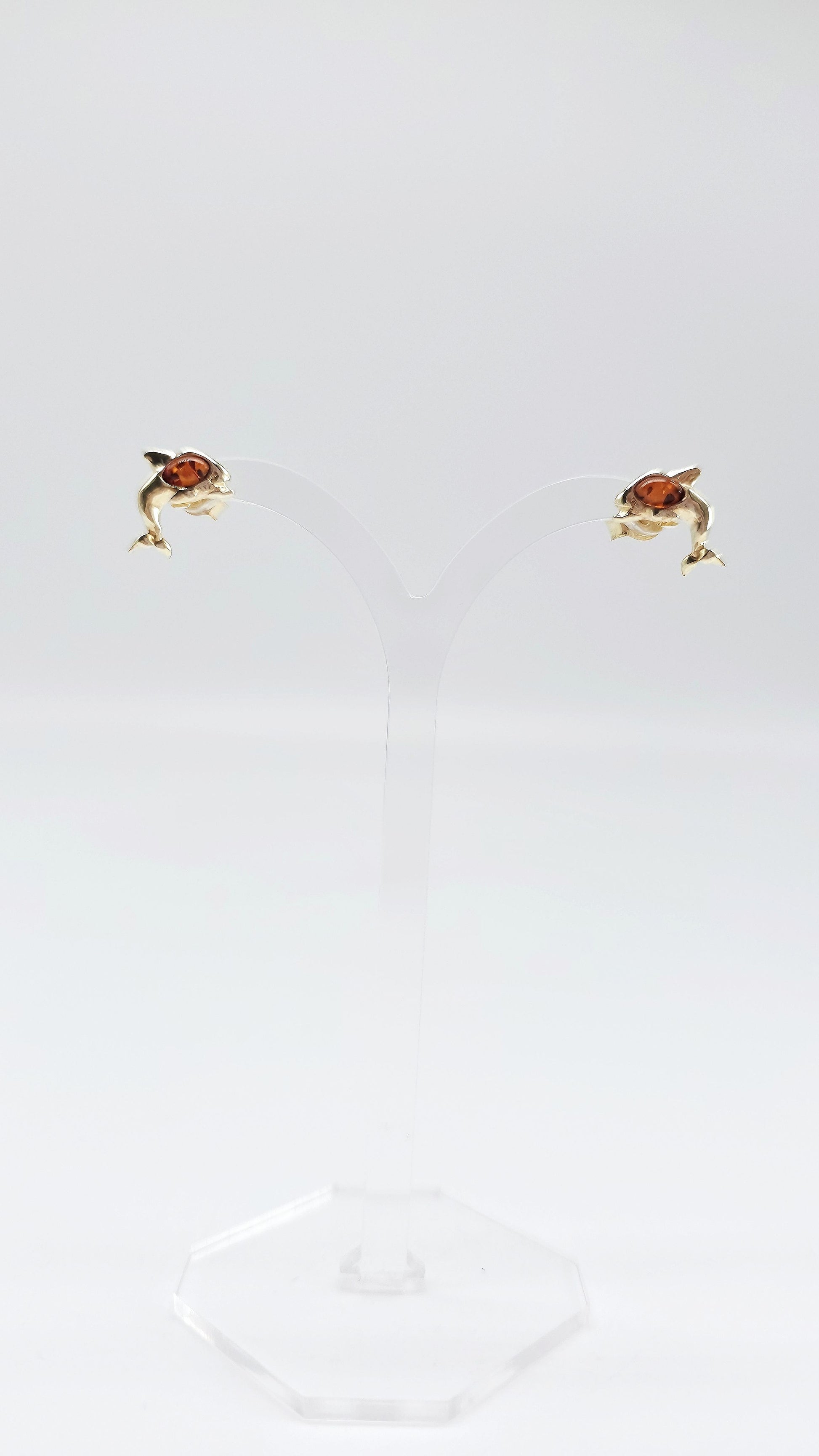 These delicate dolphin-shaped stud earrings made of gold-plated 925 sterling silver with genuine amber will add a touch of nautical flair to your jewelry box. The warm, honey-colored amber forms the dolphin's body and harmonizes perfectly with the elegant gold sheen of the design.
