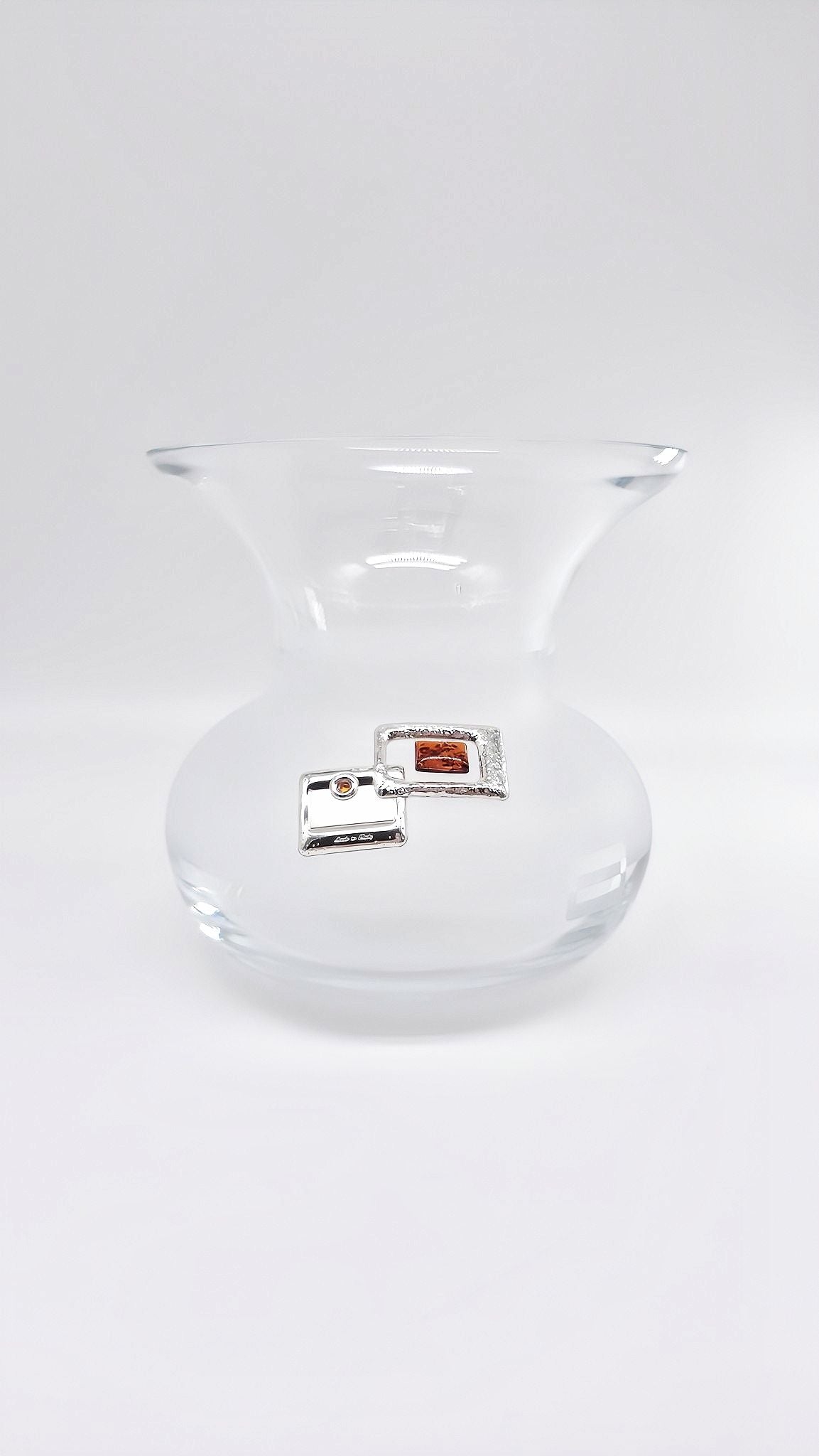 This handcrafted clear glass vase is a luxurious design object thanks to its exquisite embellishment with 925 sterling silver and warm amber. The vase's elegant curve and shimmering details make it the perfect centerpiece for floral arrangements or as a decorative highlight on any table.