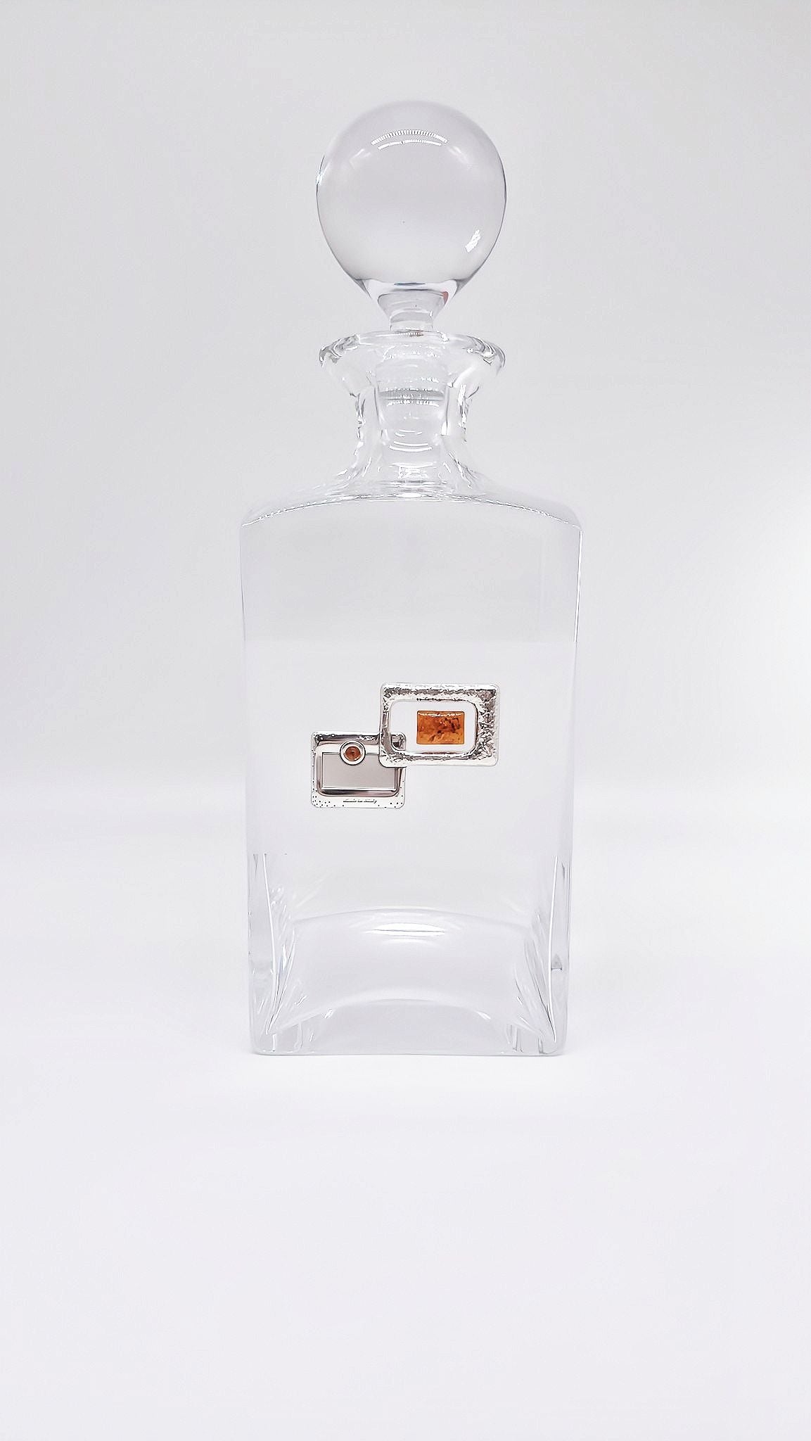 This clear glass decanter combines the cool elegance of 925 sterling silver with the warm glow of amber. The rectangular shape and solid glass stopper give it a modern yet timeless design. Perfect for the stylish presentation of whiskey, wine, or other fine beverages. The amber, embedded in the silver, creates a luxurious highlight.