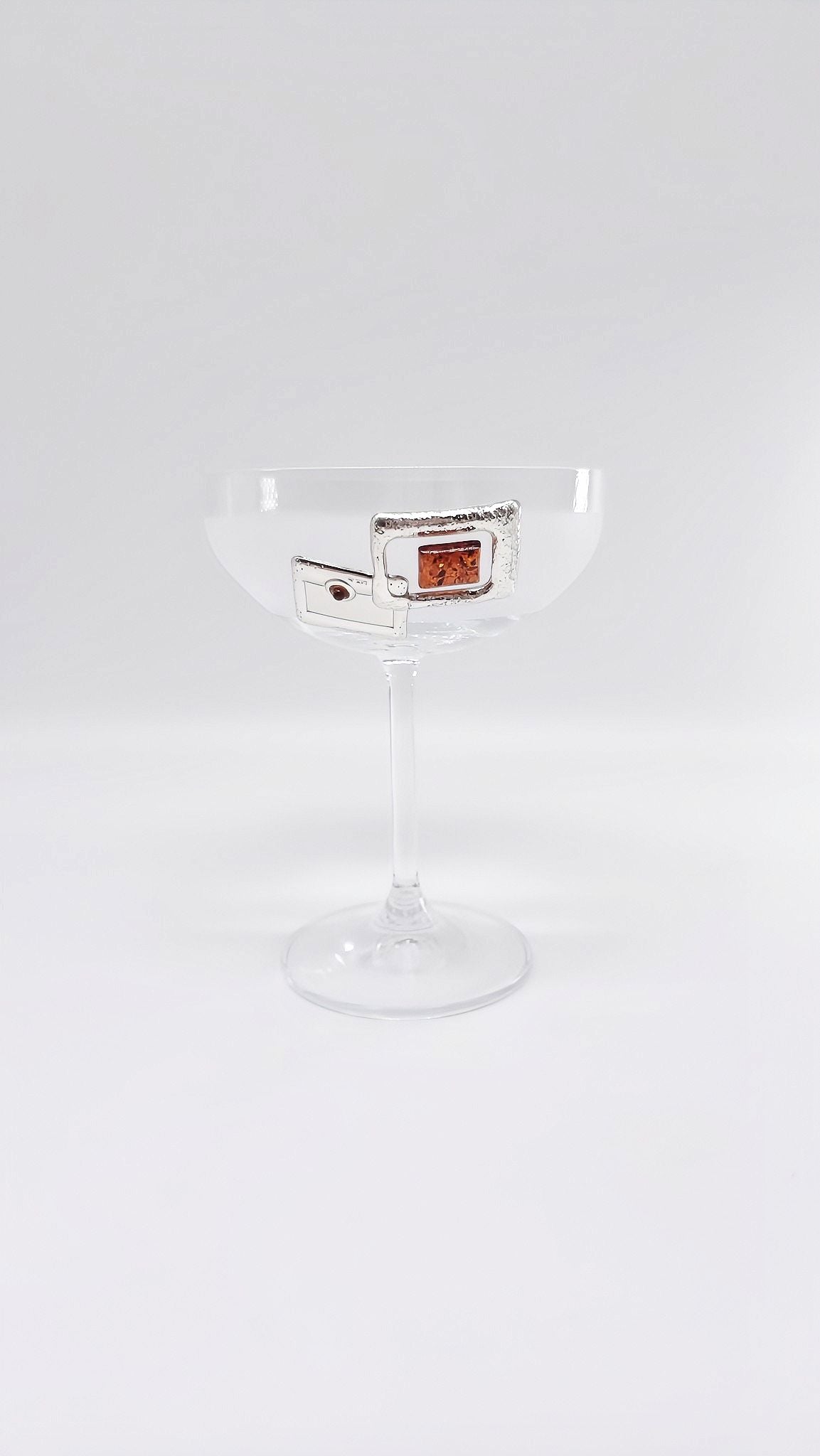 This martini glass combines luxurious design with handcrafted elegance. Crafted from clear glass, it is enhanced by accents of 925 sterling silver and genuine amber. The modern design exudes style and exclusivity, while the amber's warm glow creates a special atmosphere.
