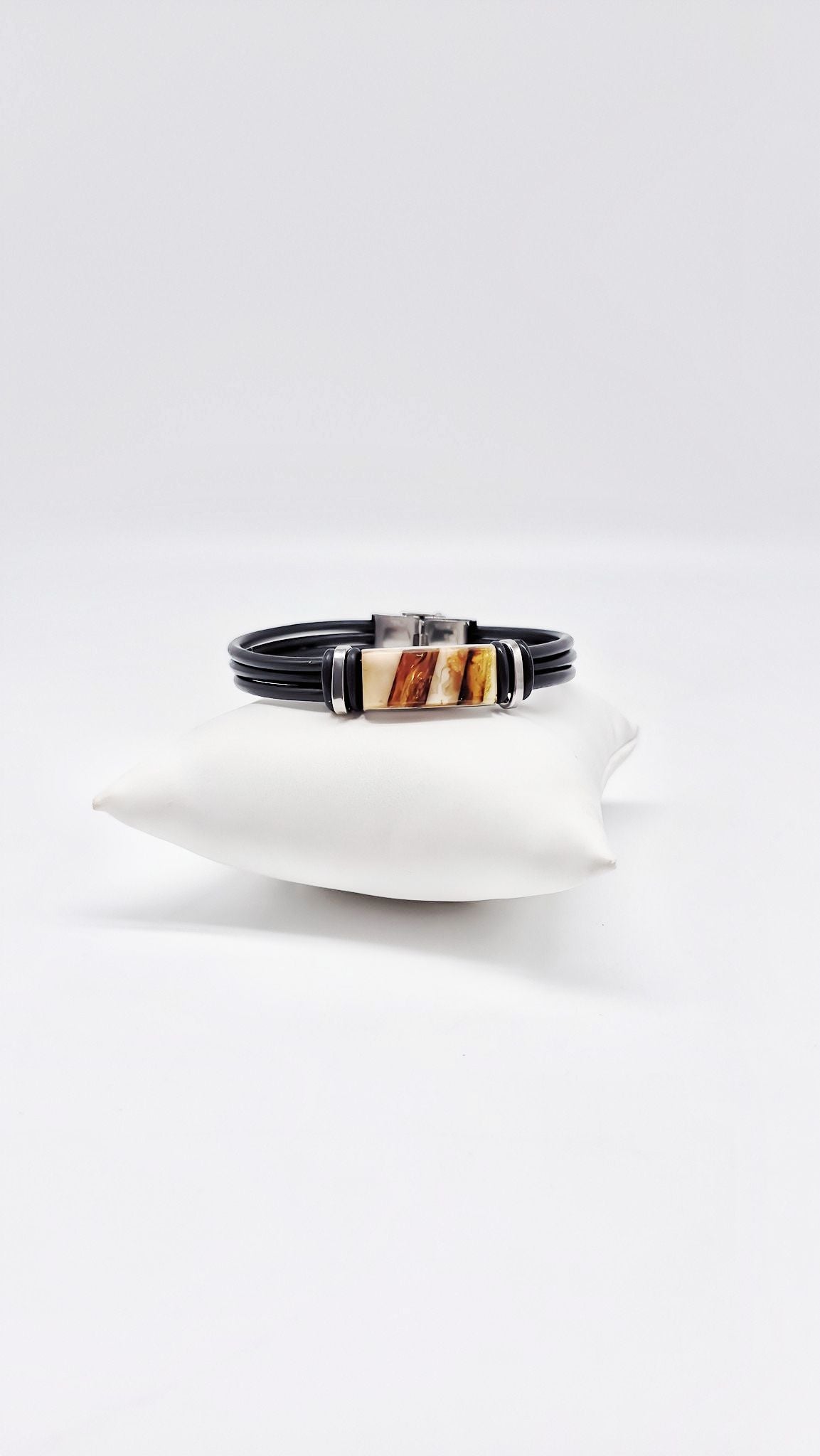 This elegant men's bracelet combines high-quality materials such as leather and amber to create a stylish accessory. The amber insert, with its warm color, lends the bracelet a natural yet luxurious touch. Robust leather and subtle metal accents make it a durable companion for any occasion—whether casual or chic. An ideal gift for men who value individuality and style. This handmade bracelet is the perfect accessory for the modern man.