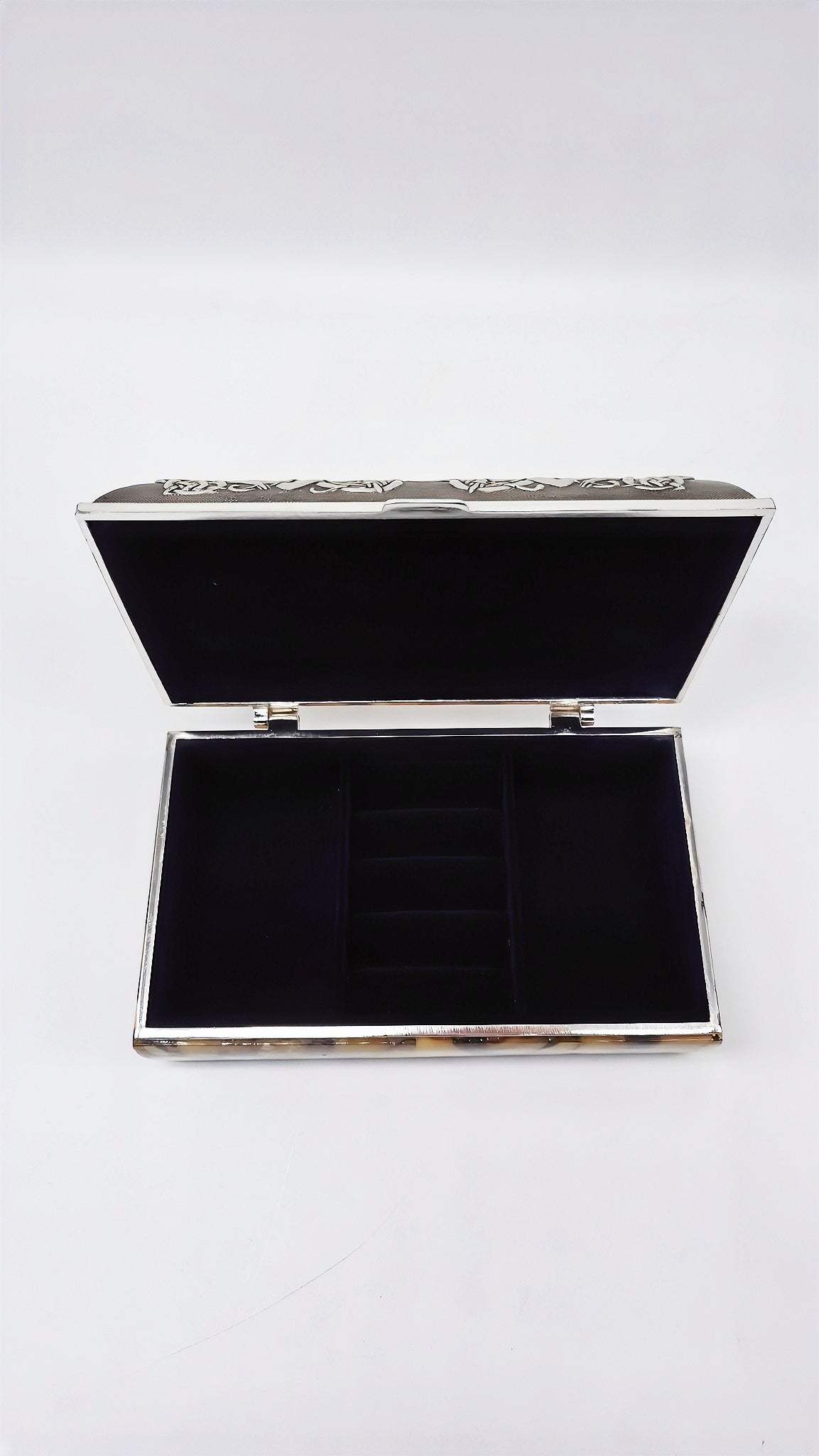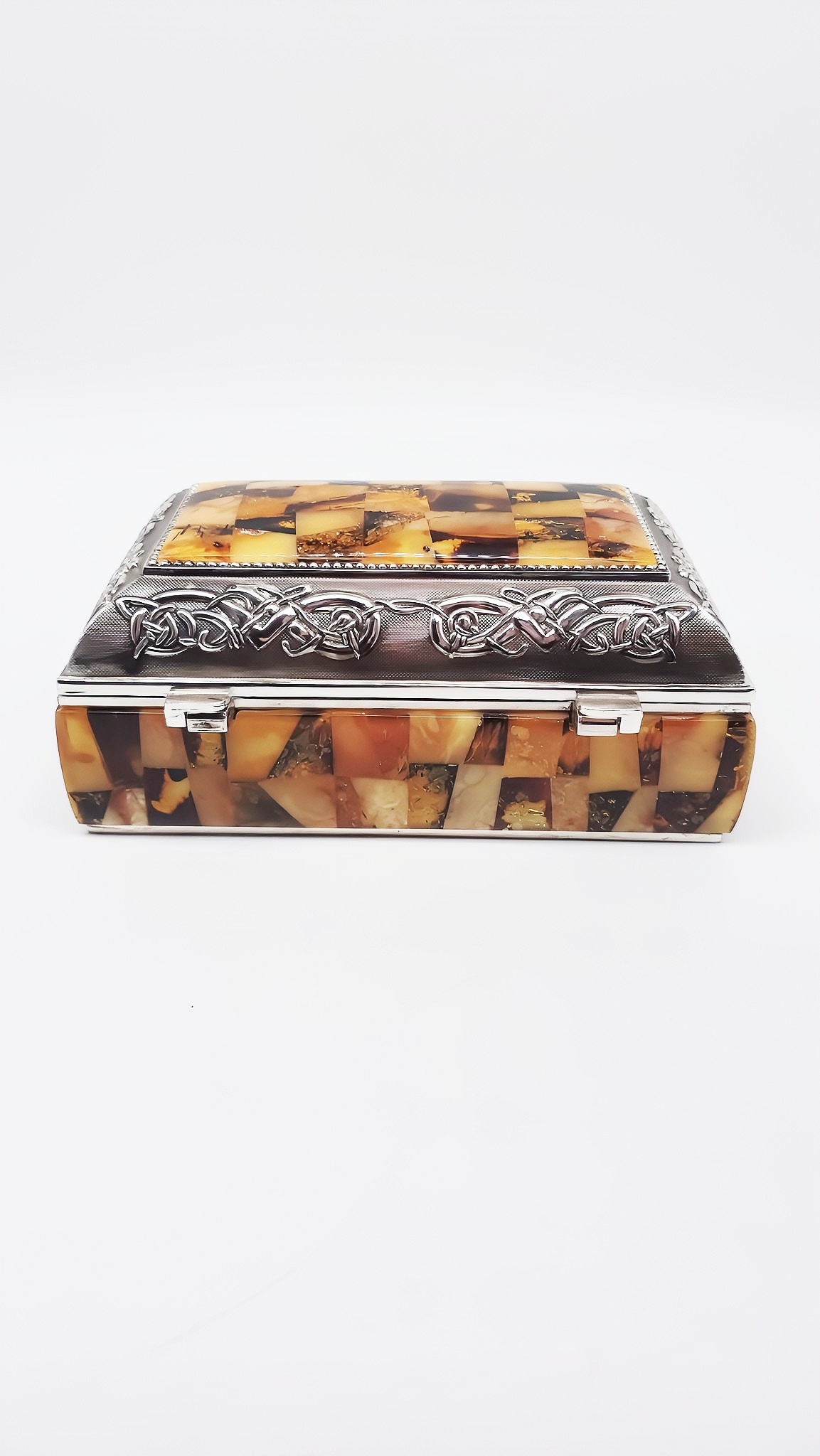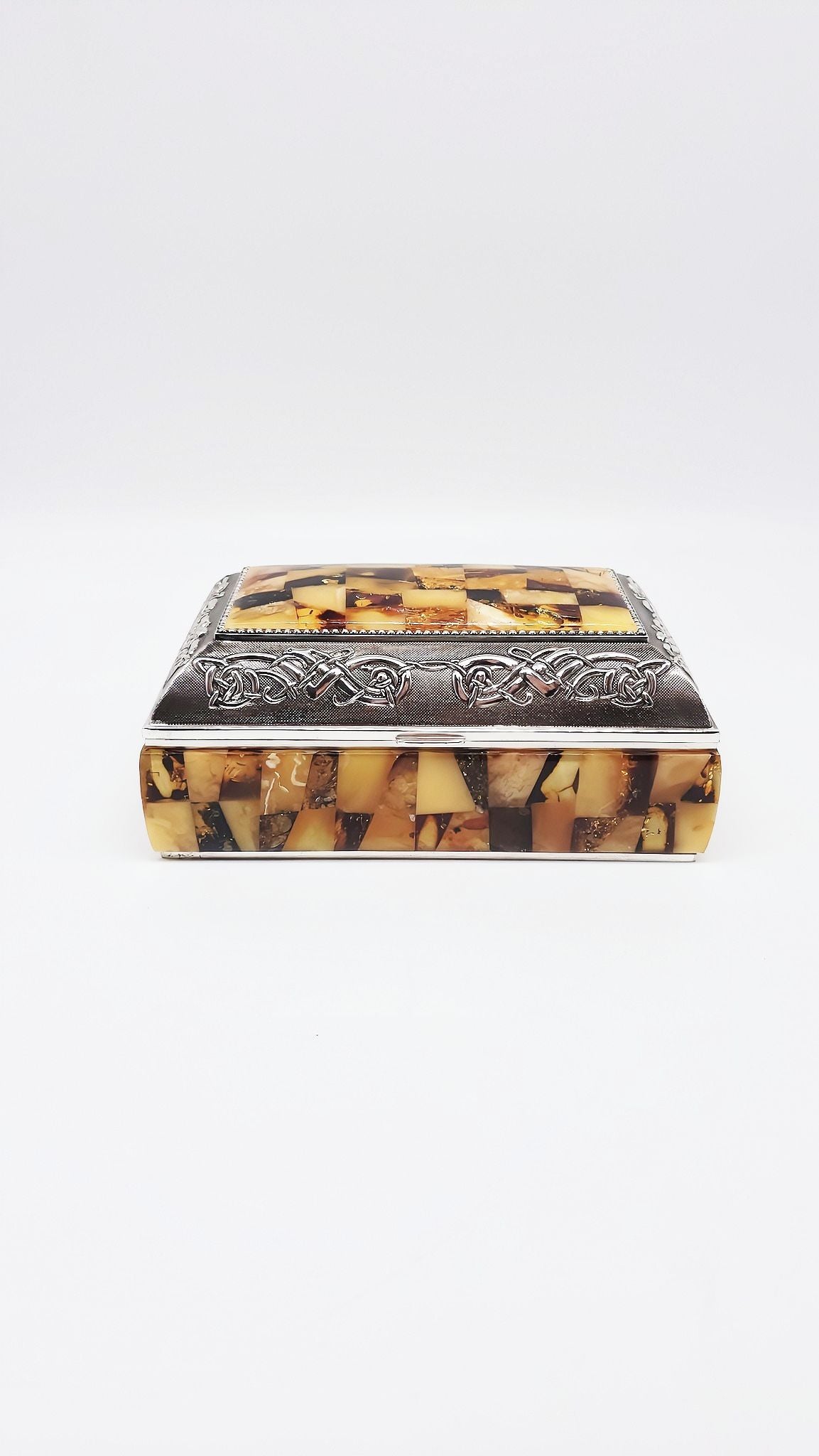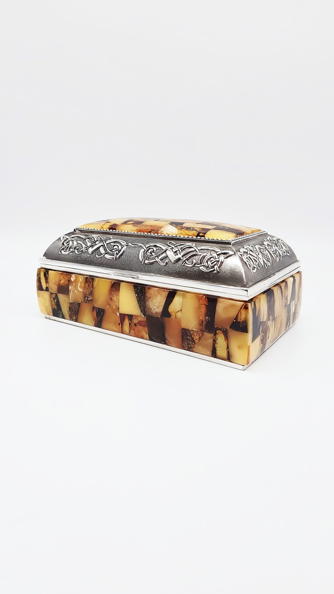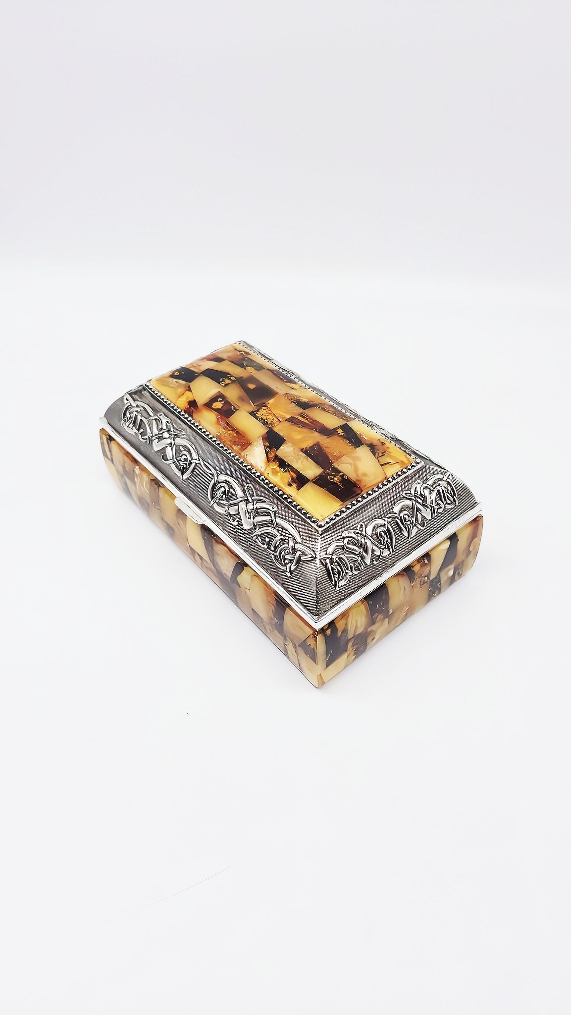 This luxurious jewelry box combines timeless elegance with natural beauty. The box is set with genuine amber, whose warm hues and natural grain make each piece unique. The electroplated metal coating provides a sophisticated shine and protects the artfully engraved patterns.