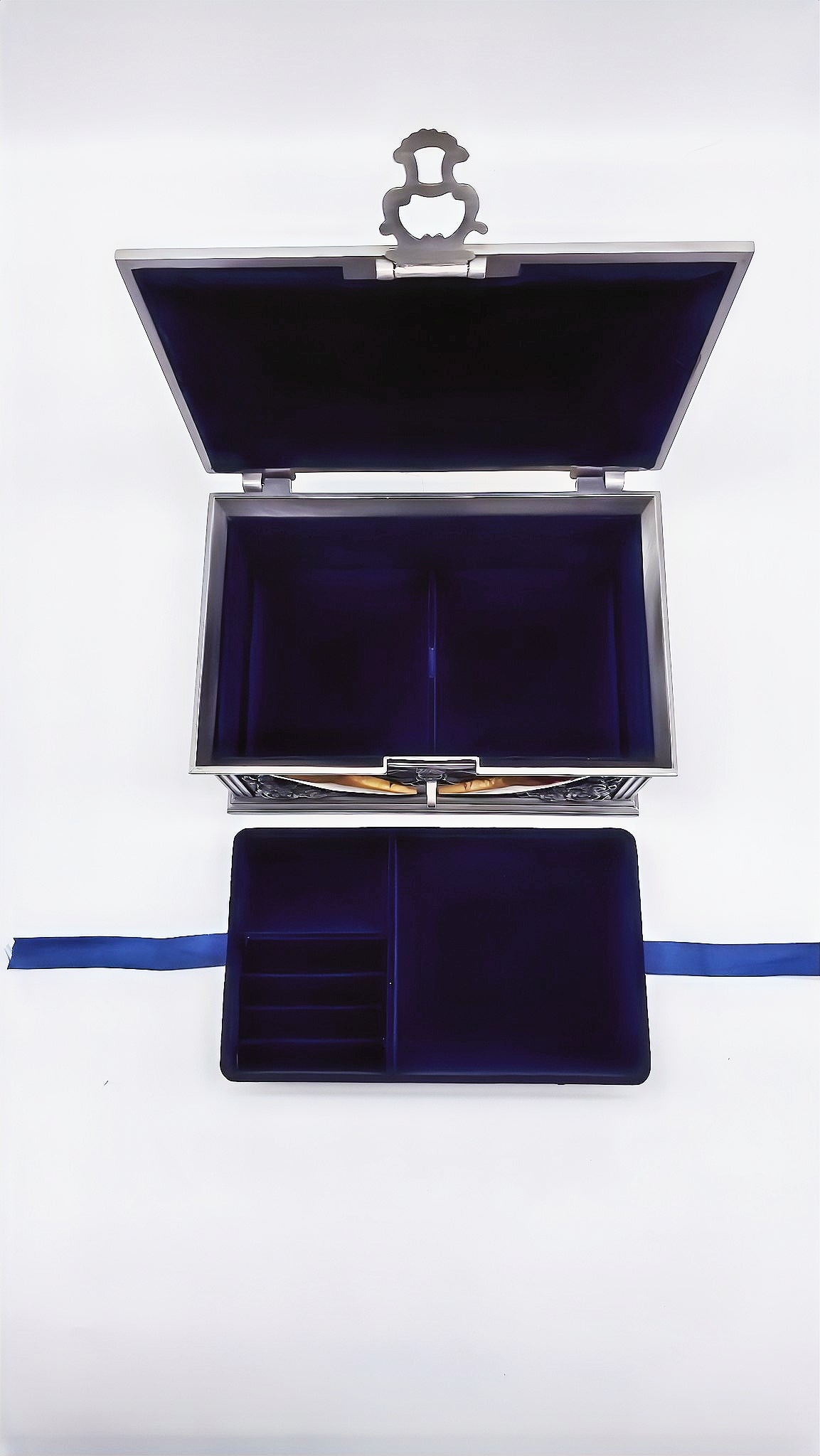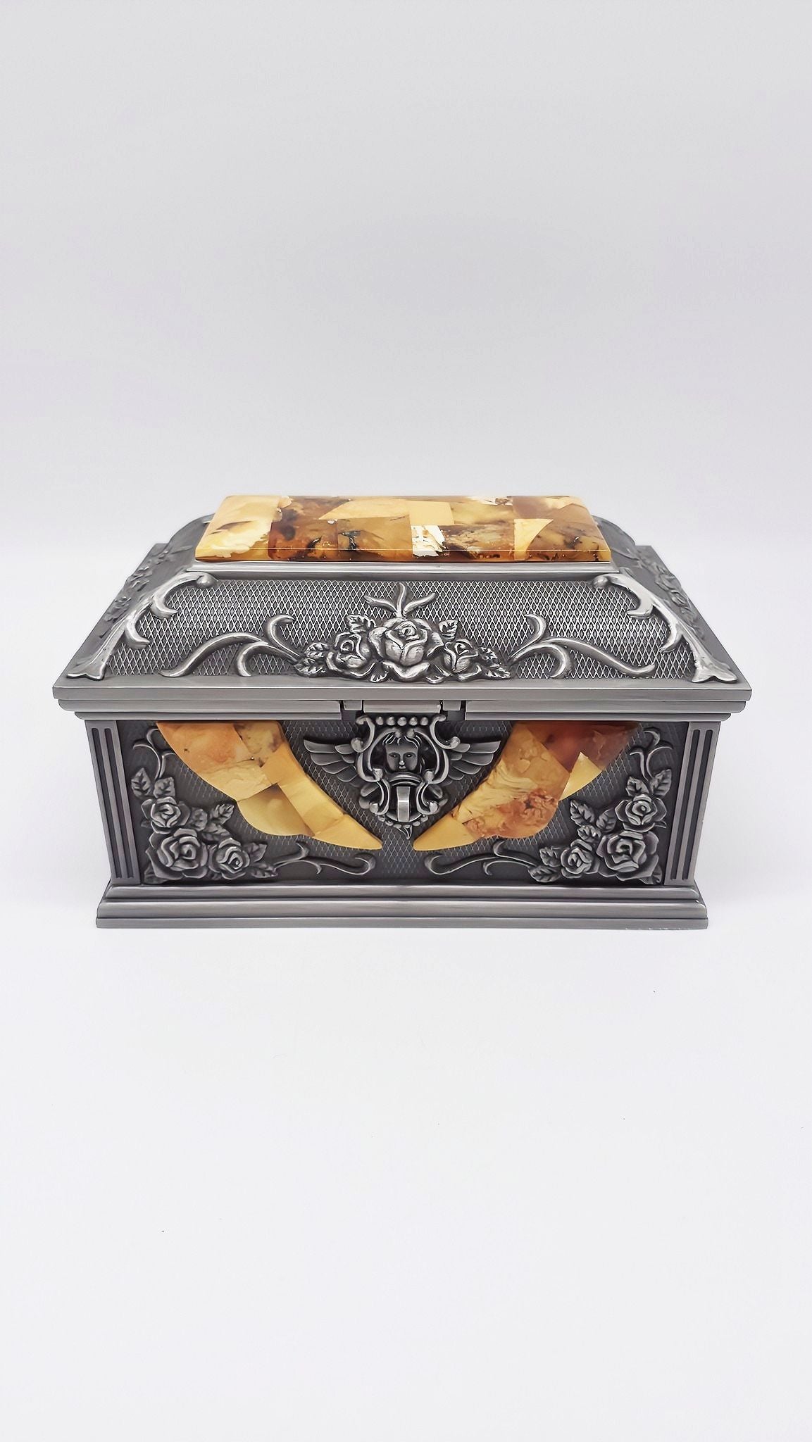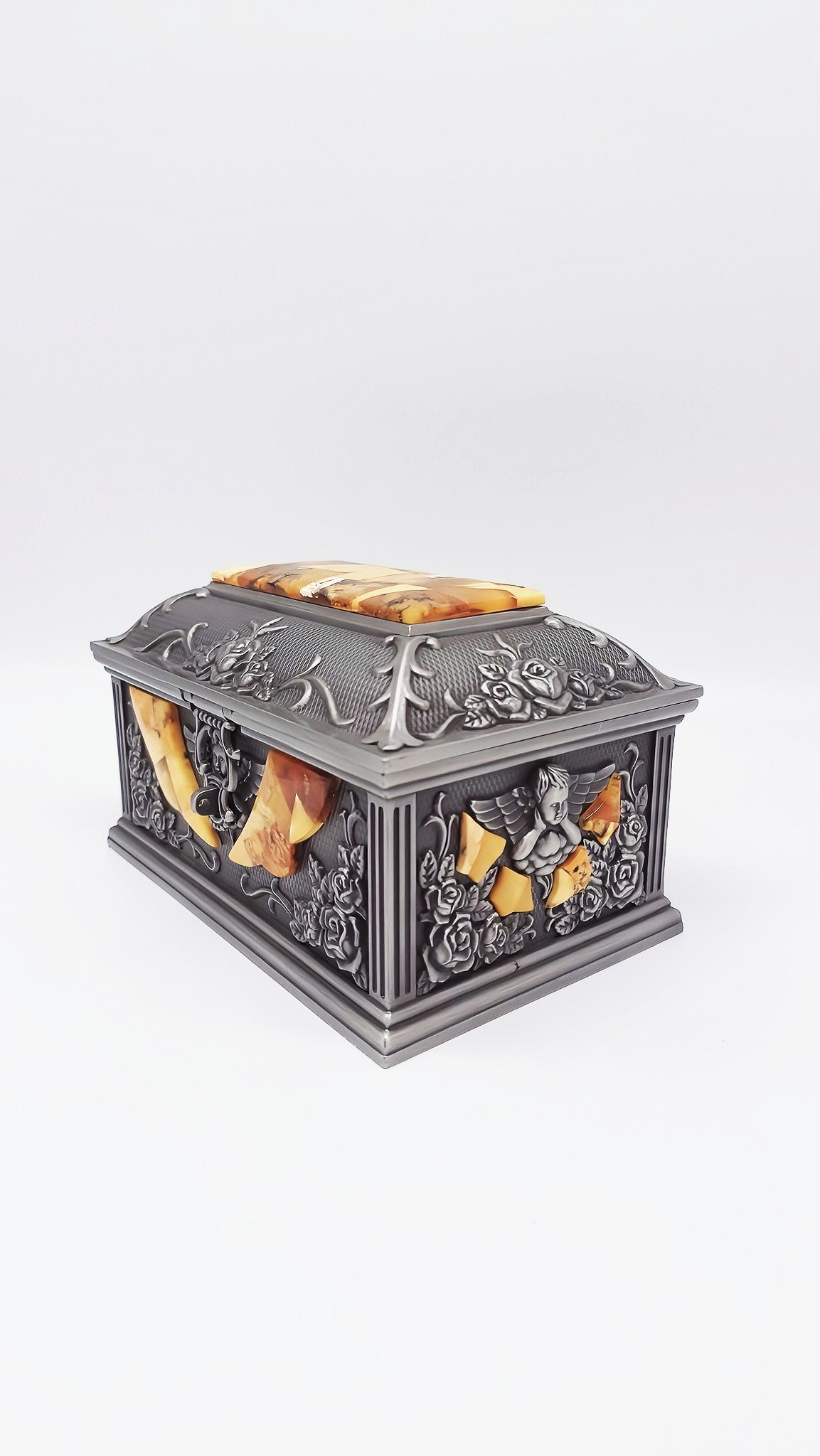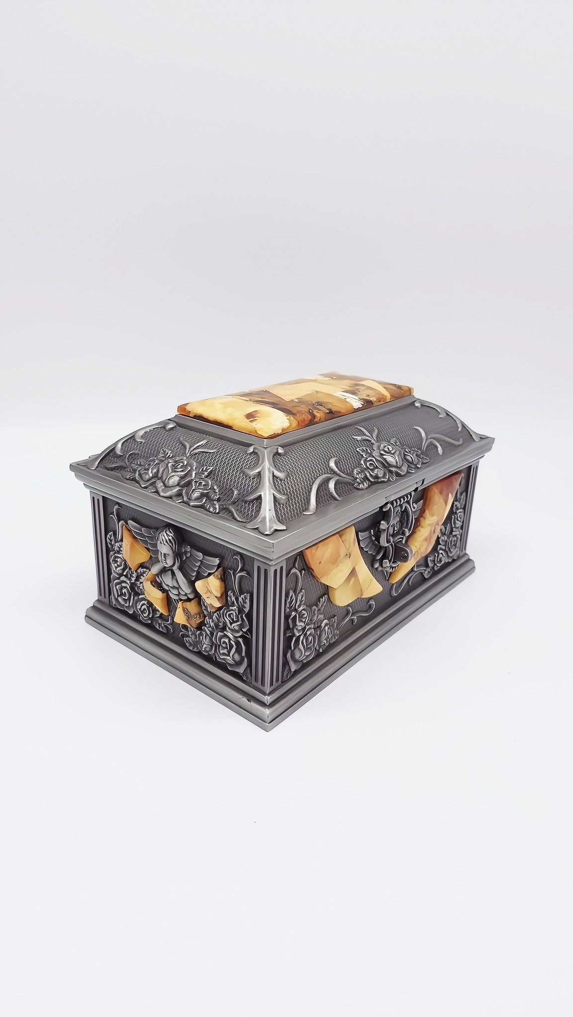 This high-quality, two-tiered jewelry box with genuine amber combines elegance and functionality in a unique design. The artistic decoration with orange-yellow amber inlays and elaborately crafted silver ornaments lends it a luxurious charm. The well-designed interior features two large main compartments on the lower level, a large main compartment on the upper level, a special ring compartment, and another small compartment for delicate jewelry . Measuring 11.6 cm long, 18 cm wide, and 11 cm high, it's ideal for the safe storage of valuable accessories or as a stylish gift idea.