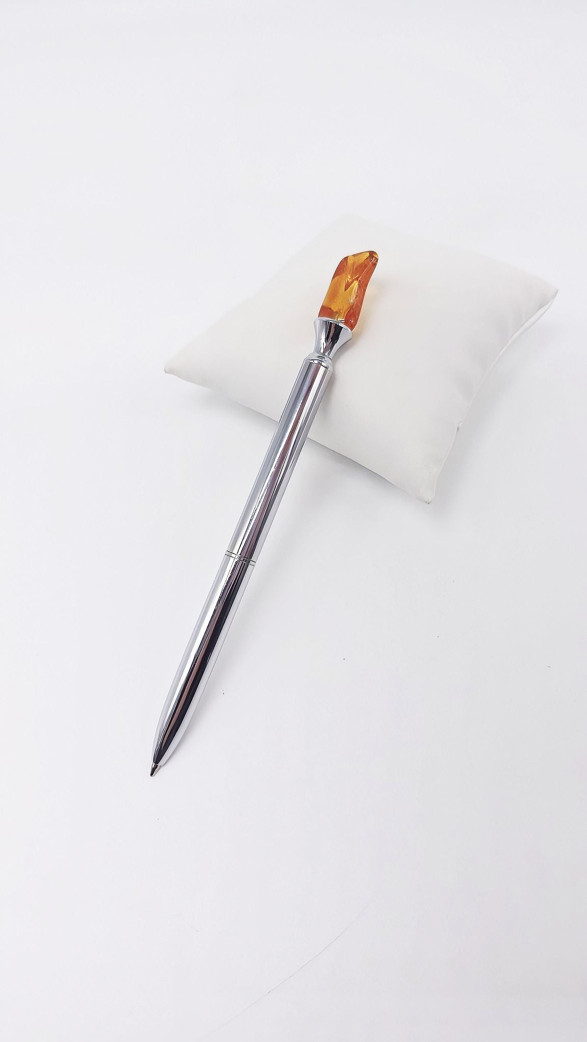 This unique ballpoint pen combines modern design with the natural elegance of genuine amber. The sparkling amber on the grip provides a luxurious finish that makes the pen a real eye-catcher. Ideal as a special gift for business partners, colleagues, or for lovers of stylish writing instruments. Functional and aesthetically pleasing – this ballpoint pen is the perfect combination of craftsmanship and everyday practicality.