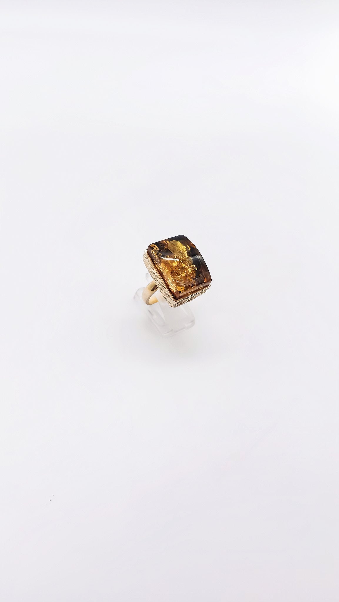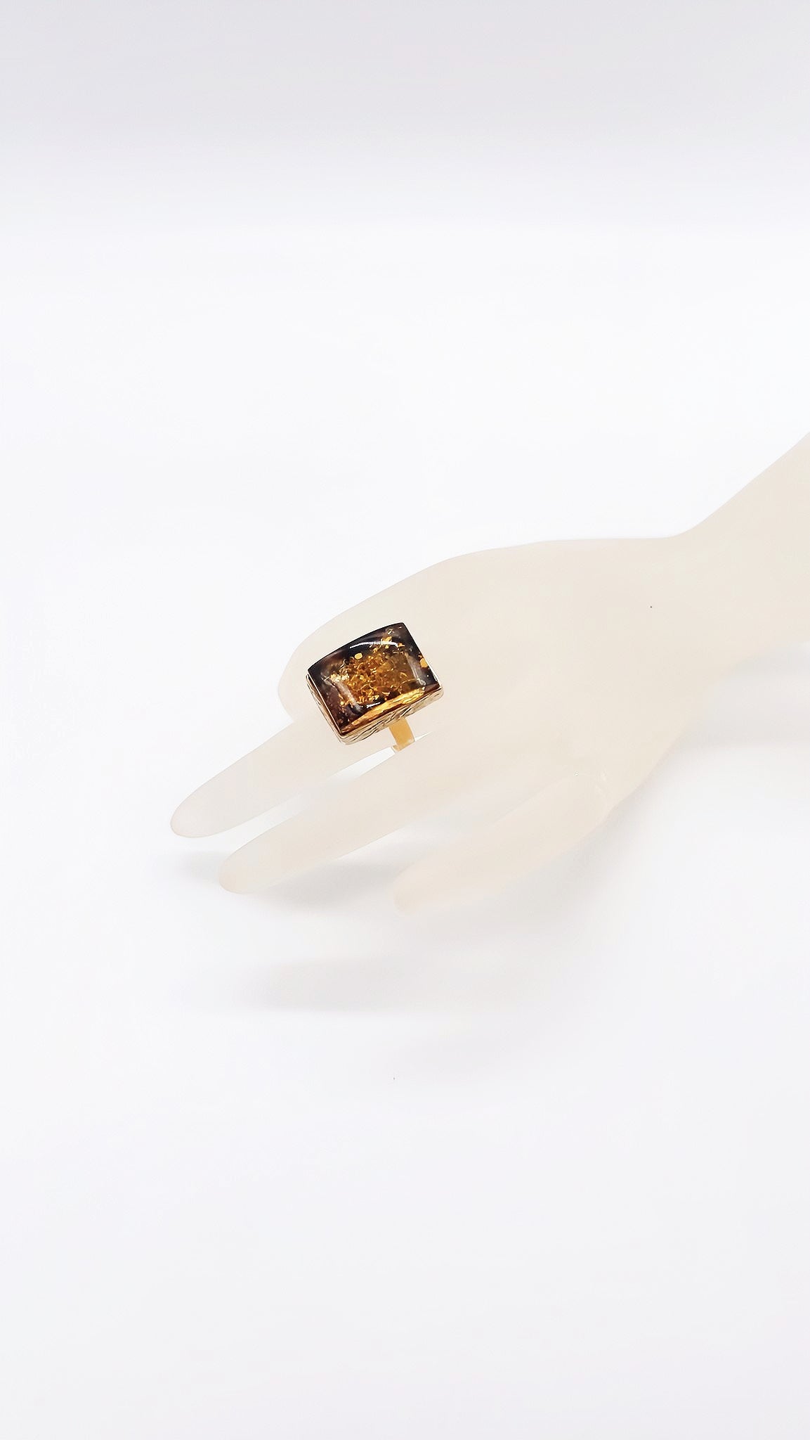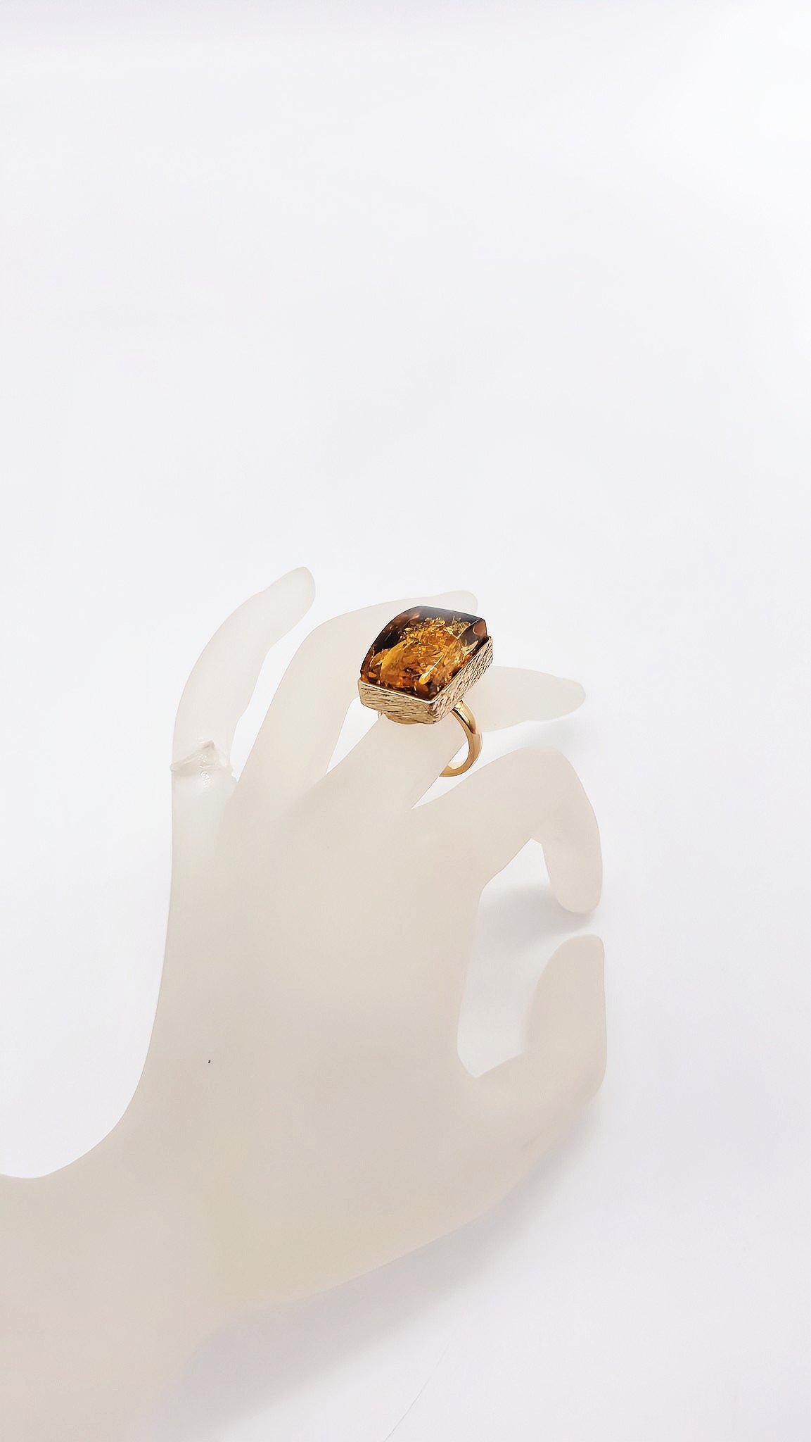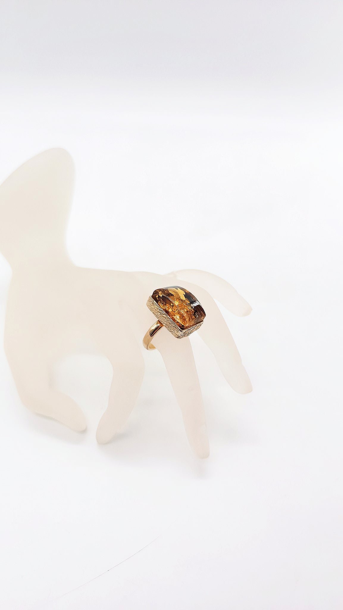 This stunning ring, crafted from gold-plated 925 sterling silver, is a true jewelry highlight. The rectangular, faceted amber radiates warm golden tones, bringing the natural inclusions within to life. A unique design for women who appreciate the beauty of nature and a touch of luxury. Whether as a gift for a loved one or as a statement piece for yourself, this ring adds a very special touch to any look. Ideal for every occasion, from everyday elegance to special celebrations.