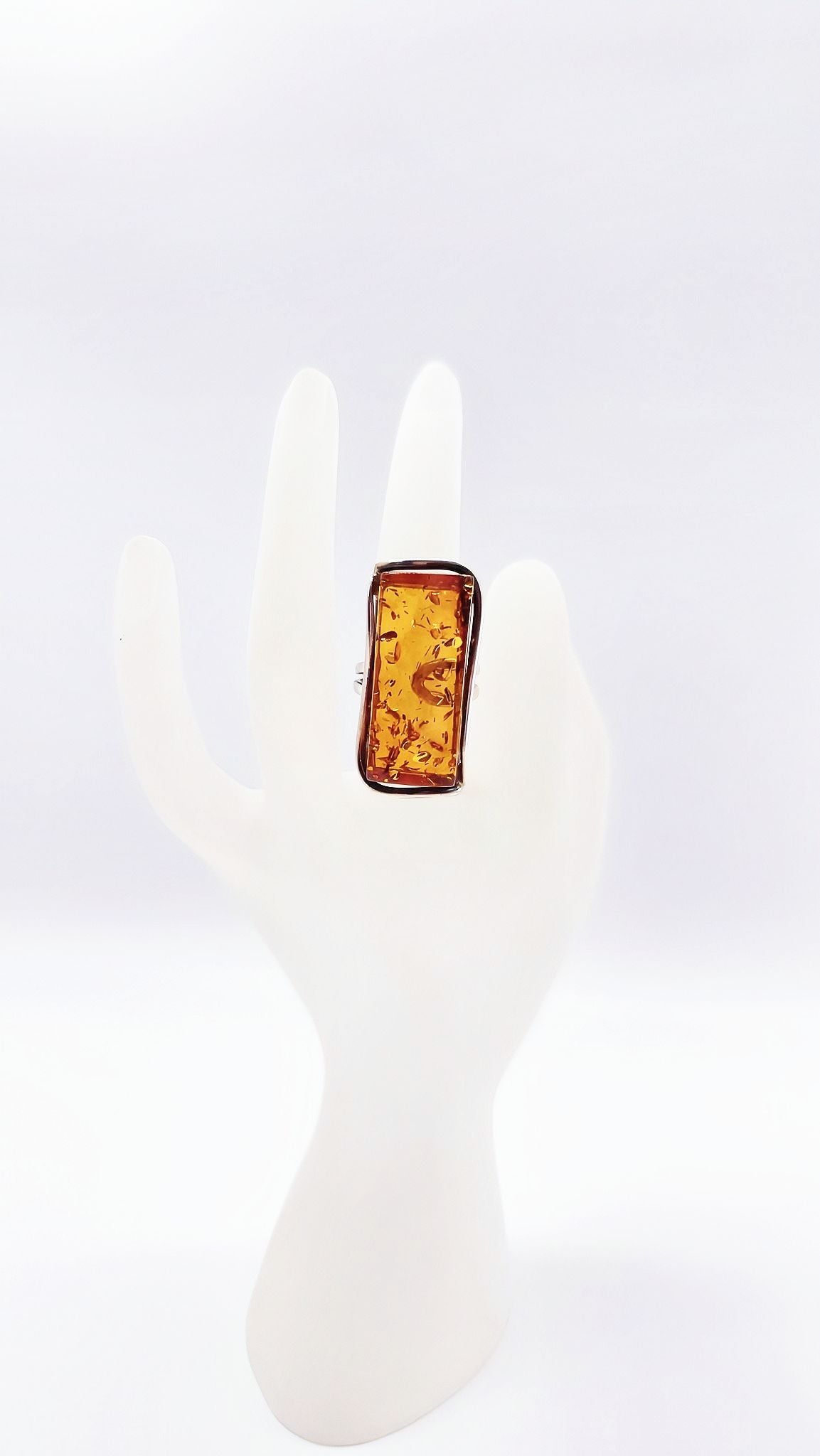 This artfully crafted 925 sterling silver ring stands out with its curved design, which perfectly highlights the luminous warmth of the orange amber. The natural grain of the stone and the curved silver setting lend the piece a unique character. Thanks to its adjustable size, the ring offers maximum comfort. This handcrafted, one-of-a-kind piece is suitable both as a daily companion and as a special gift for lovers of unique jewelry.