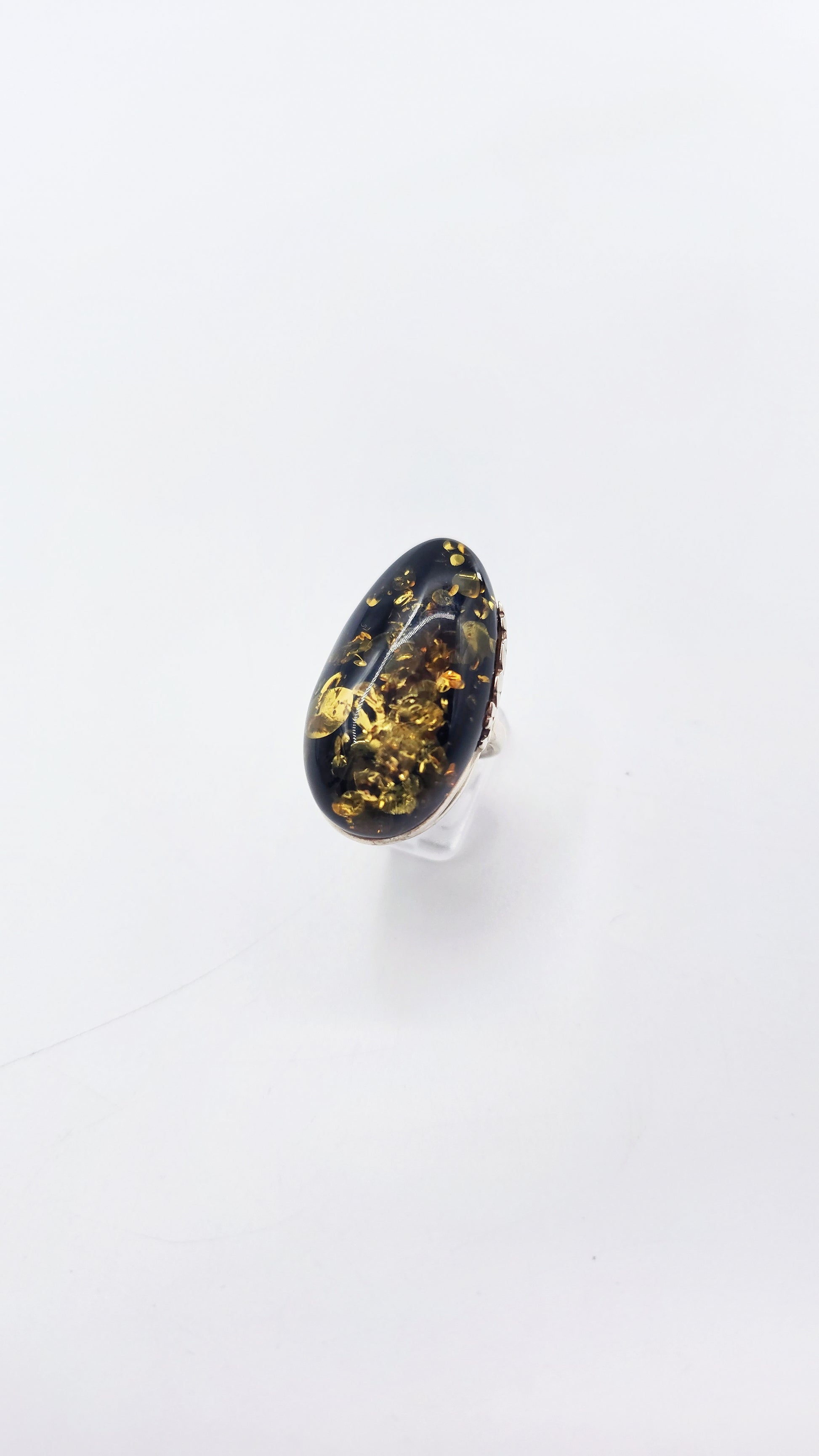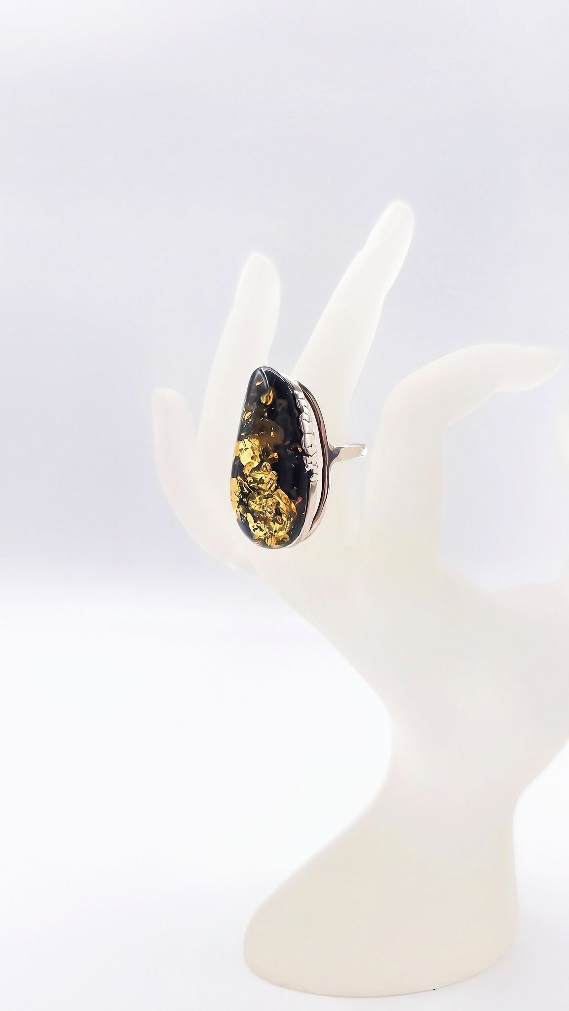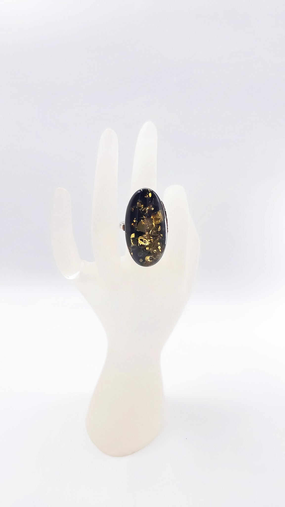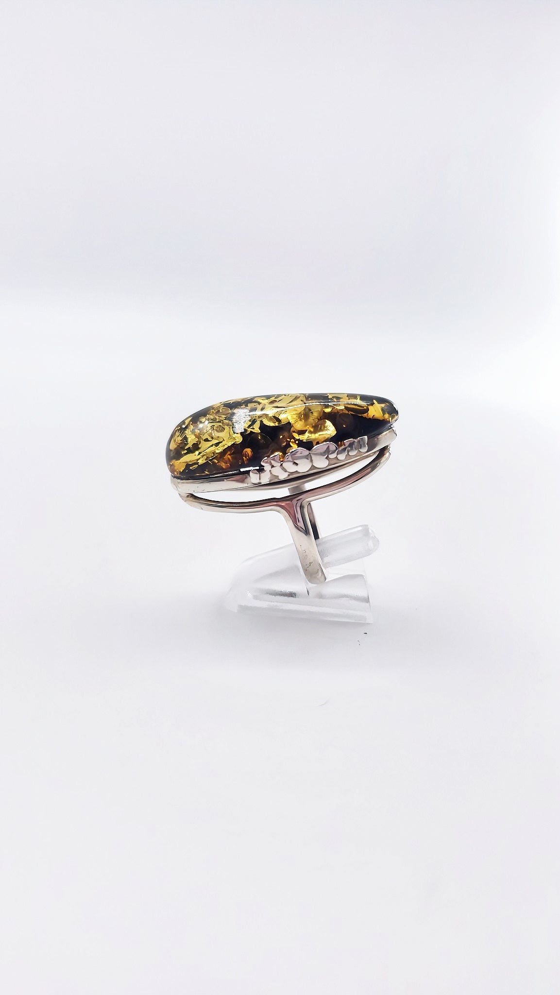 This handcrafted 925 sterling silver ring combines modern design with the natural beauty of green amber. The teardrop-shaped stone, with its shimmering golden-green inclusions, draws all eyes and makes each ring unique. The adjustable size ensures optimal comfort and flexibility. This piece of jewelry is ideal for special occasions or as a stylish gift, combining the beauty of nature with the elegance of silver.