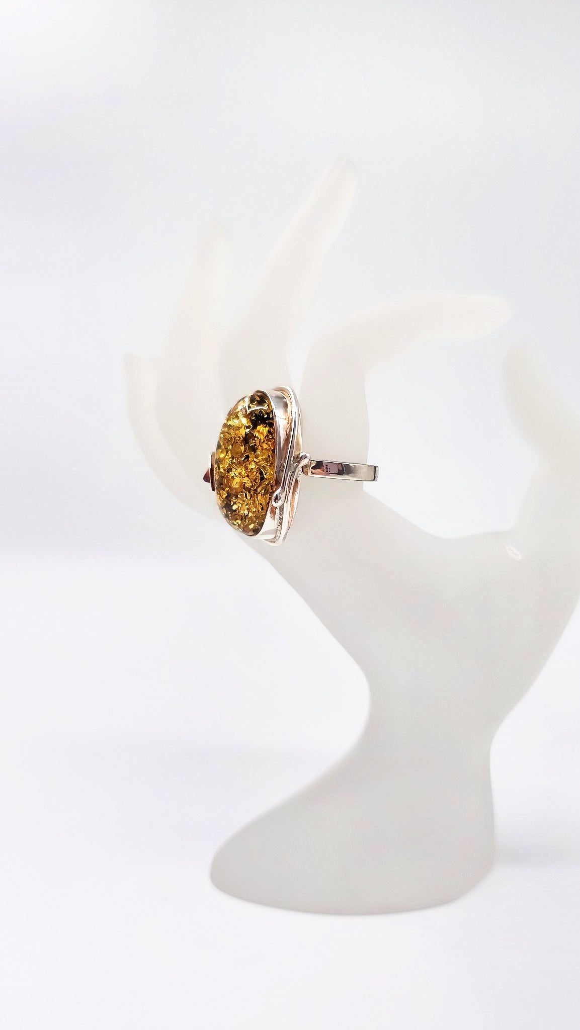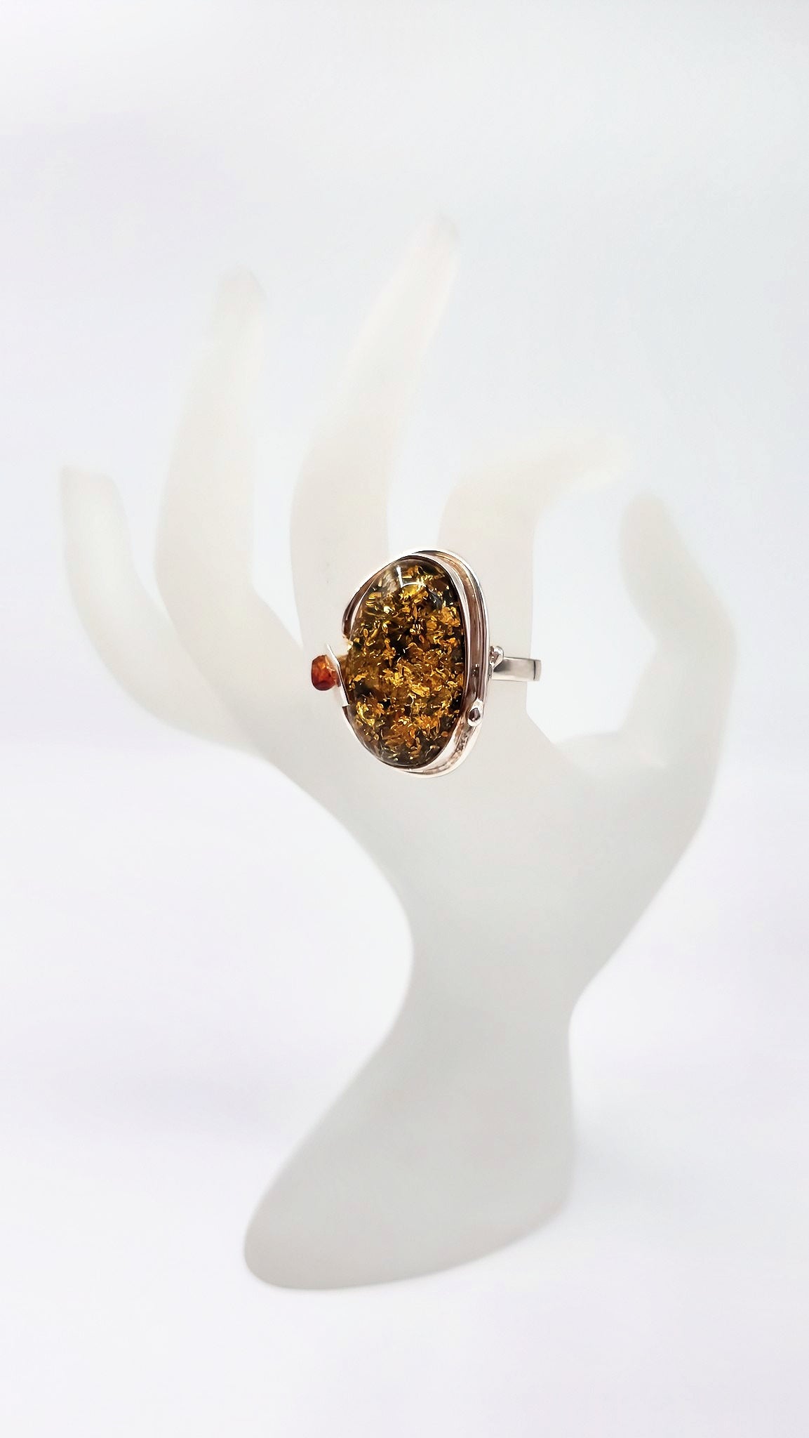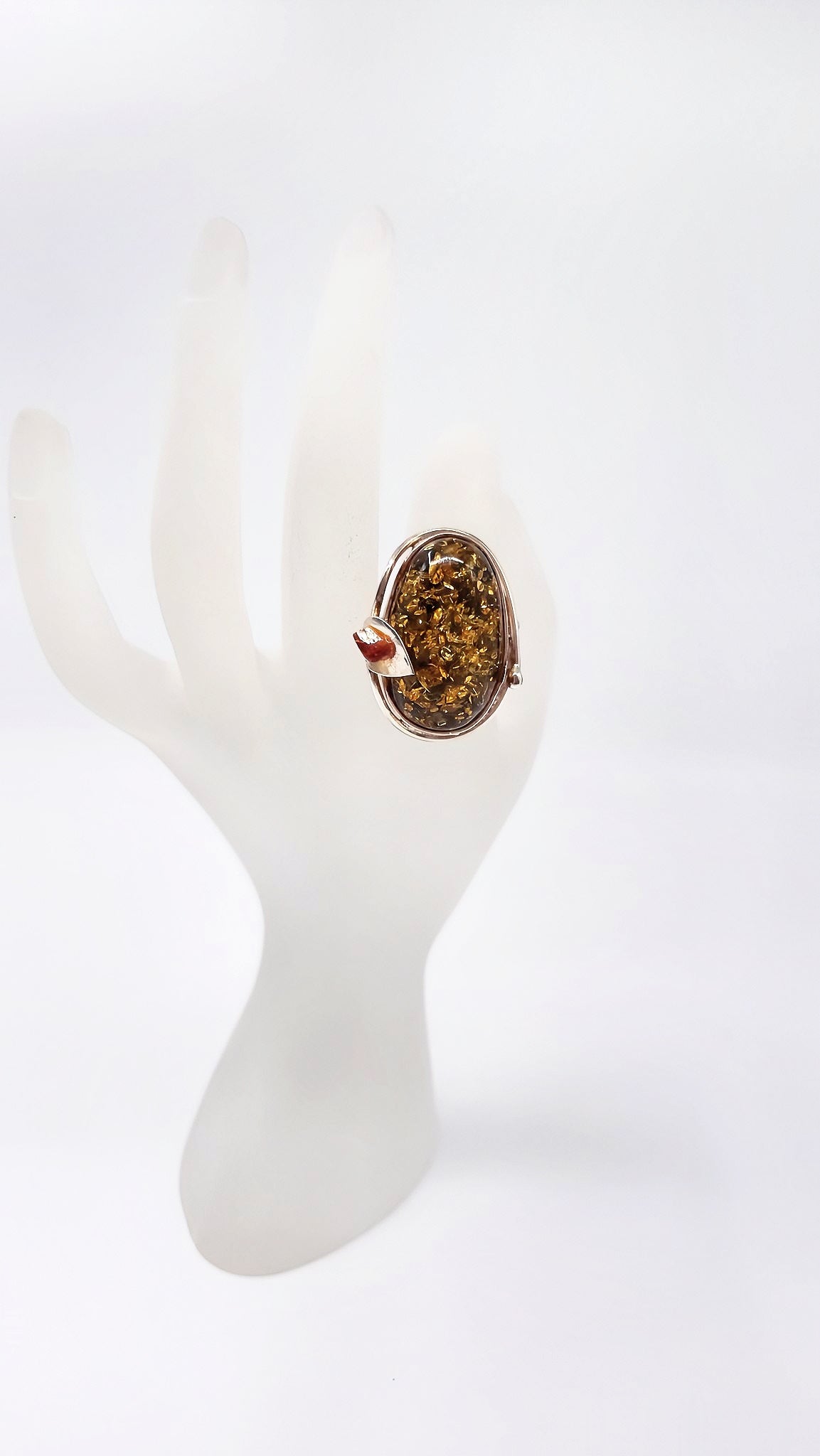 This extraordinary amber ring with a deep green natural stone and an ornate 925 sterling silver setting is truly unique. The asymmetrical shape of the stone, combined with the small amber accent bead, lends this piece of jewelry a captivating elegance. The warm golden-green reflections of the amber perfectly capture the light and emphasize its natural beauty. Thanks to the adjustable size, the ring fits effortlessly on any finger.