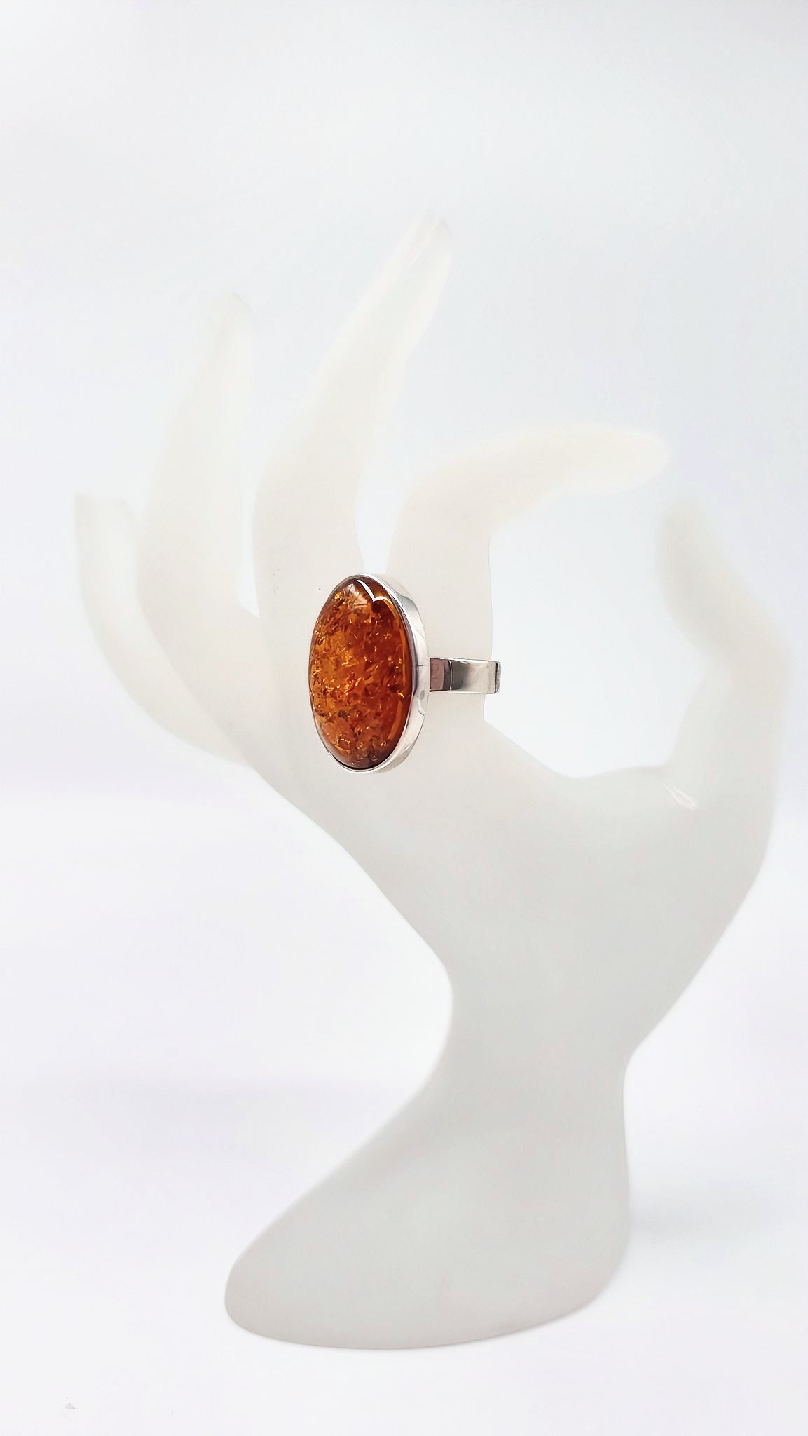 This handcrafted amber ring with a vibrant orange natural stone and 925 sterling silver is an elegant and stylish piece of jewelry. The warm, golden depth of the amber reflects the light in a fascinating way, creating a sophisticated radiance. The silver setting lends the ring a timeless touch, making it the perfect companion for any occasion.