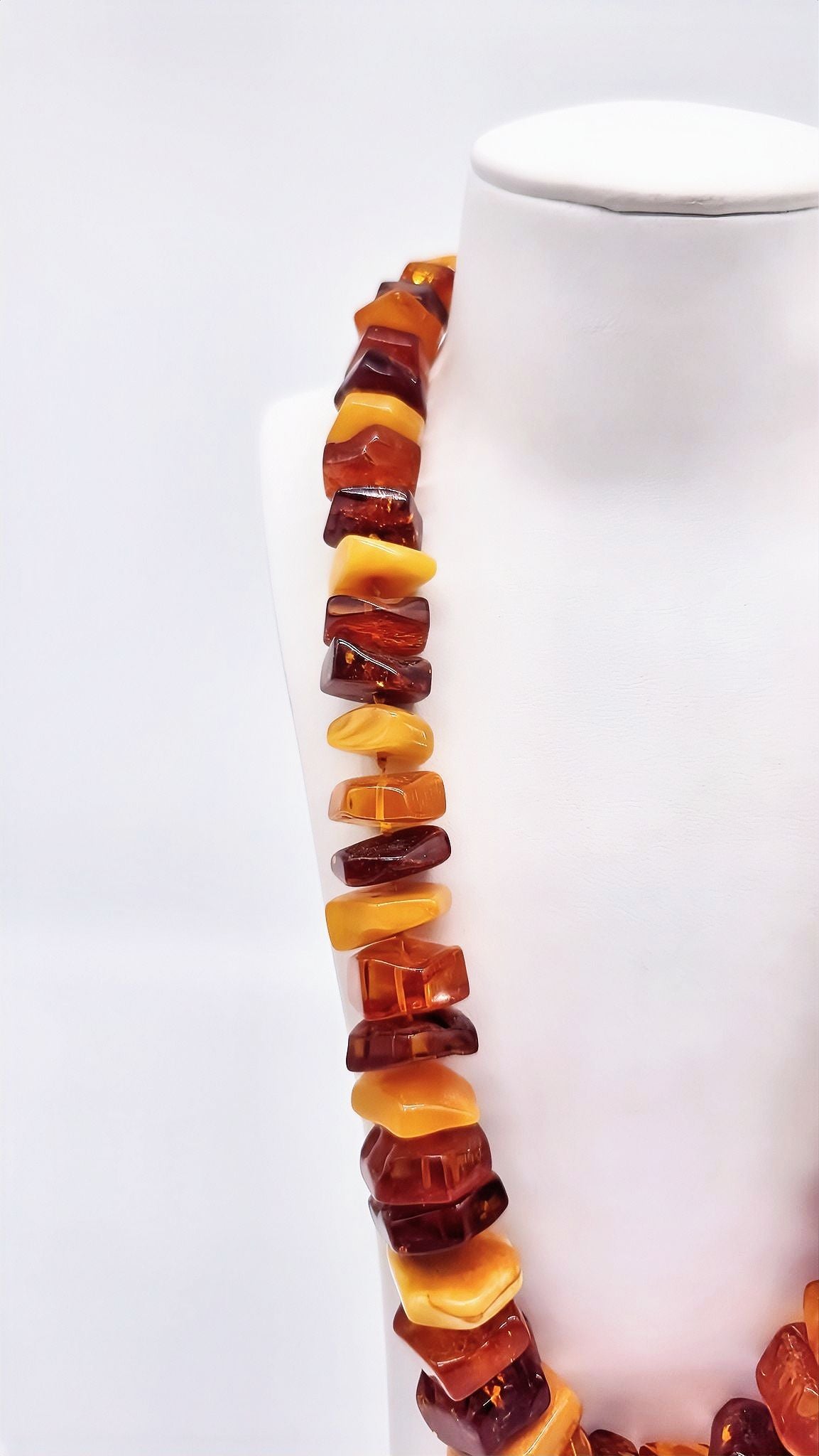 This stunning amber necklace is truly one-of-a-kind, perfectly combining nature and elegance. The large, irregularly cut amber stones display a fascinating array of colors—from deep cognac to warm honey yellow to light butterscotch. Each stone is unique and tells its own story, set in a stylish design. Perfect for women seeking a natural, handcrafted piece of jewelry with special character. This necklace is the ideal gift for lovers of natural stones and exclusive design.