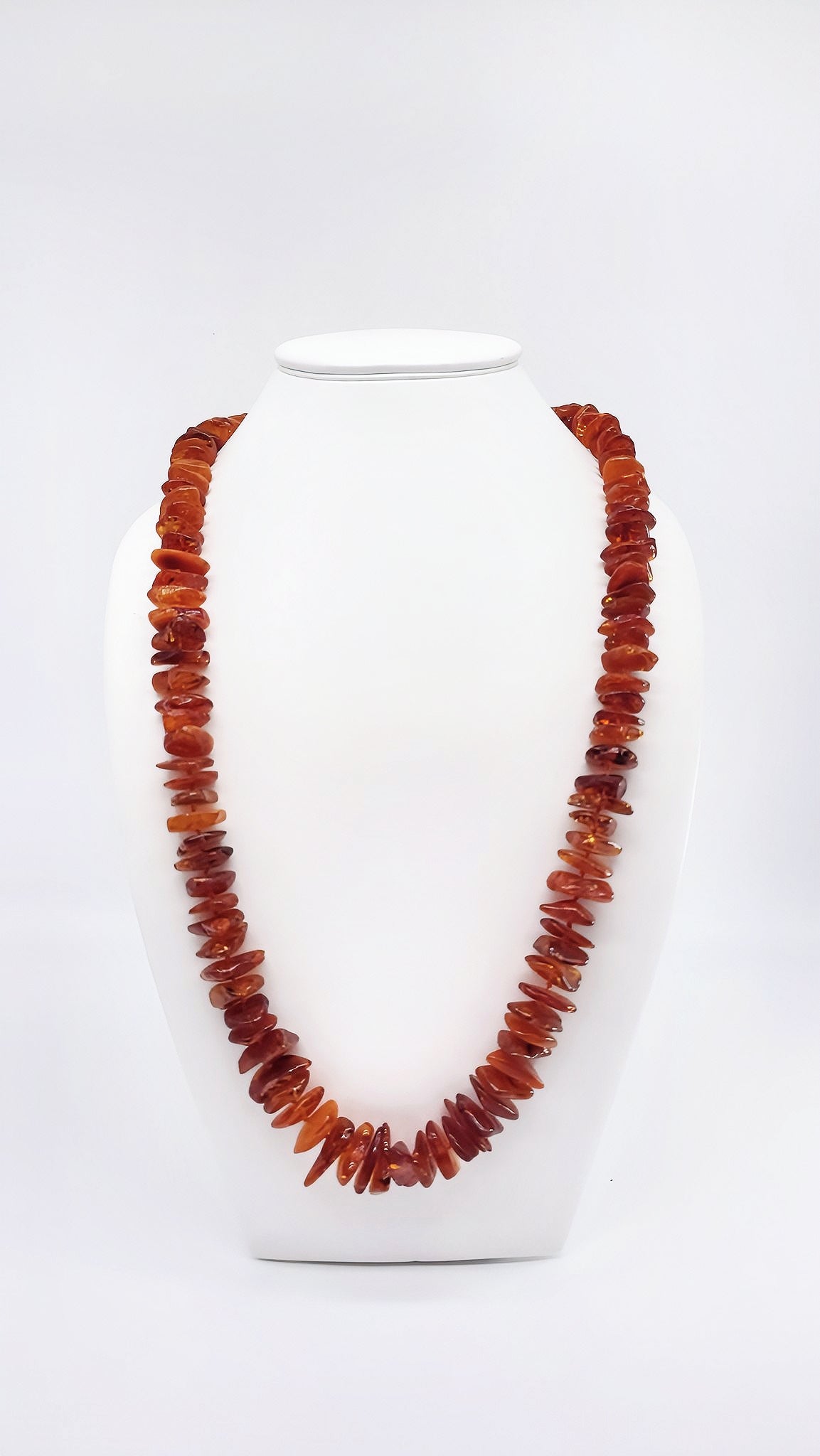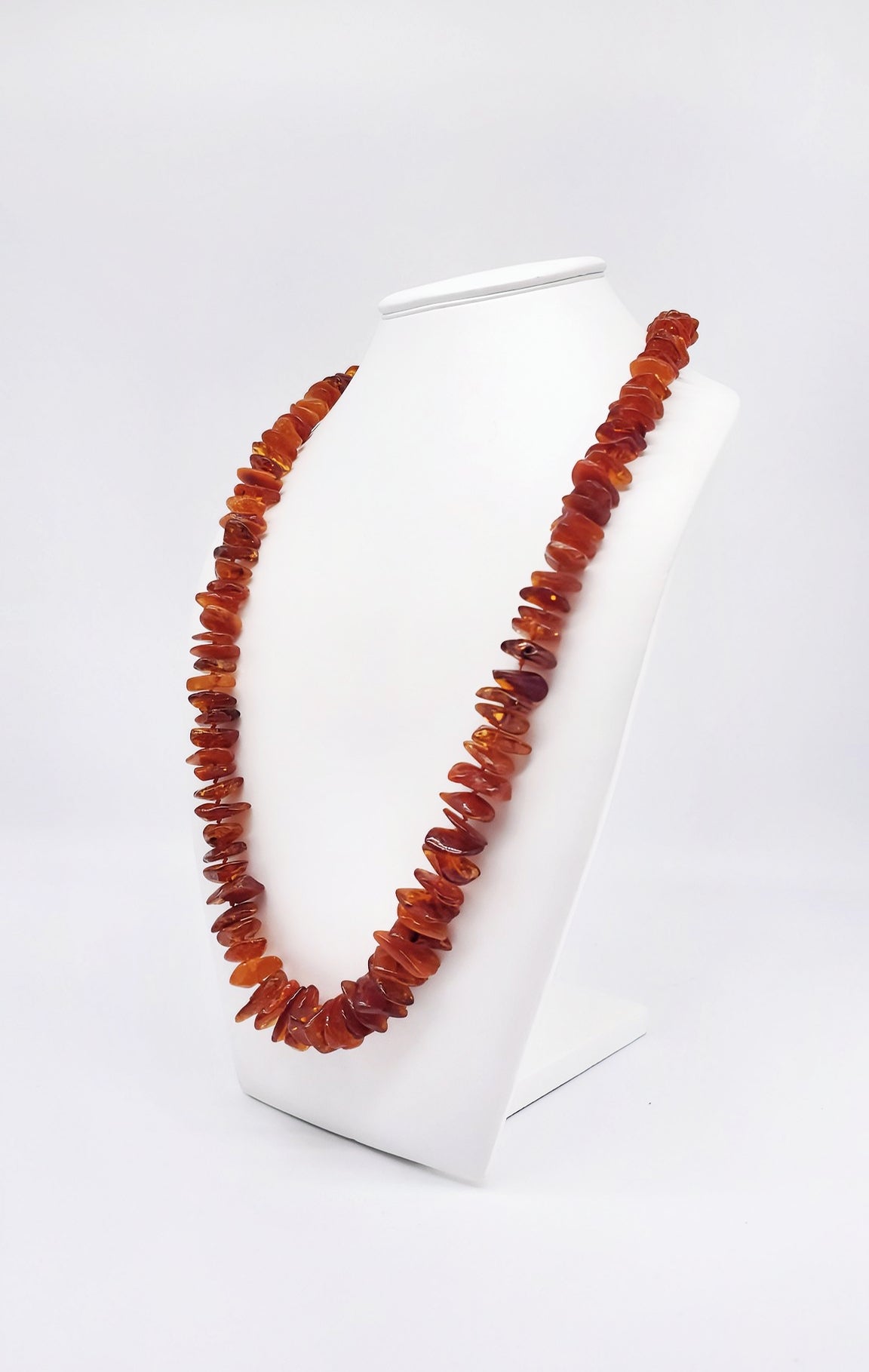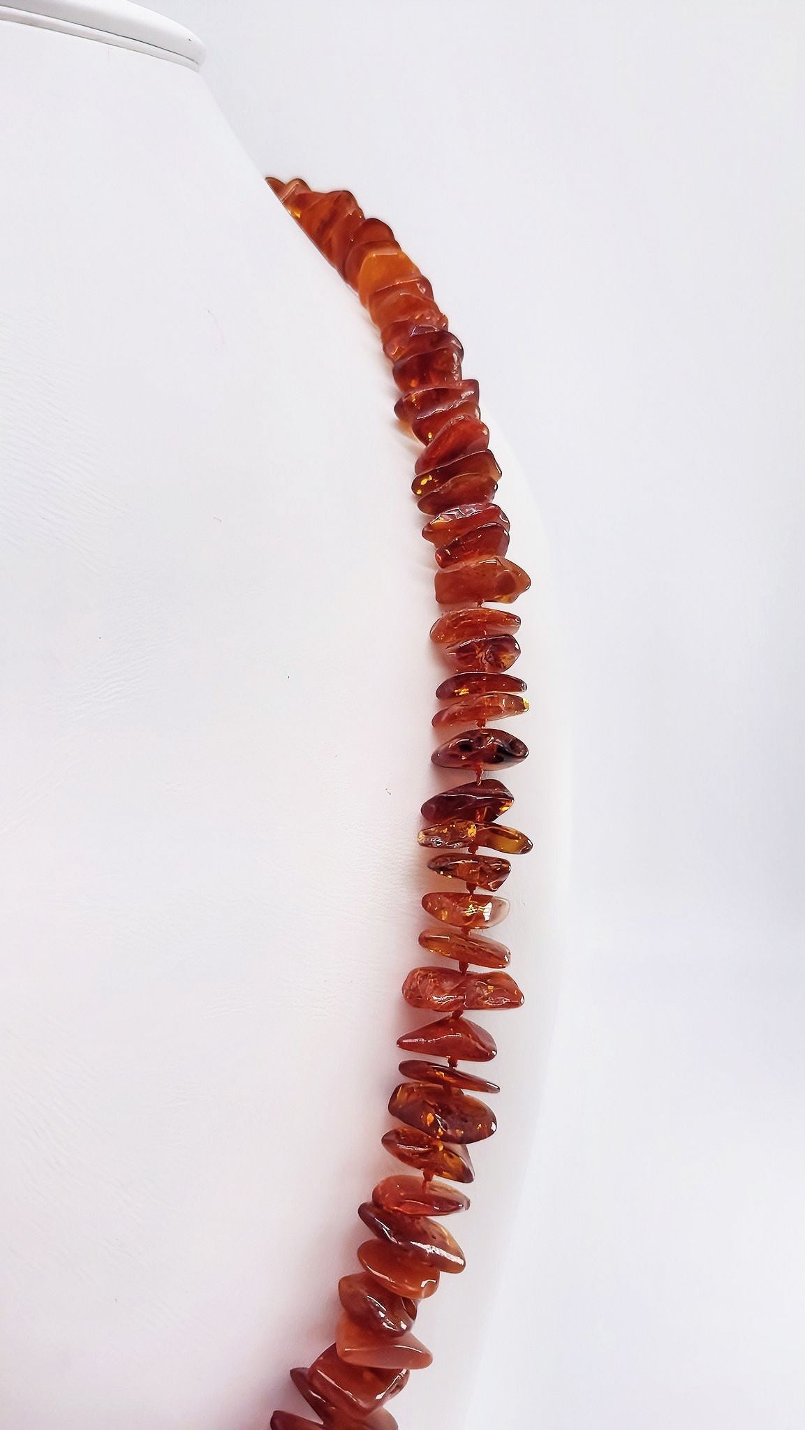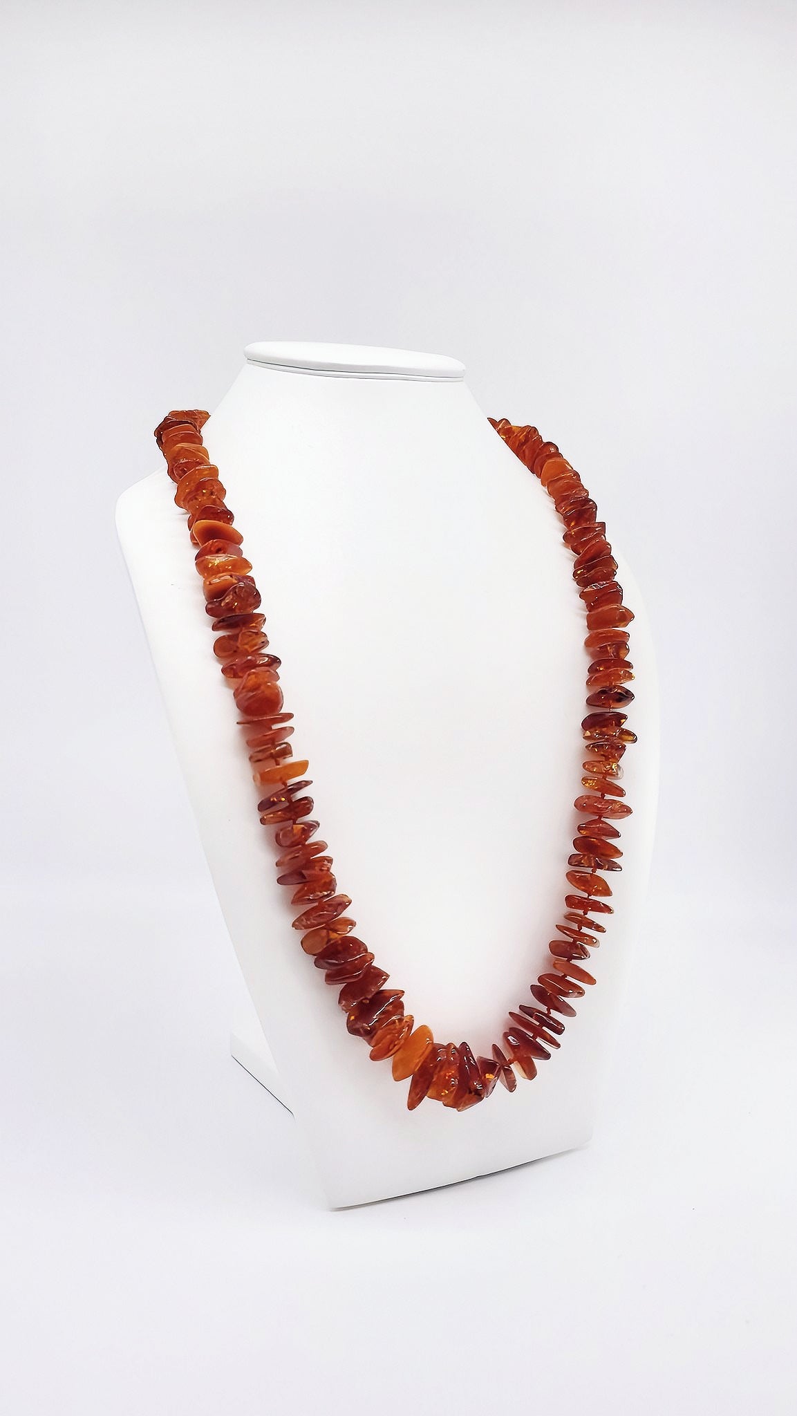 This beautiful, long amber necklace is a unique piece of jewelry that perfectly captures the beauty of nature. The carefully cut and polished amber stones present themselves in warm cognac and honey tones, giving the necklace a particularly sophisticated radiance. Thanks to the natural shape of the stones, the original beauty of the amber is preserved. The length makes it particularly versatile—ideal as statement jewelry or for layering. Perfect for women who value natural materials and high-quality design. A wonderful gift for special occasions!