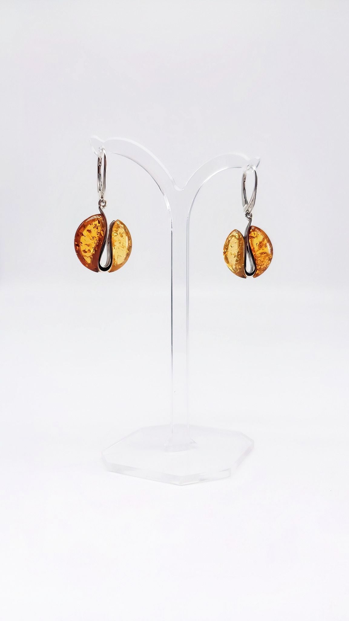 These round amber earrings crafted from 925 sterling silver combine natural beauty with modern design. The split amber stones in warm honey yellow and light orange create a captivating play of colors, perfectly complemented by the elegant silver setting.
