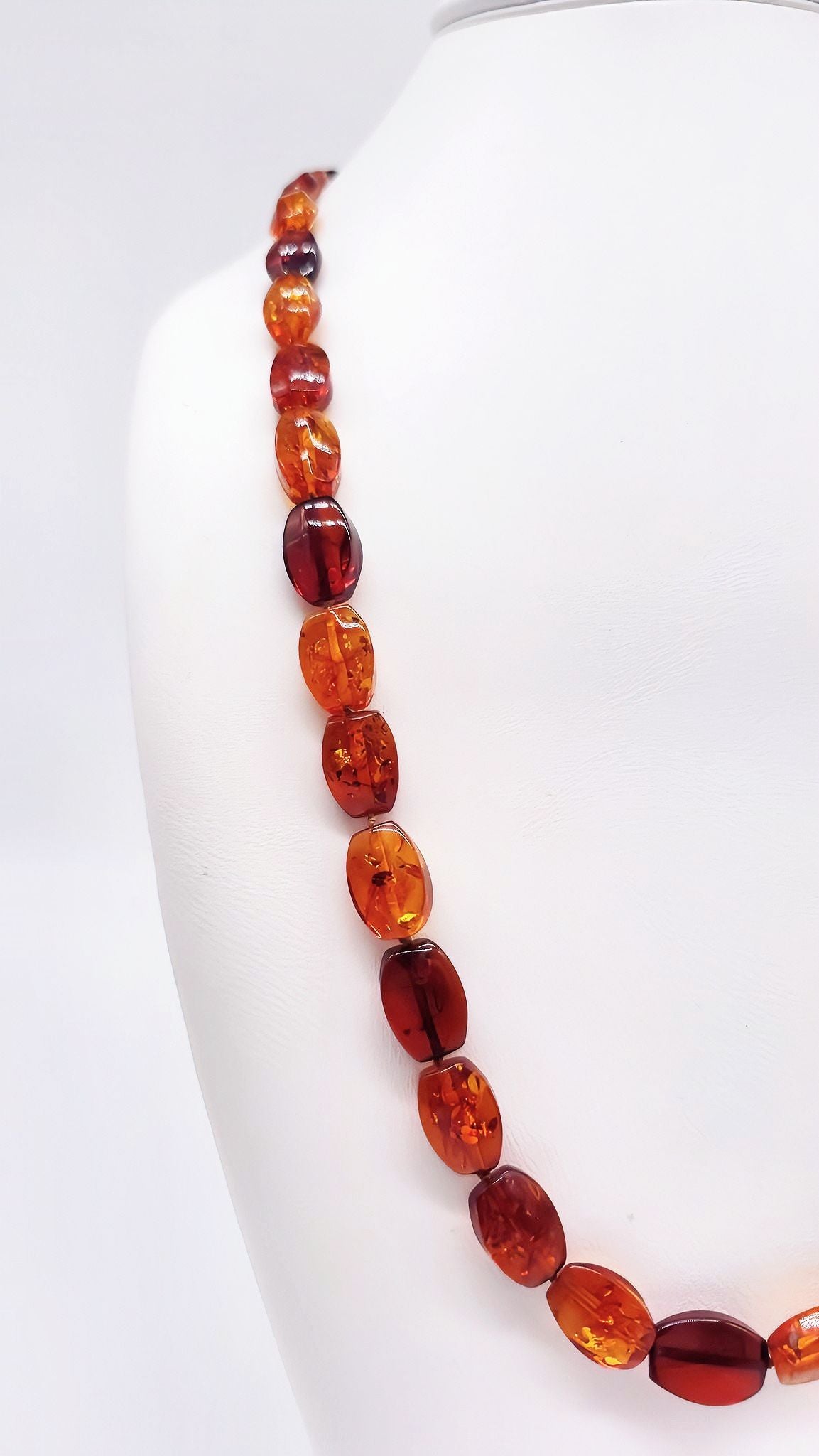 This long amber necklace captivates with its warm, orange radiance and elegant craftsmanship. The oval, polished amber beads perfectly showcase the natural beauty of this unique natural stone. Handcrafted and crafted to the highest quality, this necklace offers a stylish look for every occasion. Thanks to its length, it can be combined in a variety of ways—whether as a statement piece or a subtle highlight. Ideal for women who appreciate exclusive and natural jewelry, it also makes a wonderful gift for special occasions.