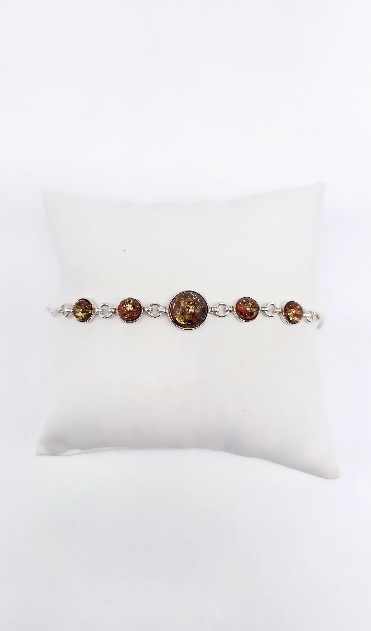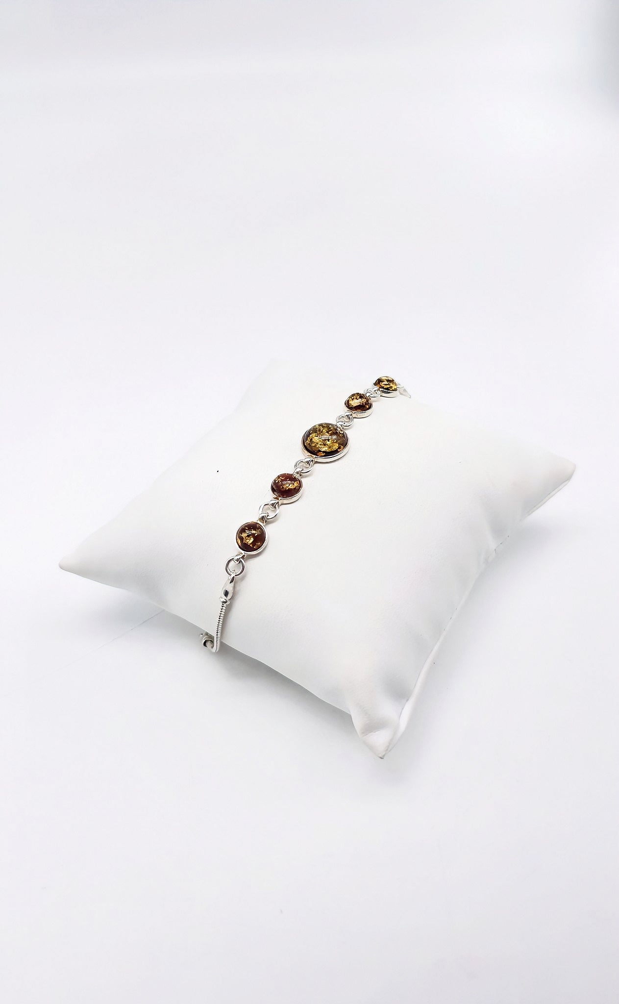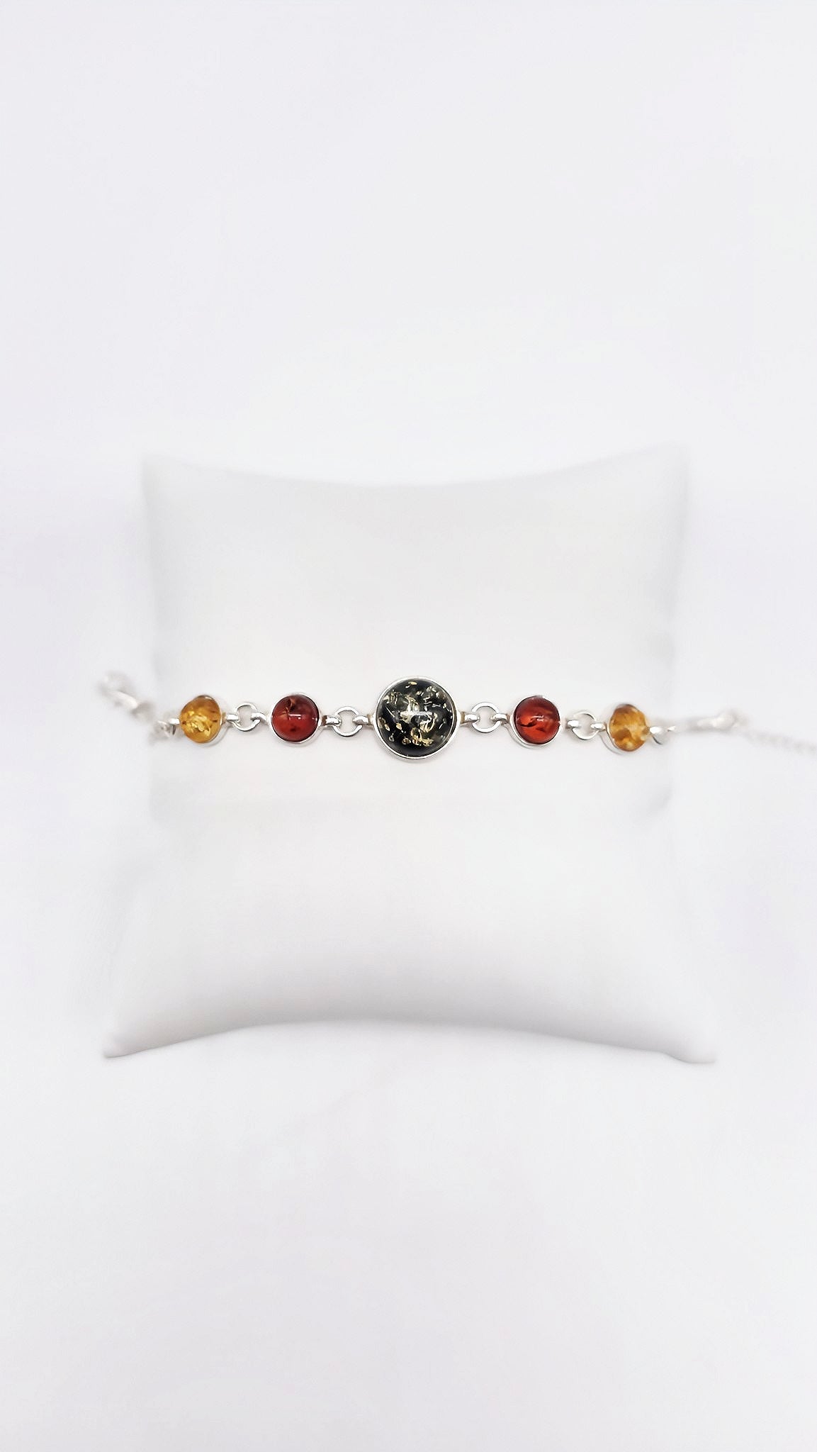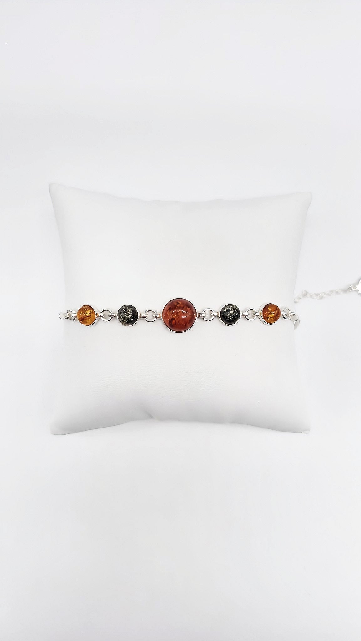 This exclusive amber bracelet combines natural elegance with modern design. The round amber stones in warm orange and elegant green are artfully set in 925 sterling silver, giving the bracelet a stylish look. With an adjustable length of 17.5 cm + 3 cm extension, the piece fits perfectly on the wrist. The high-quality lobster clasp ensures a secure fit. Ideal for women who love unique, high-quality jewelry—it's the perfect gift for birthdays, anniversaries, or special occasions.