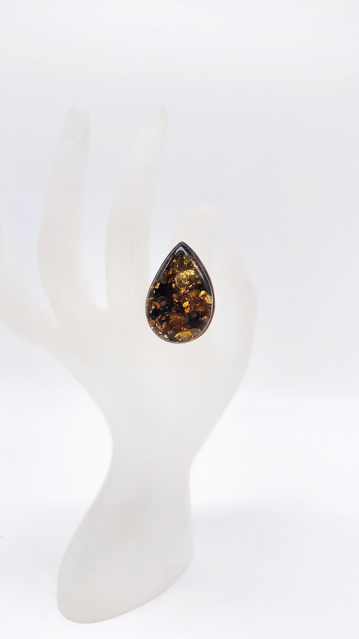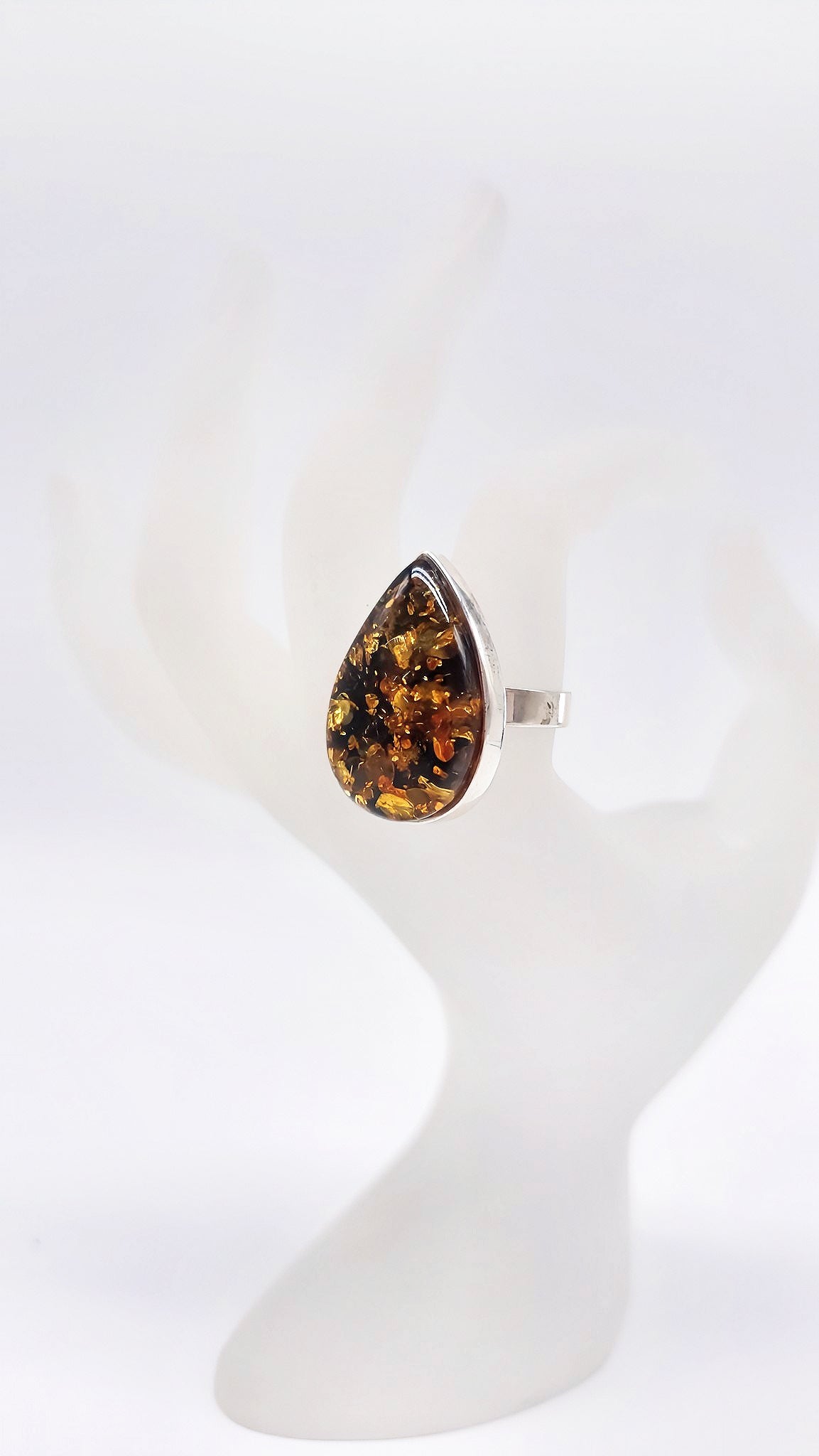 This handcrafted amber ring combines stylish elegance with natural beauty. The precious dark orange and green amber is set in a high-quality 925 sterling silver setting . The striking teardrop shape underscores the uniqueness of this piece of jewelry. Measuring 3 cm long, 2 cm wide, and 1 cm high, this ring is a statement piece for women who love exceptional jewelry. It's ideal as a gift for special occasions such as birthdays, anniversaries, or as a token of appreciation .