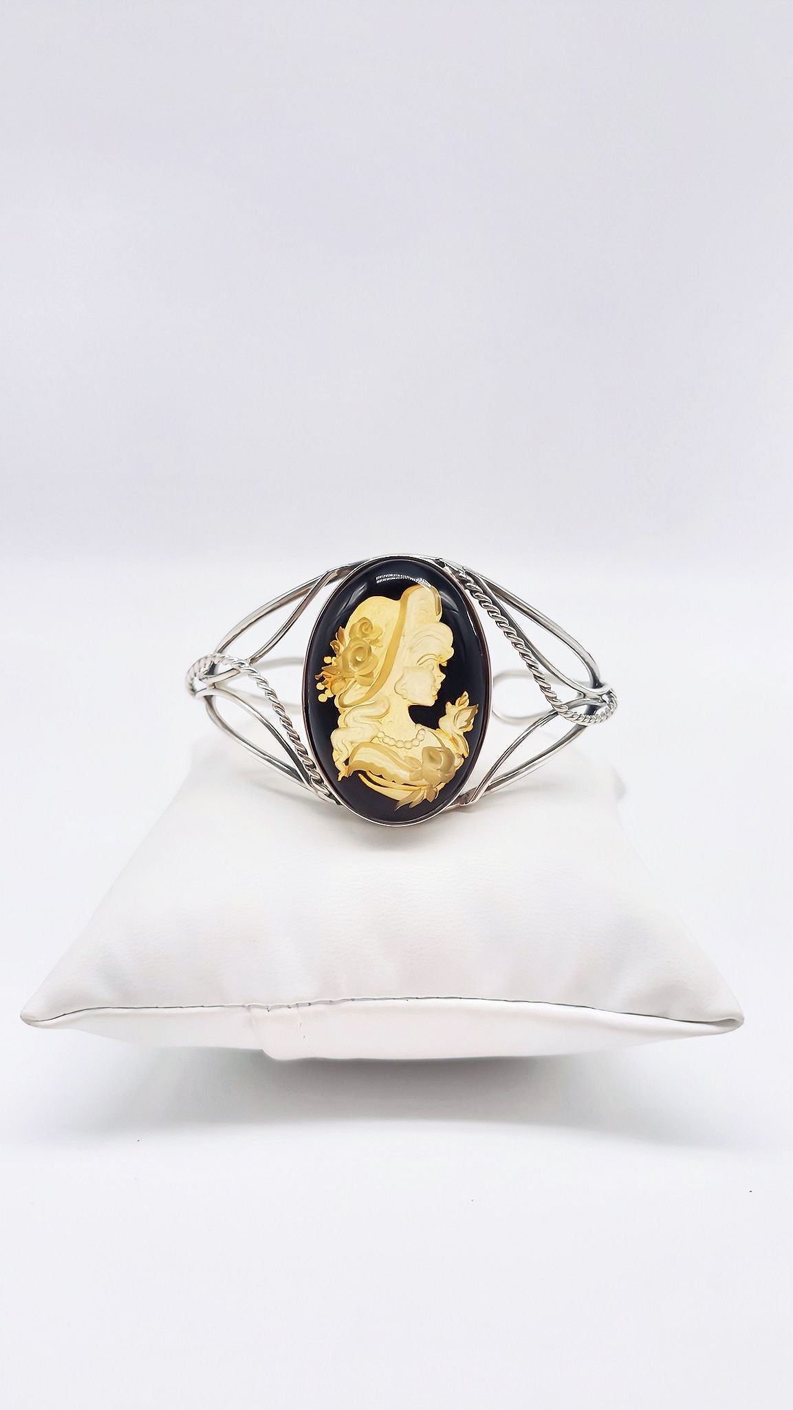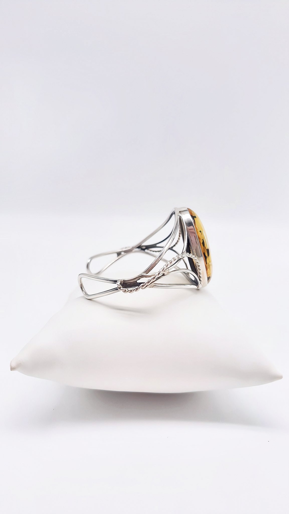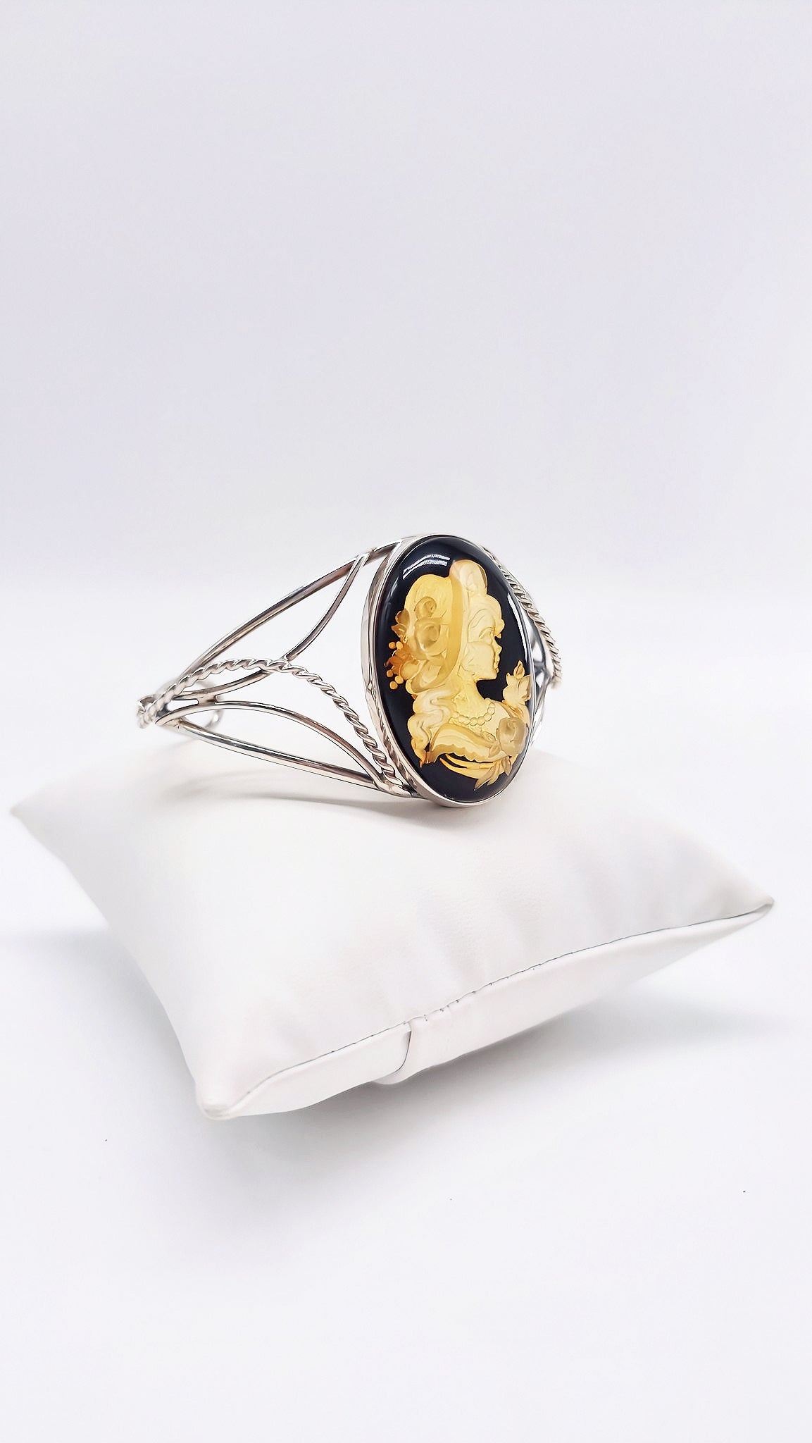 This handmade amber bangle combines natural beauty with sophisticated design. The finely engraved genuine amber is framed by a delicate 925 sterling silver setting , lending the piece a timeless elegance. Measuring 16 cm long, 4 cm wide, and 1 cm high, this bangle offers a perfect fit and exceptional comfort. A unique piece of jewelry for women who appreciate high-quality, artistic accessories—ideal as a gift for special occasions such as birthdays and anniversaries, or as a stylish addition to elegant outfits.