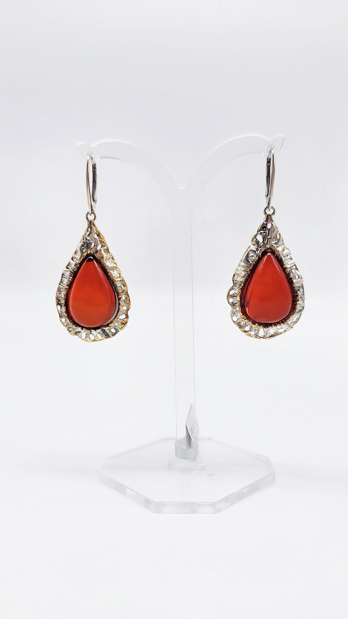 These elegant amber earrings with gold-plated accents combine natural beauty with luxurious design. The artfully crafted , teardrop-shaped red amber stones are set in a high-quality 925 sterling silver setting with gold-plated details . Measuring 5.3 cm long, 2.3 cm wide, and 0.5 cm high, these earrings are a stylish eye-catcher. Perfect for women who appreciate unique jewelry—they're ideal as gifts for birthdays, anniversaries, or elegant evening events.
