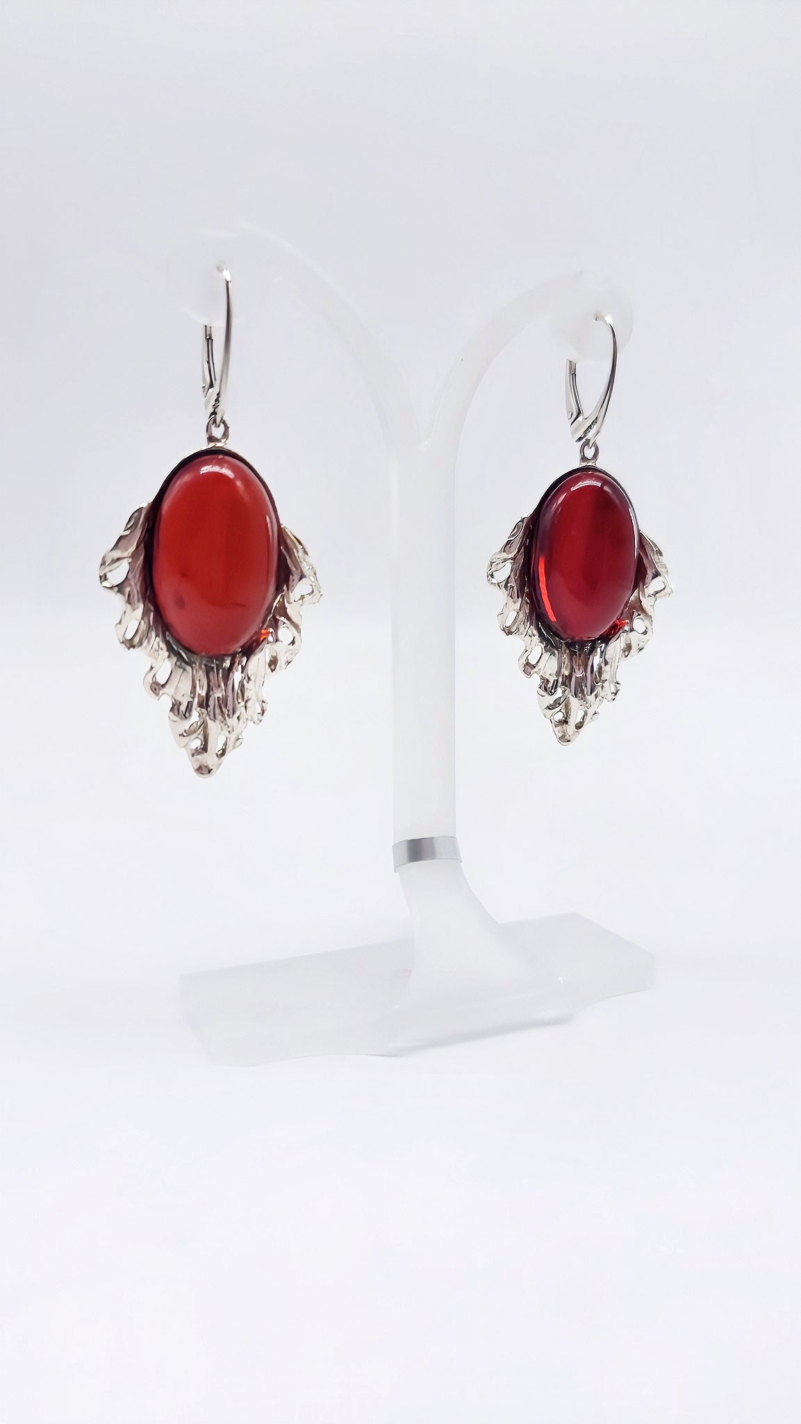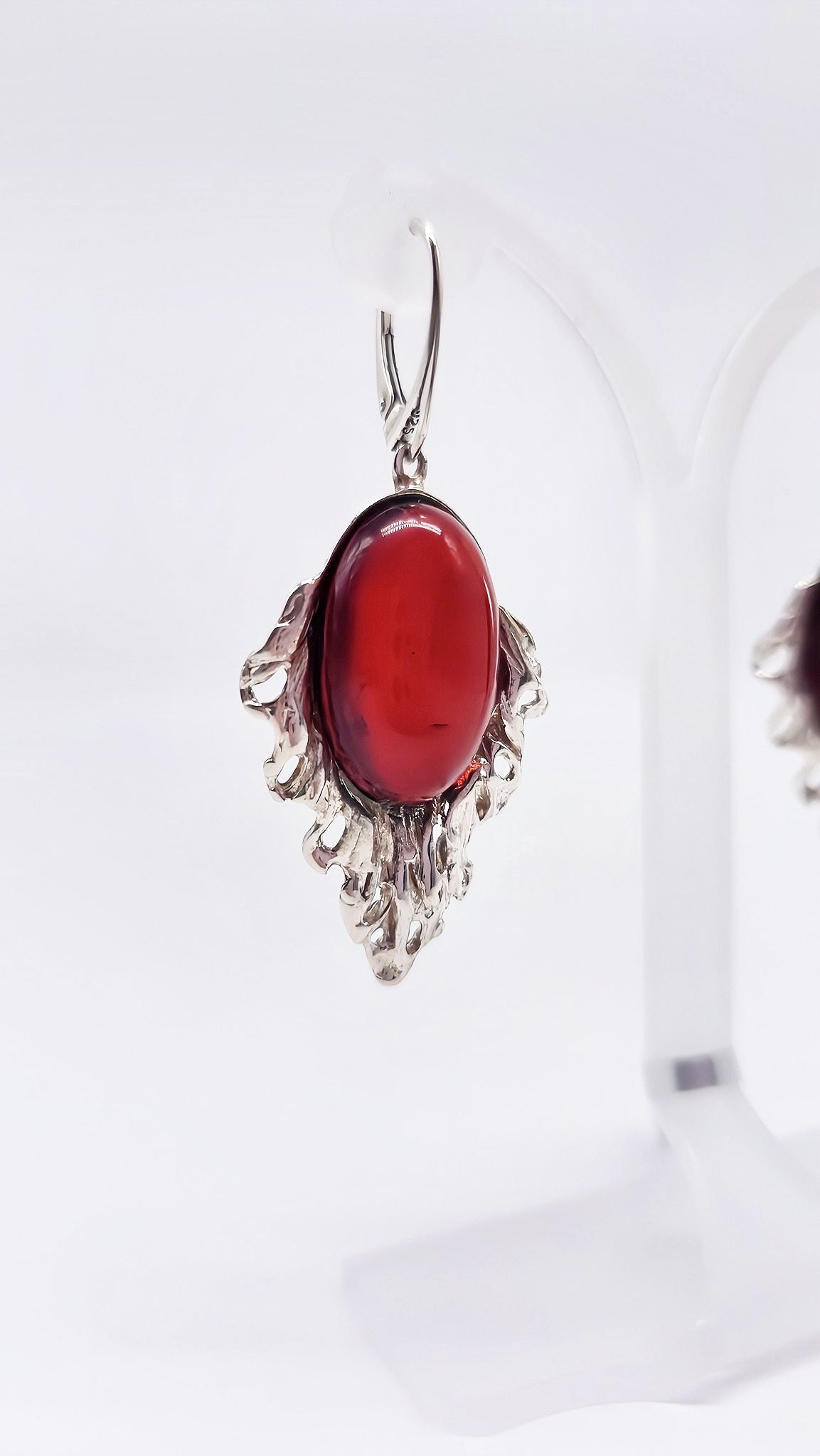 These exclusive 925 sterling silver earrings are a true statement piece. The deep red, wine-colored amber perfectly captures the light and creates an elegant radiance. The artistic silver setting gives the earrings an unusual shape that combines modern aesthetics with classic elegance. An ideal piece of jewelry for women who like to showcase themselves in style. Perfect as a luxurious gift or for special occasions.