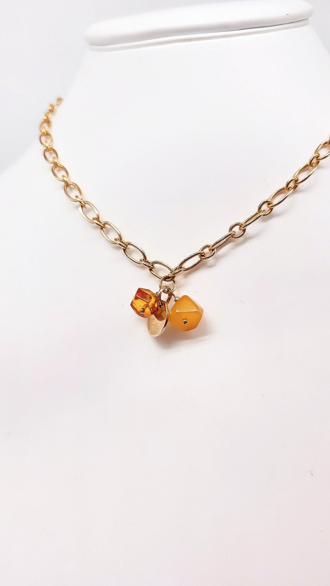 This elegant necklace made of gold-plated 925 sterling silver with genuine amber pendants combines modern design with natural beauty. The stylish link chain with warm gold tones and honey-colored amber adds a luxurious touch to any outfit. The chain measures 42 cm and is perfect for both elegant and casual looks. High-quality craftsmanship and a unique color scheme make it a wonderful gift for women with a sense of style and individuality.