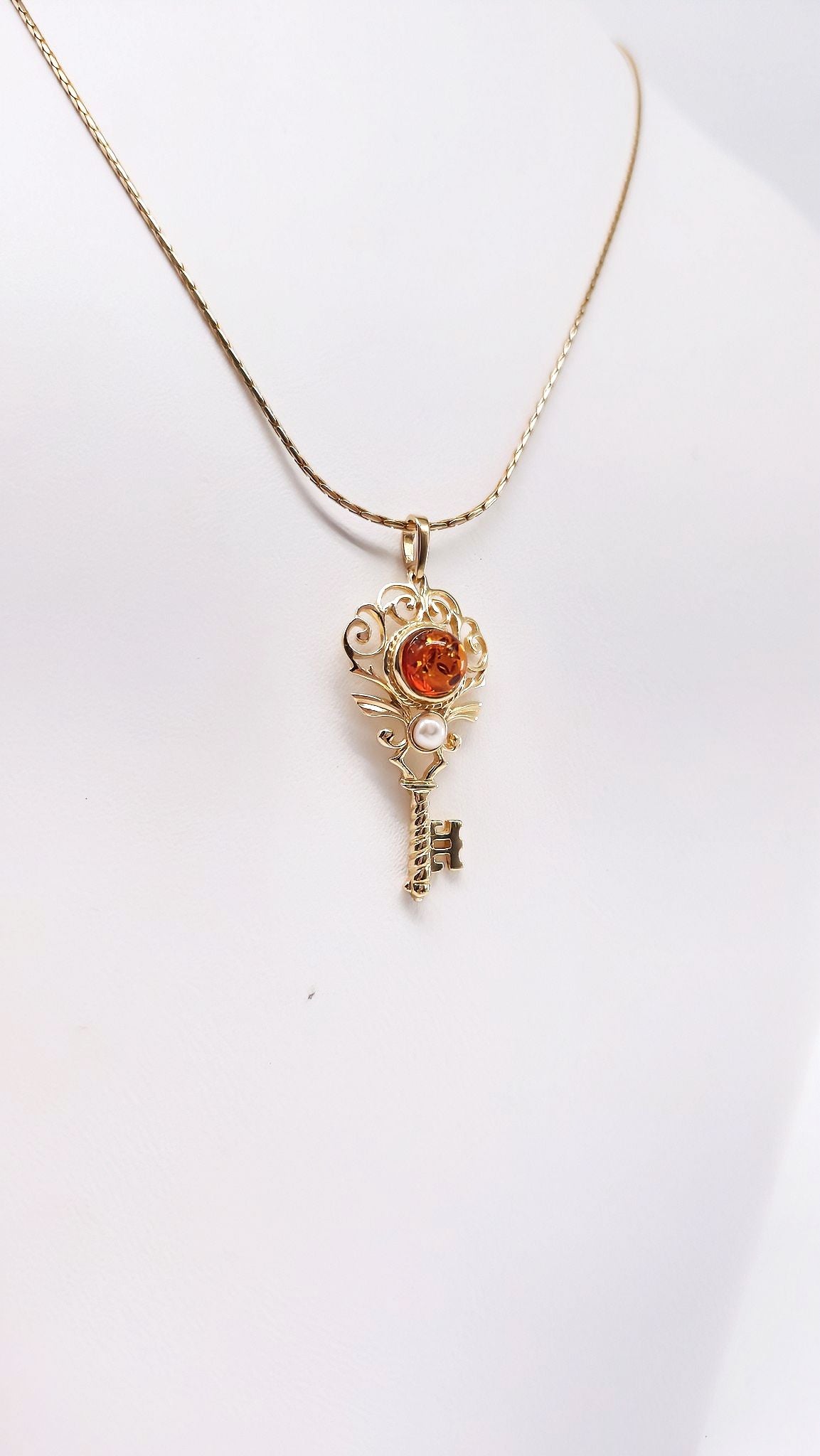 A unique pendant in the shape of a delicate key, crafted from gold-plated 925 sterling silver. The precious natural amber in a warm honey tone is complemented by a delicate pearl, lending the design a special elegance. The detailed craftsmanship makes this piece of jewelry a true eye-catcher. Perfect as a symbol of new paths or as a gift with deep meaning. The chain has a total length of 45 cm.