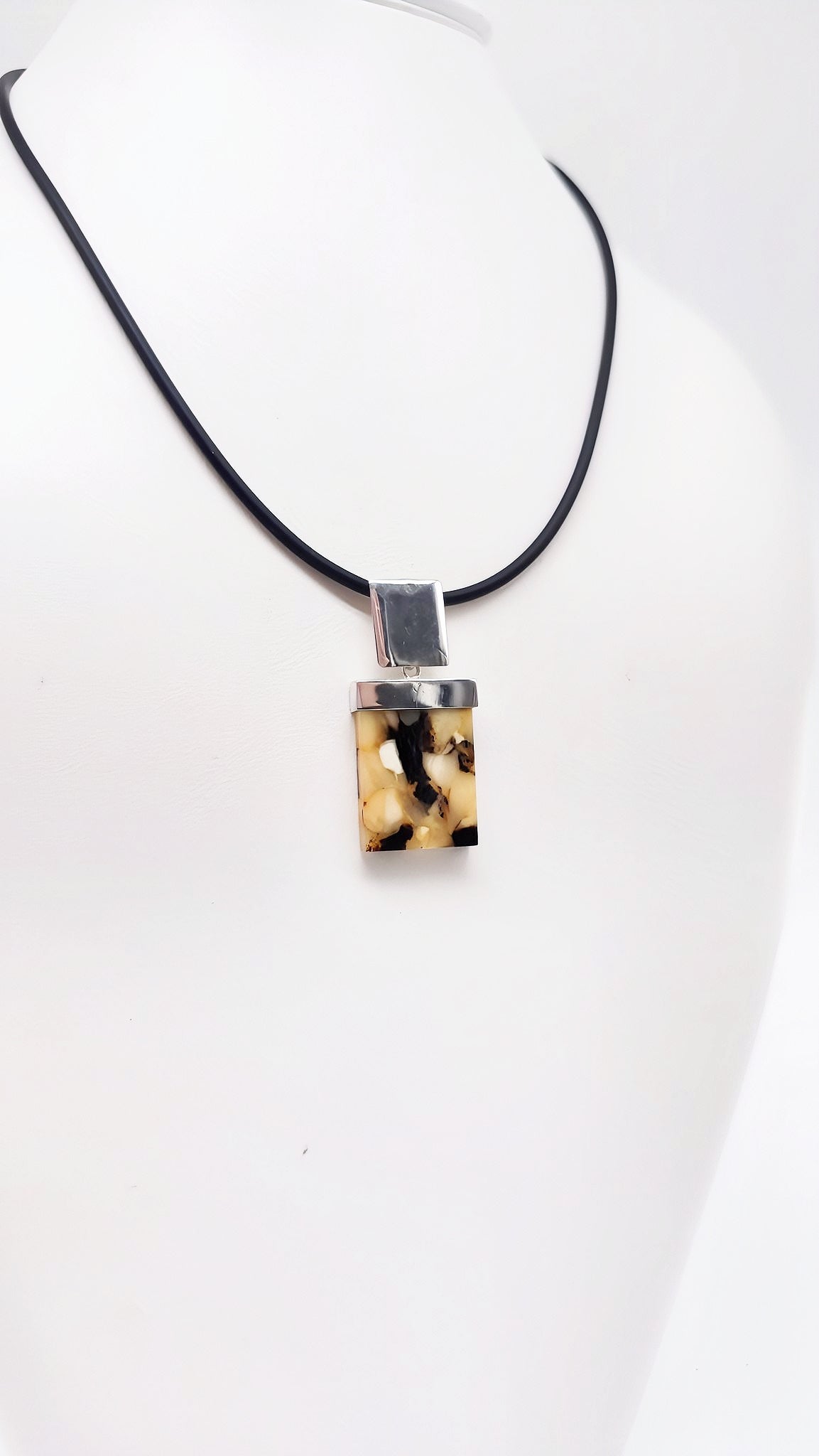 A striking pendant for men with a unique amber texture in black and white tones. Set in high-quality 925 sterling silver and combined with a robust rubber chain, this piece of jewelry creates a modern and masculine look. The special color structure of the natural amber makes each piece unique. Perfect for everyday wear or as a special gift.