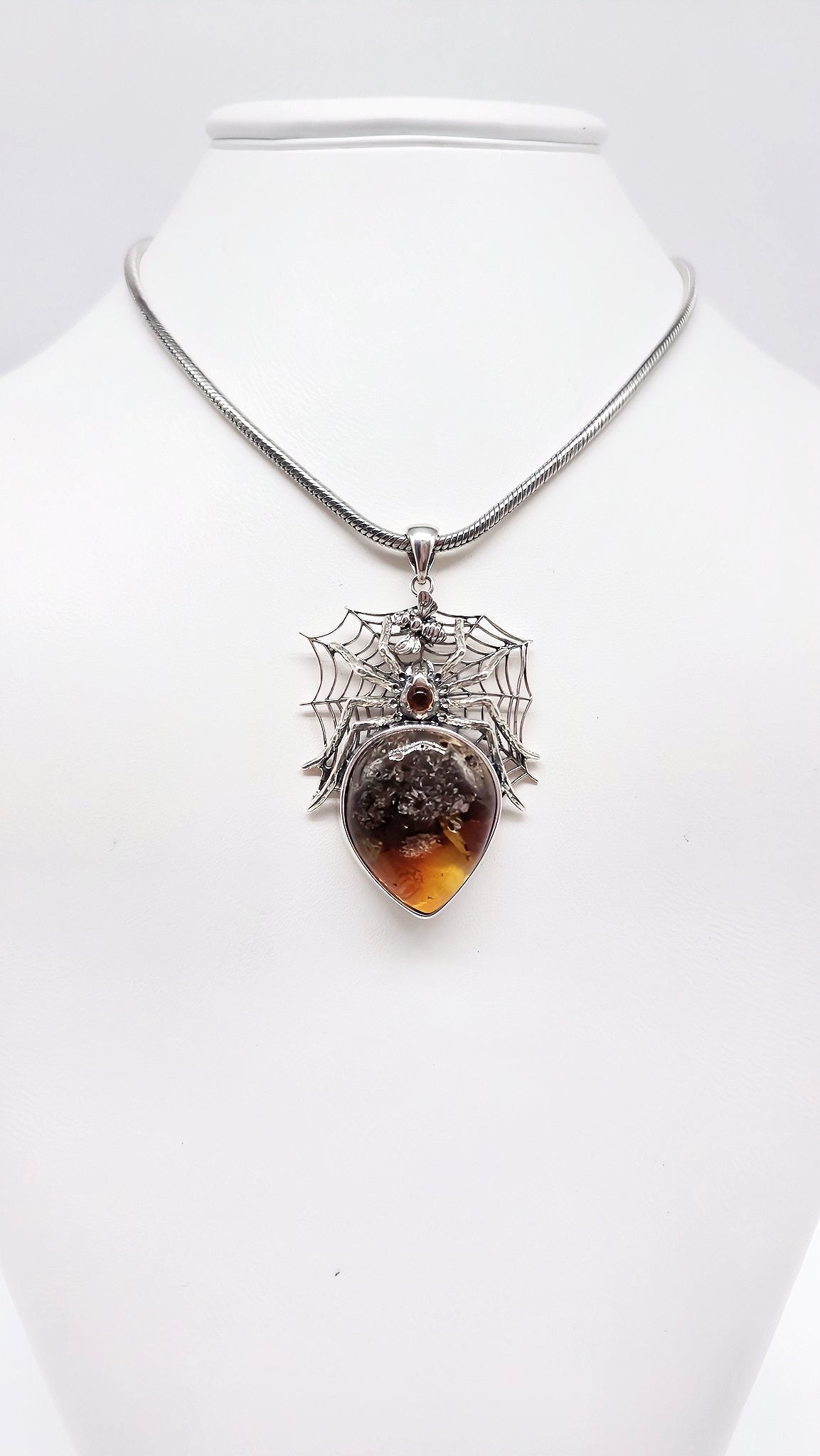 This unique spider pendant made of 925 sterling silver is a true statement piece. The delicate spider web design frames a fascinating, genuine amber with natural inclusions. An additional small garnet stone adds a touch of mystery. Measuring 7 cm long and 4 cm wide, this pendant is a true eye-catcher. Perfect for lovers of unusual jewelry and as a special gift.