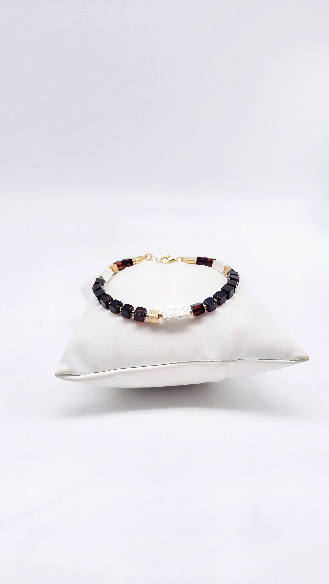 This elegant 925 sterling silver bracelet with wine-red amber and gold-plated accents combines high-quality materials with a stylish design. The small amber cubes in deep wine red harmonize perfectly with the lustrous silver and gold accents. The bracelet is 18 cm long and has a 3 cm extension for a custom fit. The lobster clasp ensures a secure fit. A timeless piece of jewelry for every occasion – stylish, elegant, and unique.