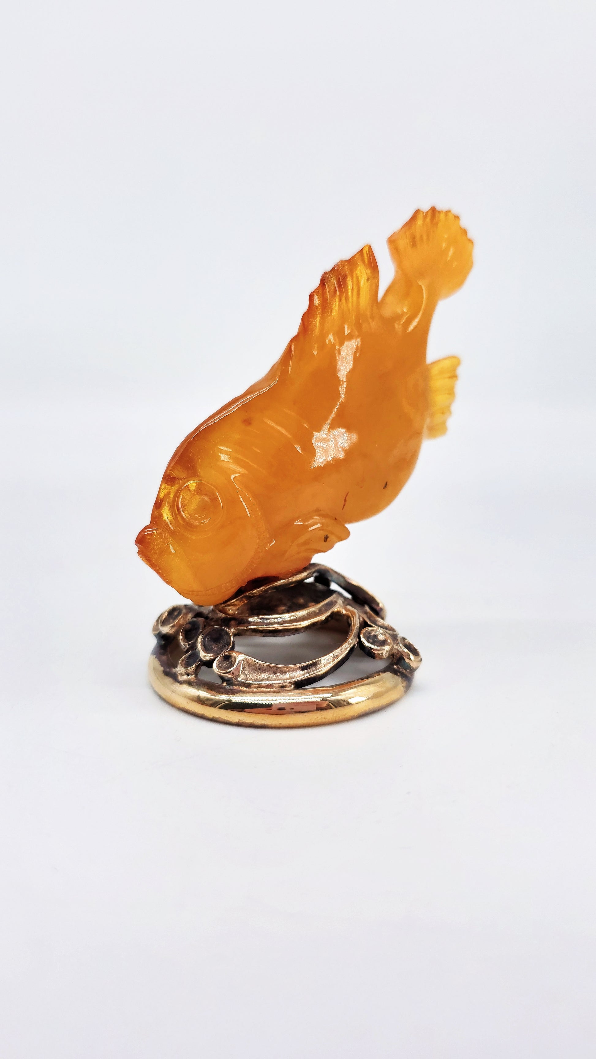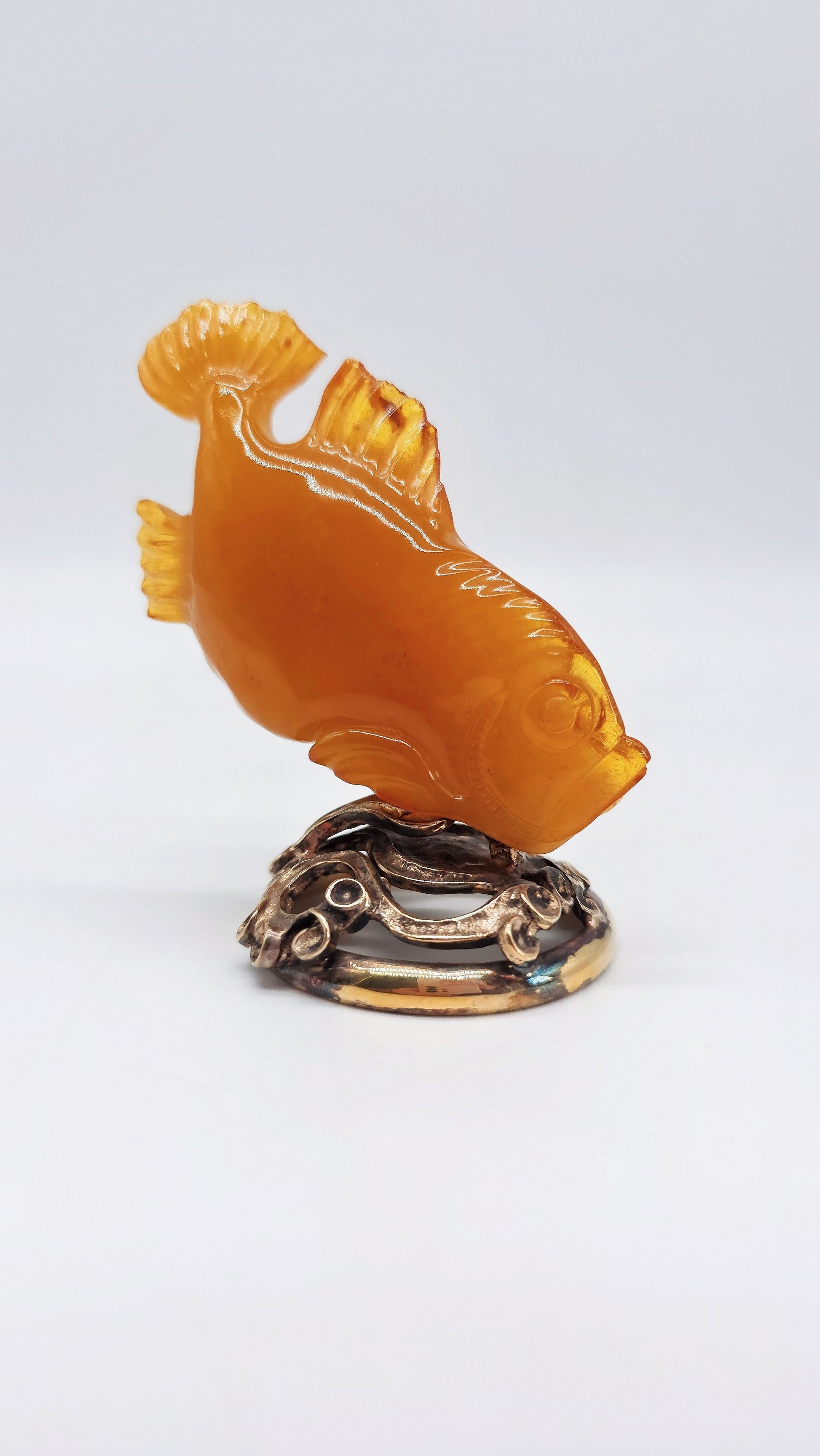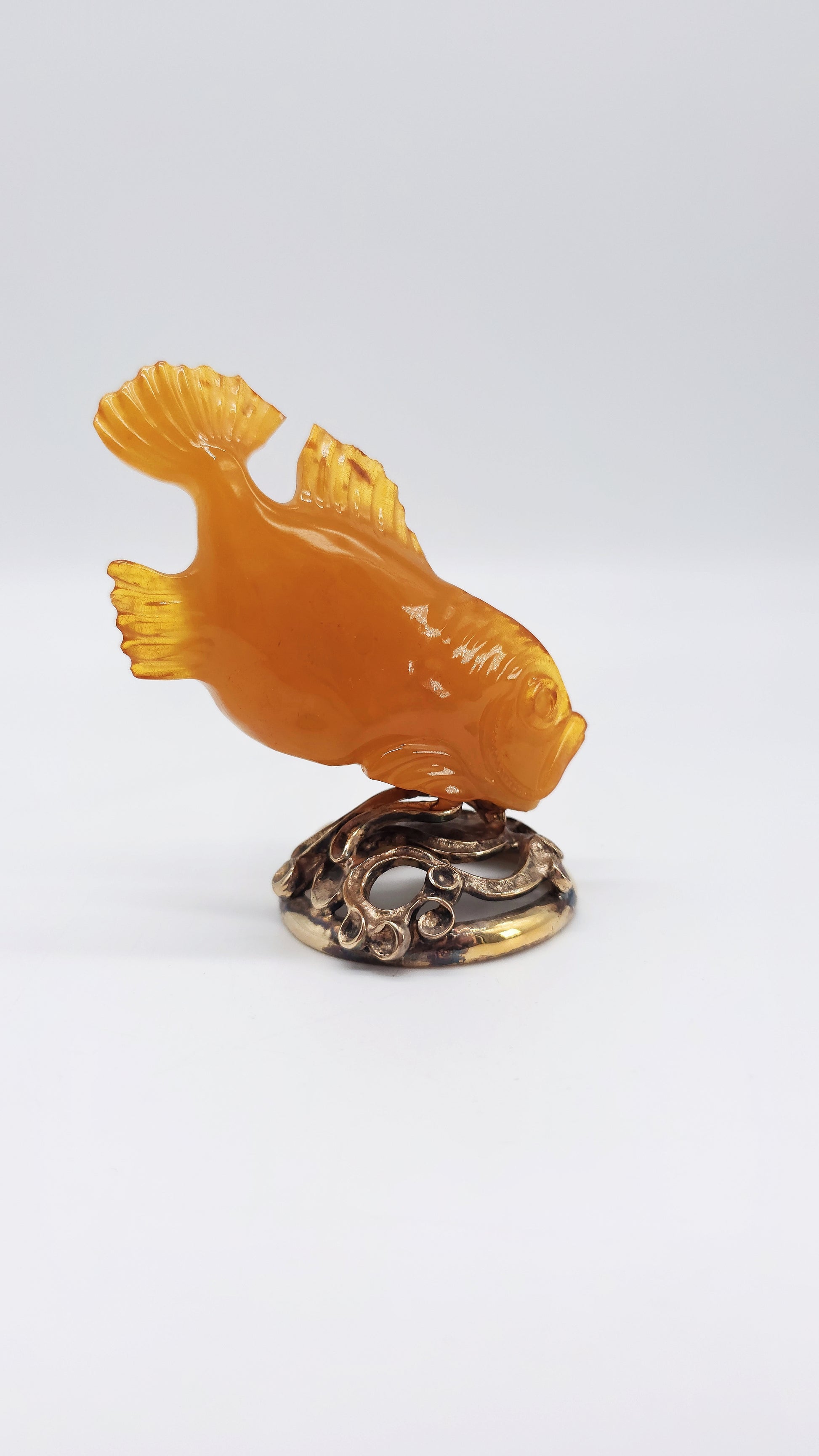 This hand-crafted amber figurine in the shape of a fish is a special work of art made from genuine Baltic amber . Measuring 9 cm x 8 cm x 2 cm, this figurine impresses with its fine details and warm, natural amber color. The fish symbolizes luck, protection and prosperity and is not only a unique collector's item , but also a powerful talisman for success and harmony . In many cultures, the fish stands for abundance and luck , which is why this elegant amber animal figurine is a meaningful gift idea for special occasions . Perfect as a stylish decoration, amulet or souvenir , this figurine brings positive energy into your home. Order your hand-carved amber fish figurine now and secure yourself a unique piece of natural art.