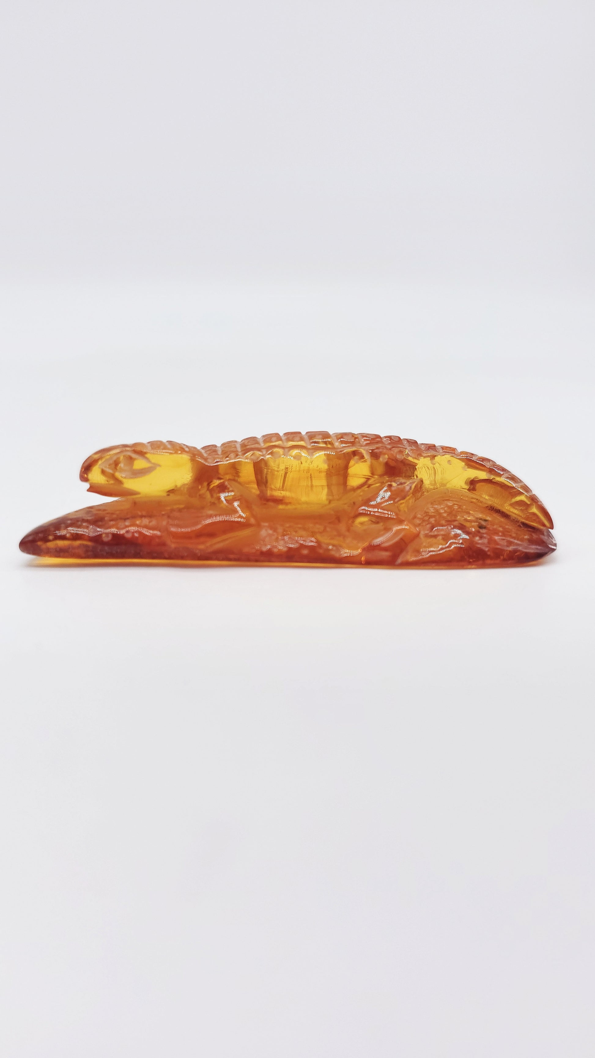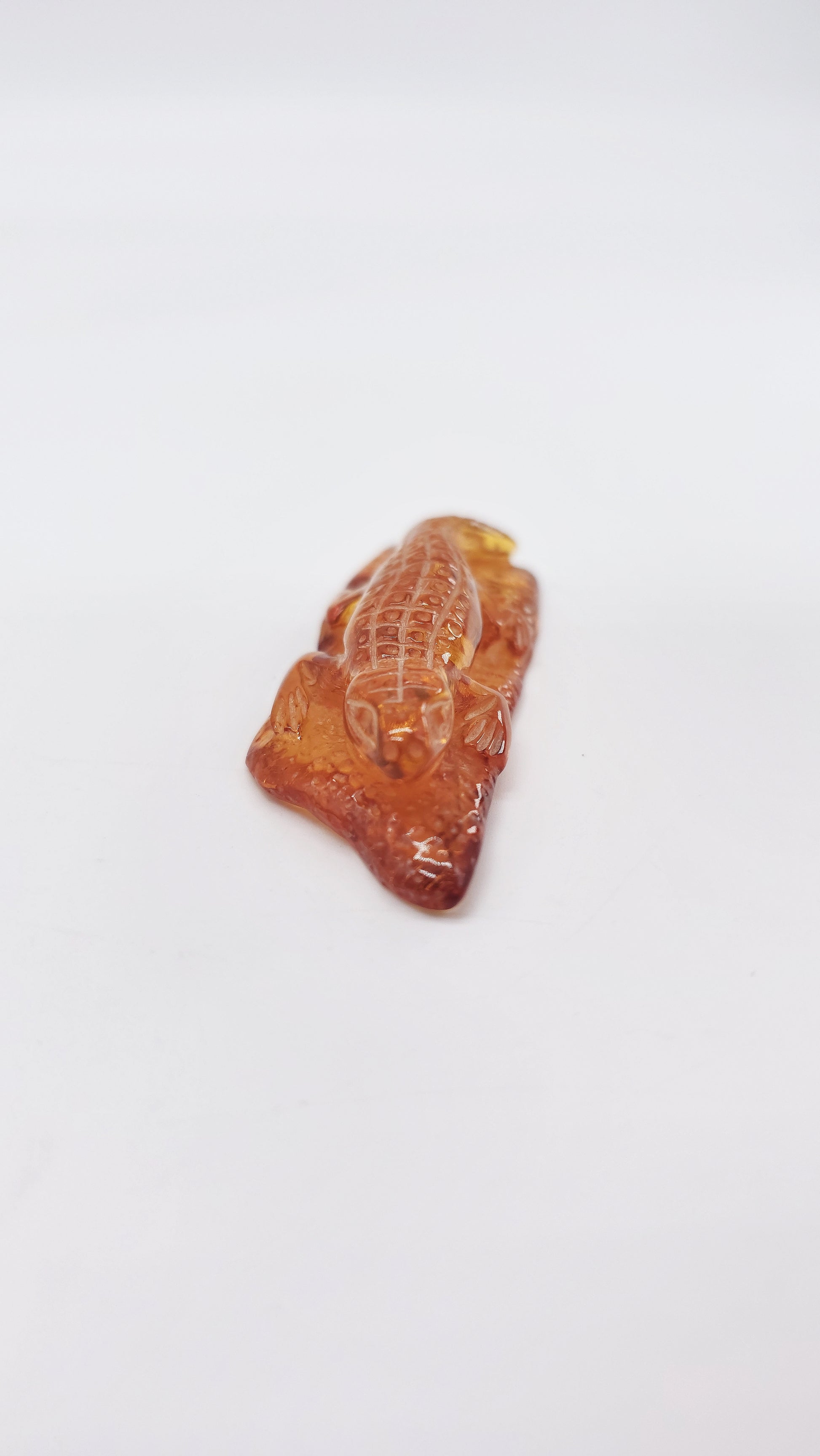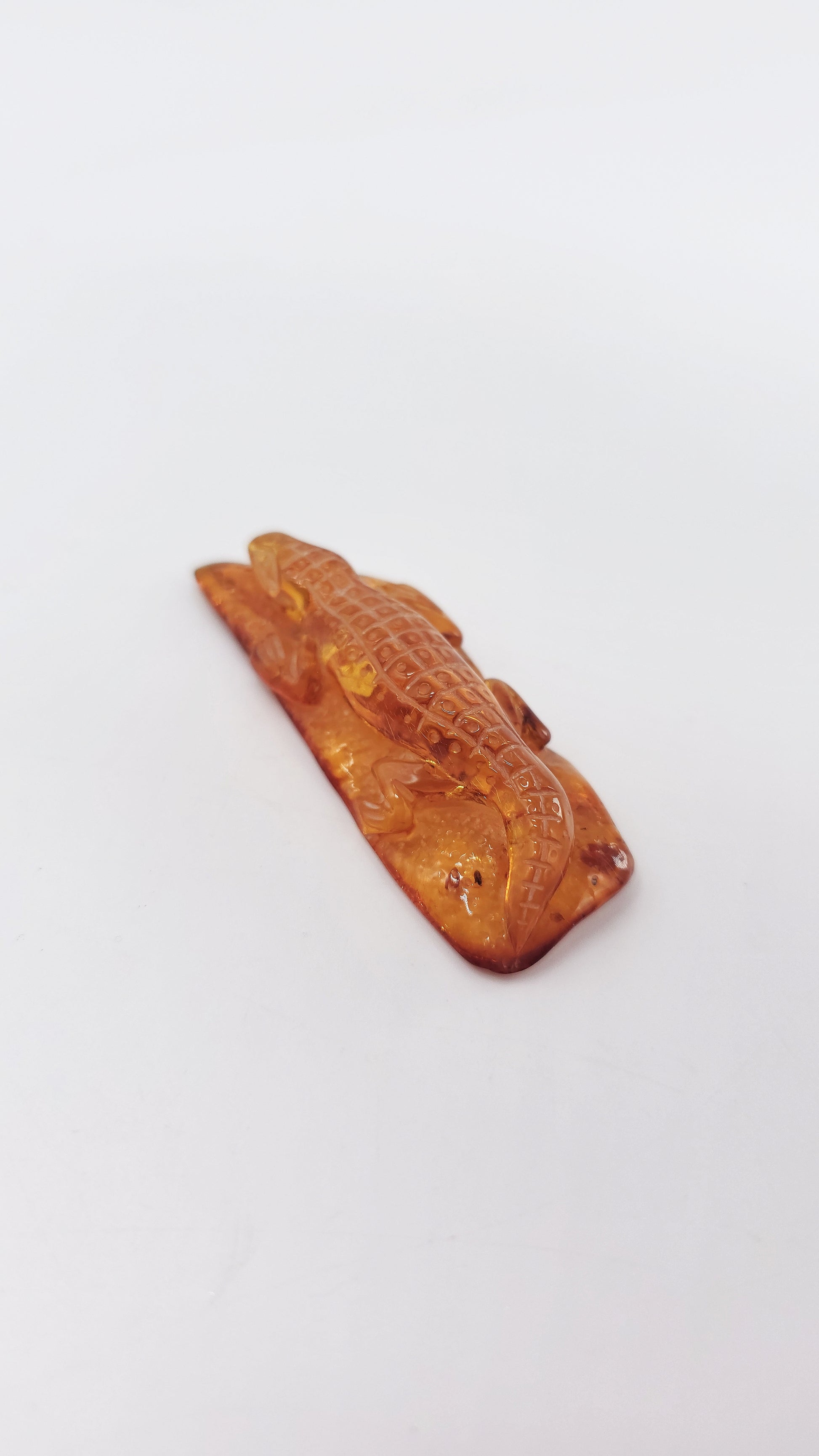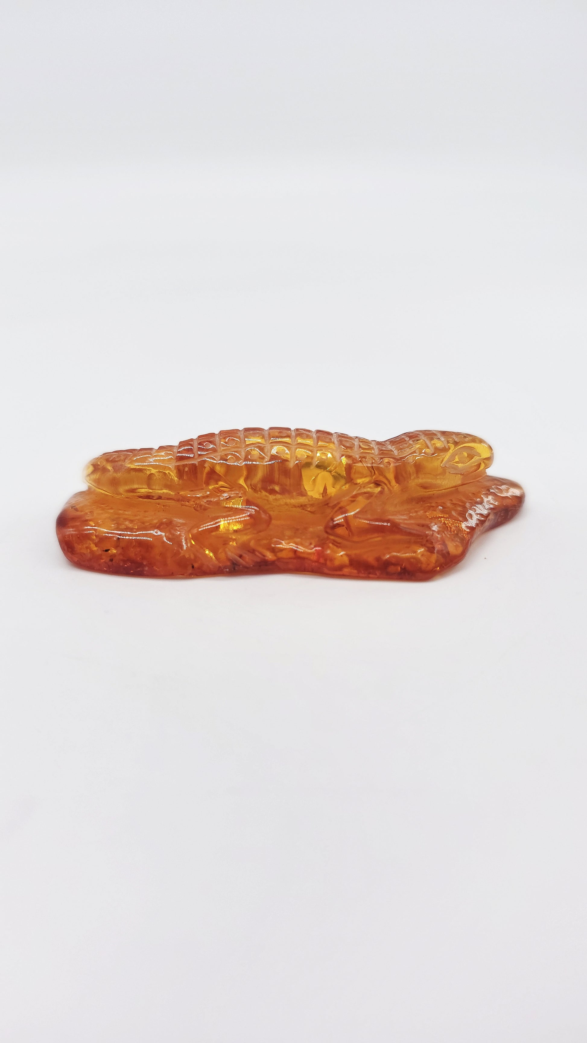 This handcrafted amber figurine in the shape of a lizard is an exceptional work of art made from genuine Baltic amber . Measuring 6.5 cm x 2.5 cm x 2.5 cm and boasting a unique natural amber color, the lizard symbolizes flexibility, renewal, and intuition . In many cultures, it is associated with adaptability, survival, and the ability to transform . Its power of regeneration makes it a powerful symbol of new beginnings and change . This precious amber animal figurine is ideal as an amulet for protection, spiritual development, or as a decorative collector's item . Order your hand-carved amber lizard figurine now and bring meaningful symbolism into your life.